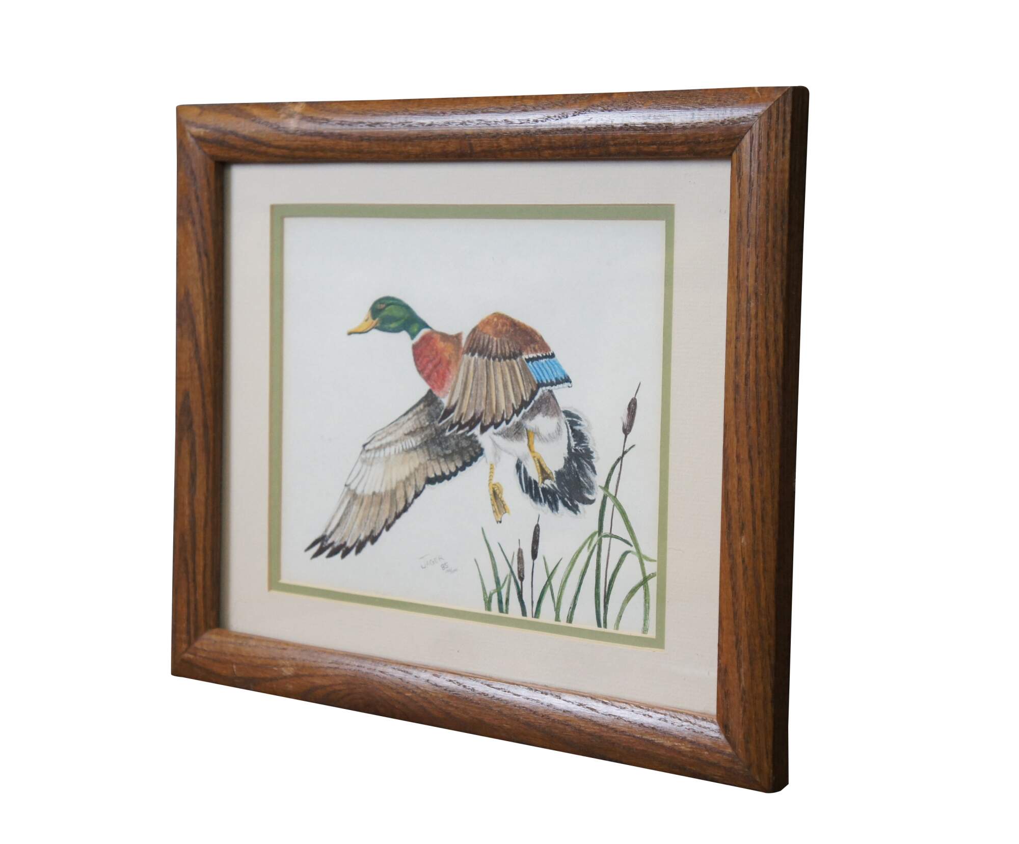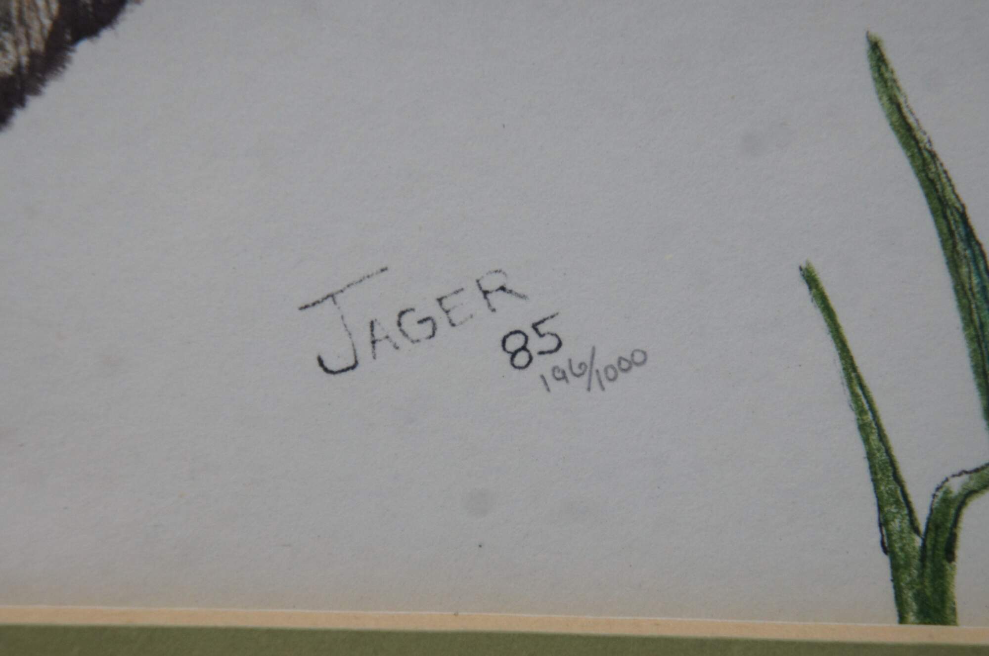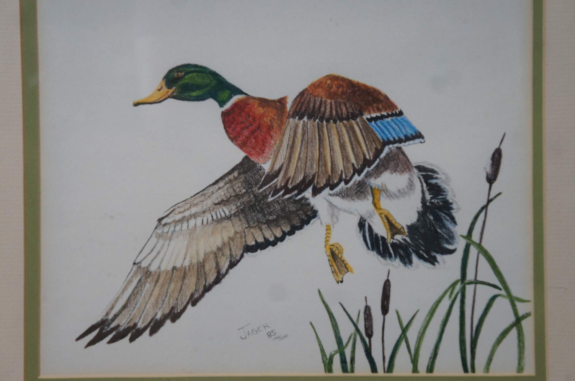 Late 20th century lithograph print of a brightly colored mallard taking flight over cattails. Signed in plate Jager 85. Pencil numbered 96/1000. Wood frame; white and green layered mat. Hunting.