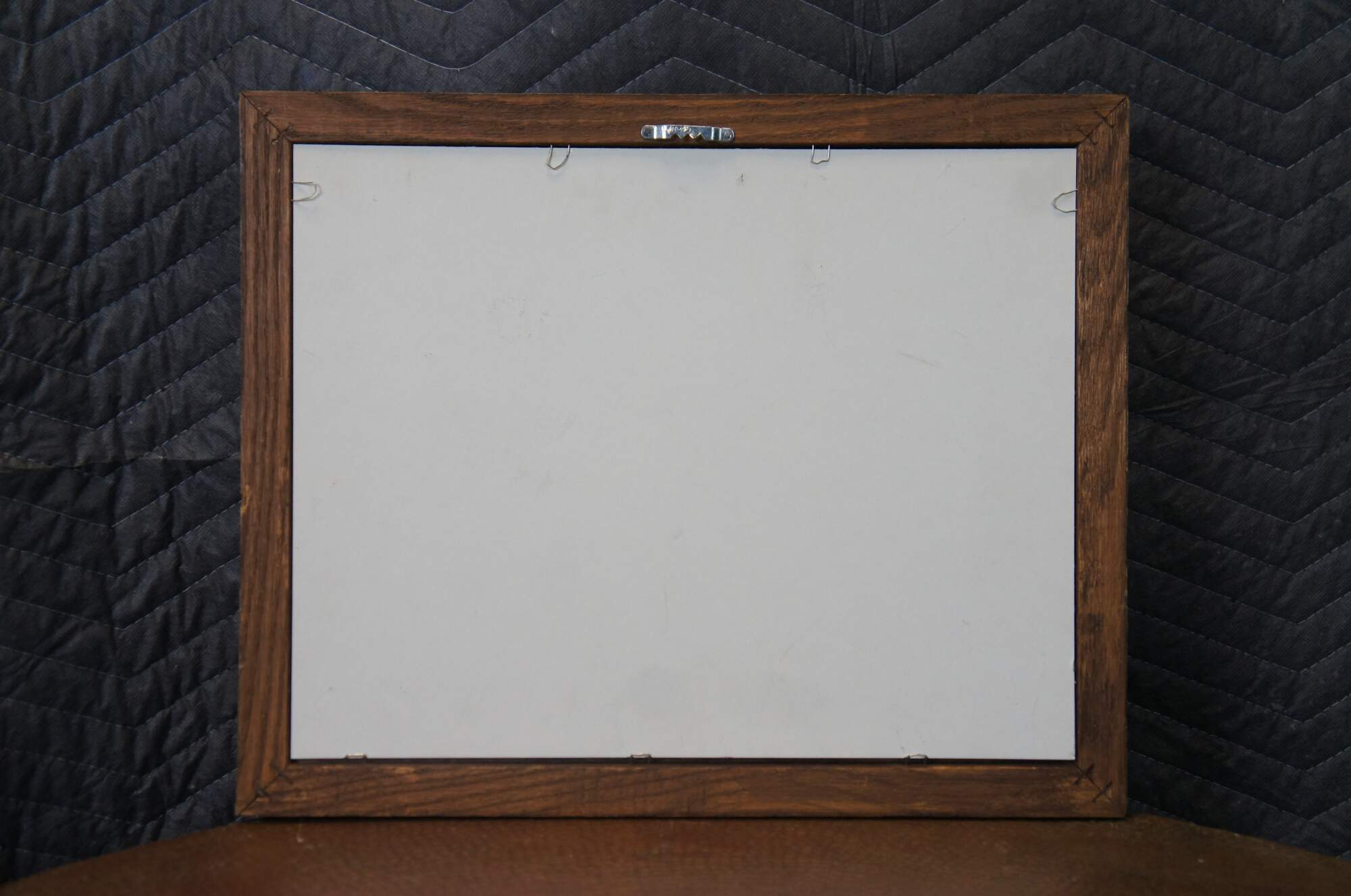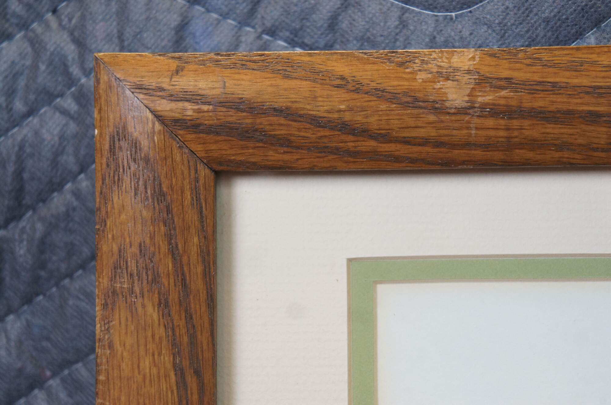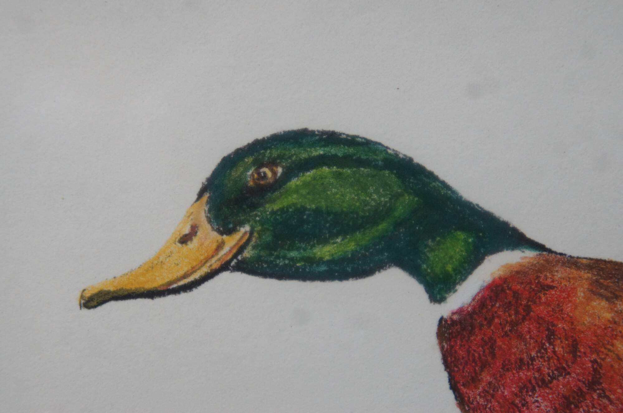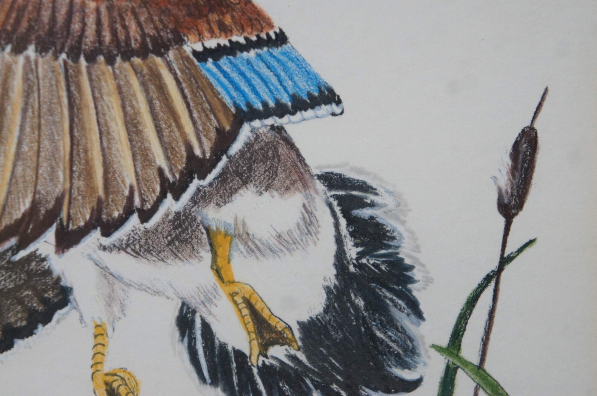 Late 20th century lithograph print of a brightly colored mallard taking flight over cattails. Signed in plate Jager 85. Pencil numbered 96/1000. Wood frame; white and green layered mat. Hunting.
