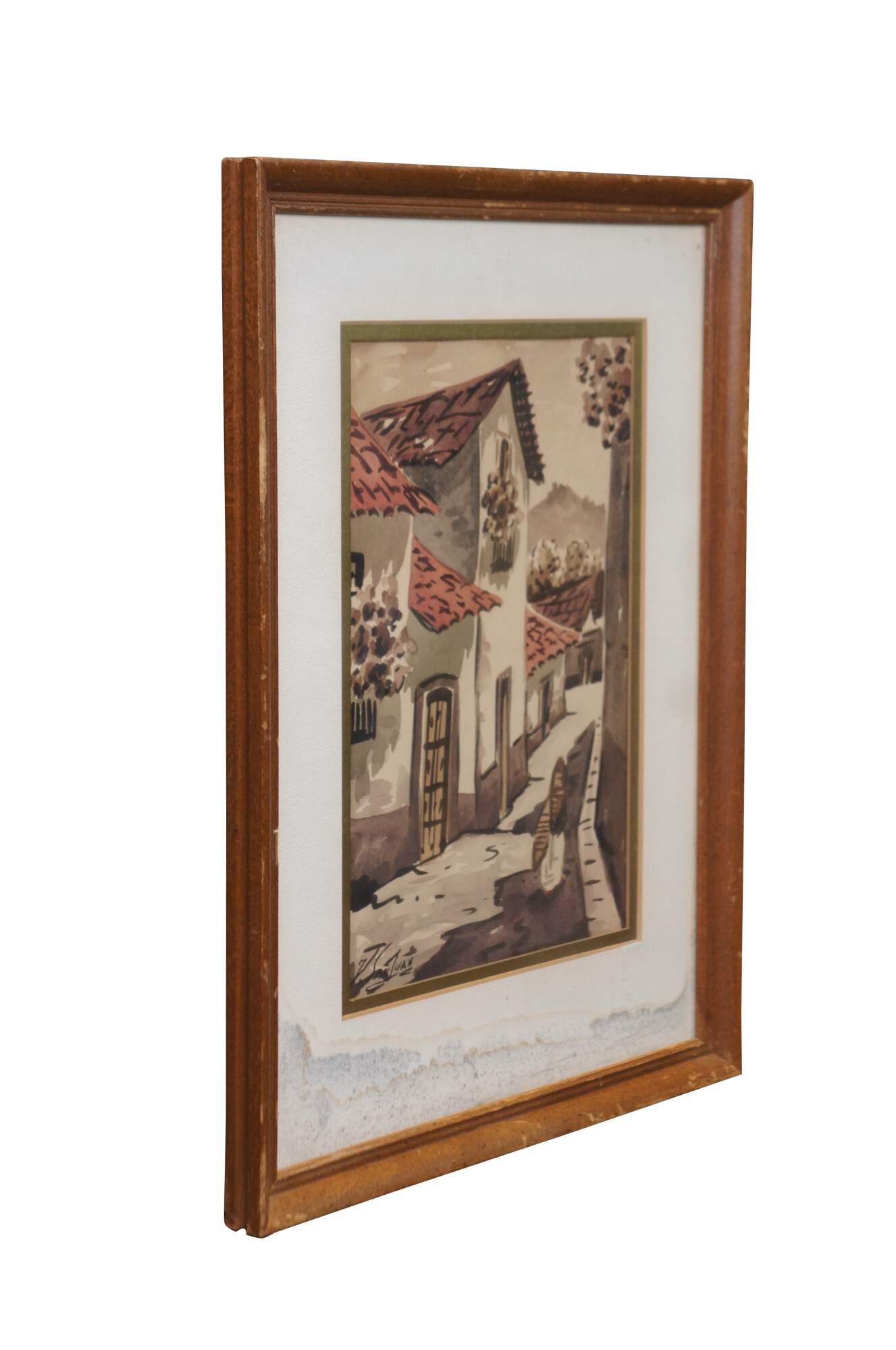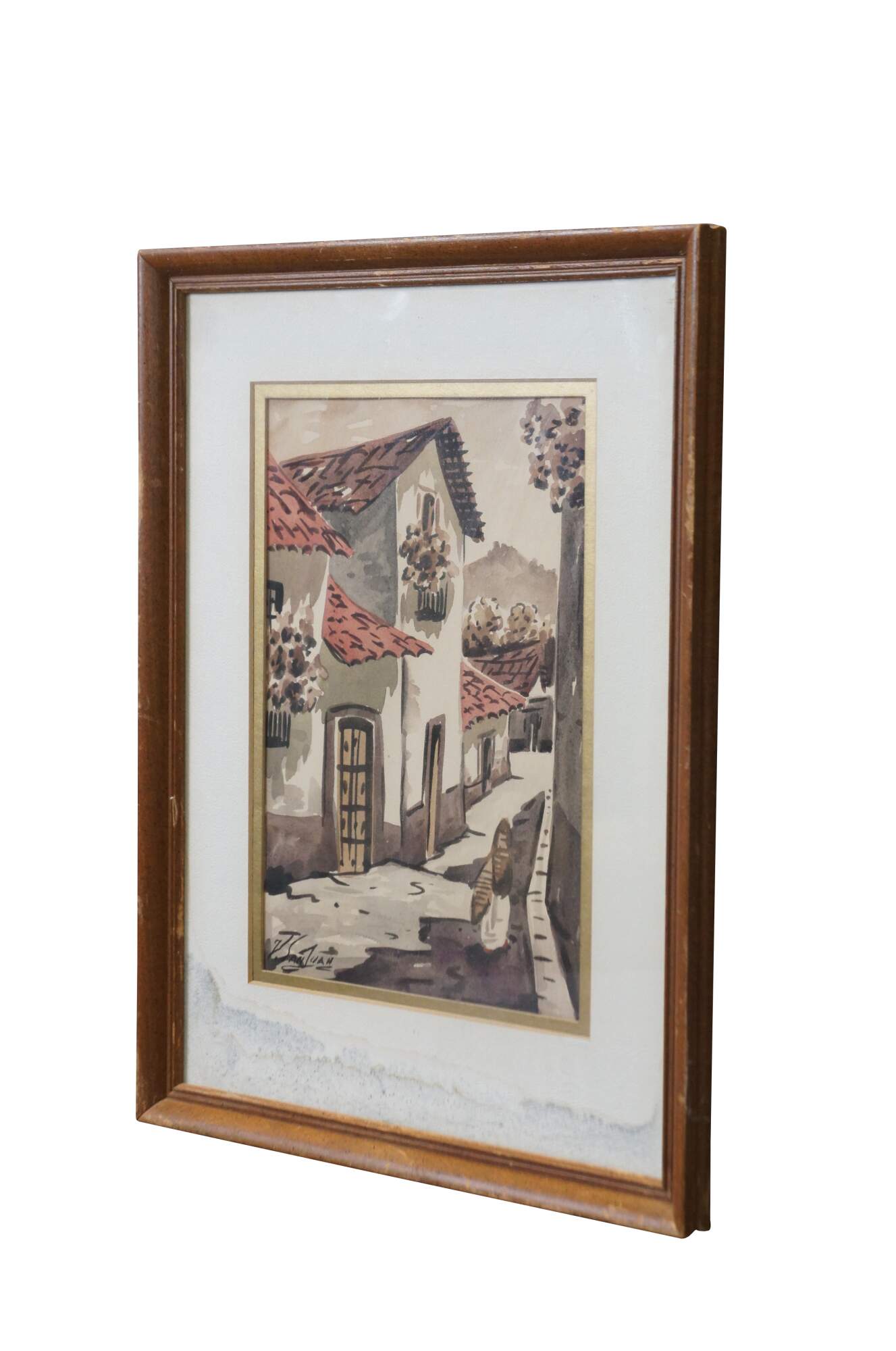 Mid to late 20th century original watercolor painting showing a cityscape / street scene with figure walking down a neighborhood filled with red tiled roof stucko houses. Beveled wood frame; white and gold layered mat.
