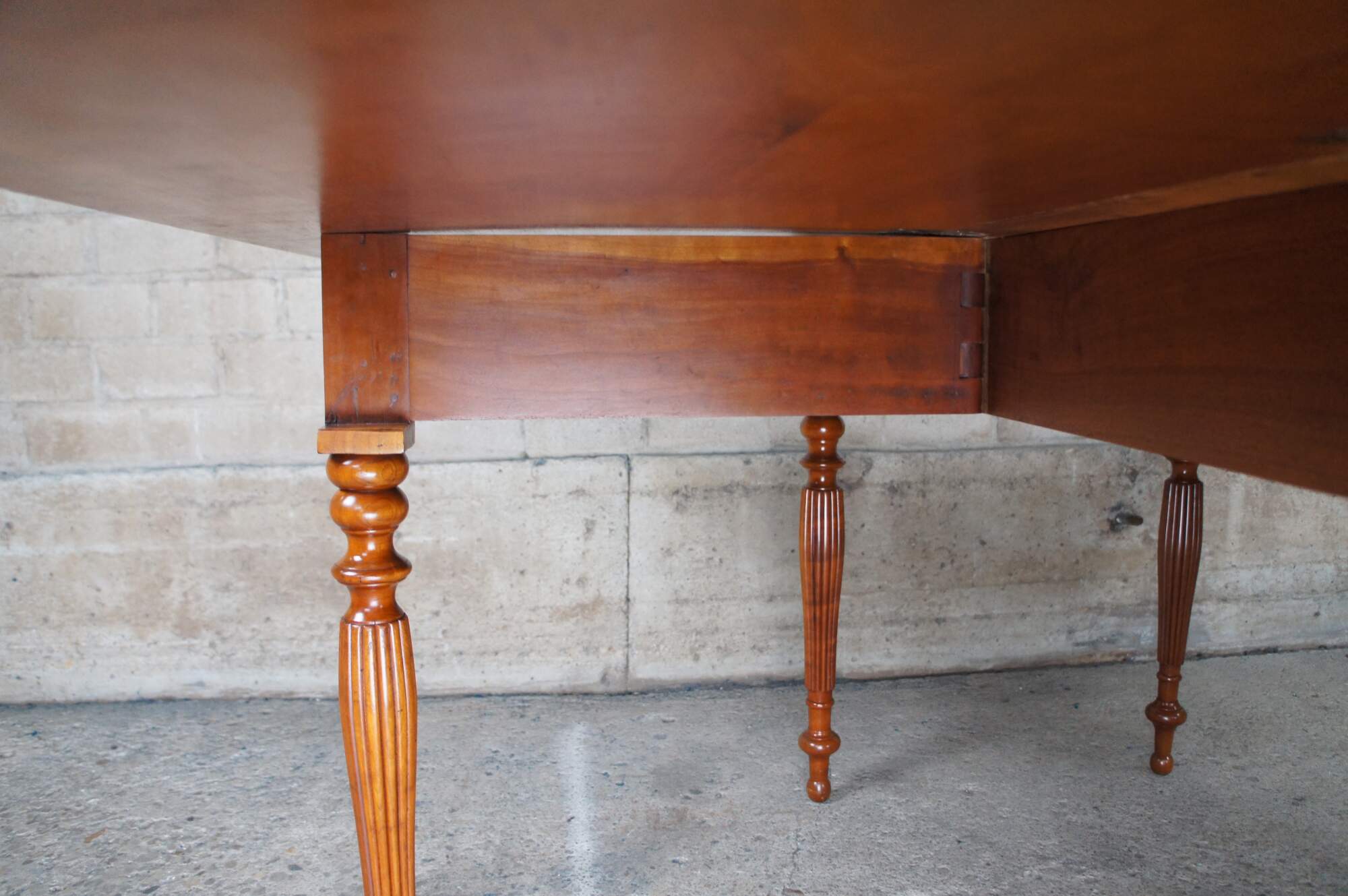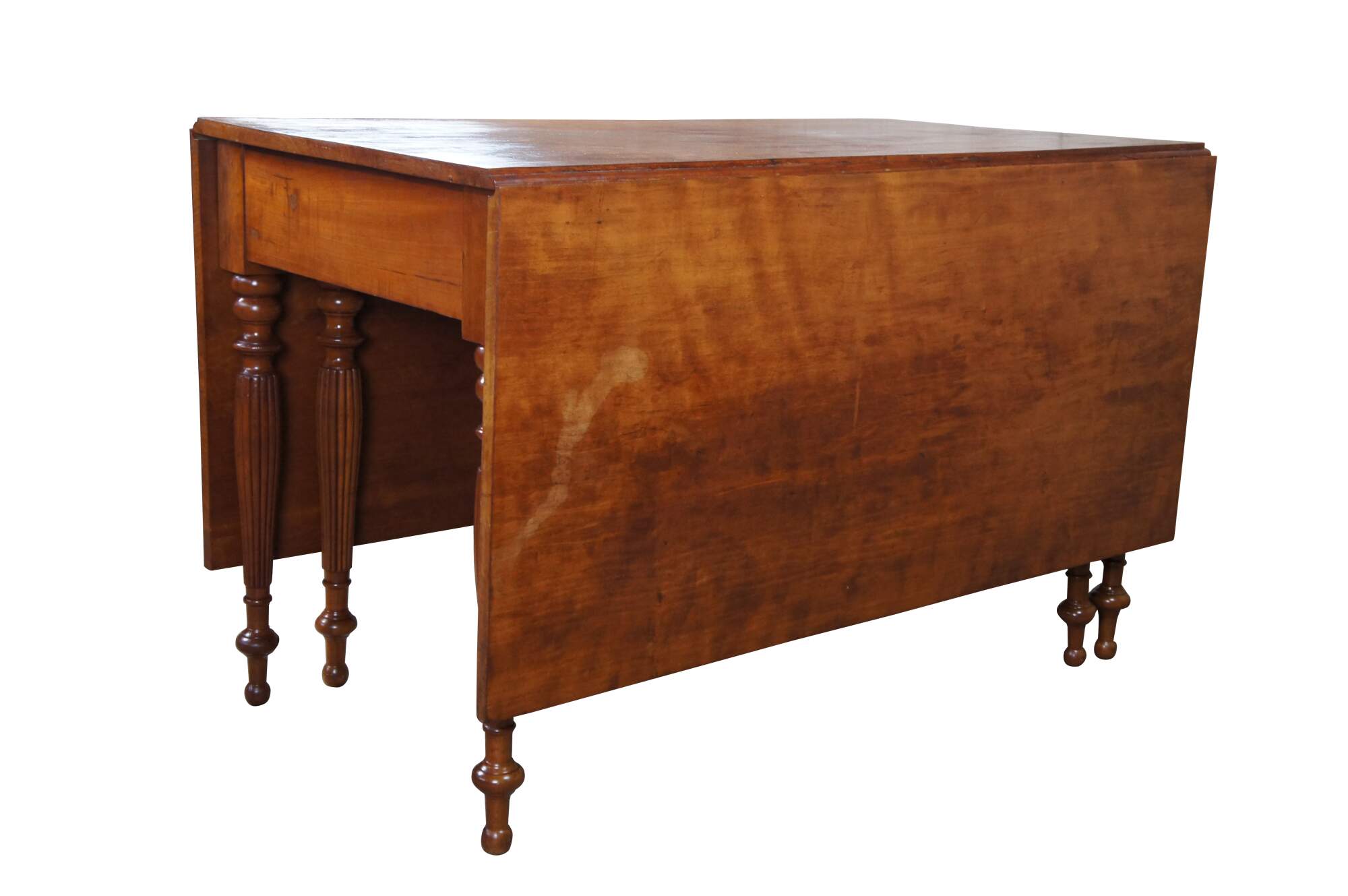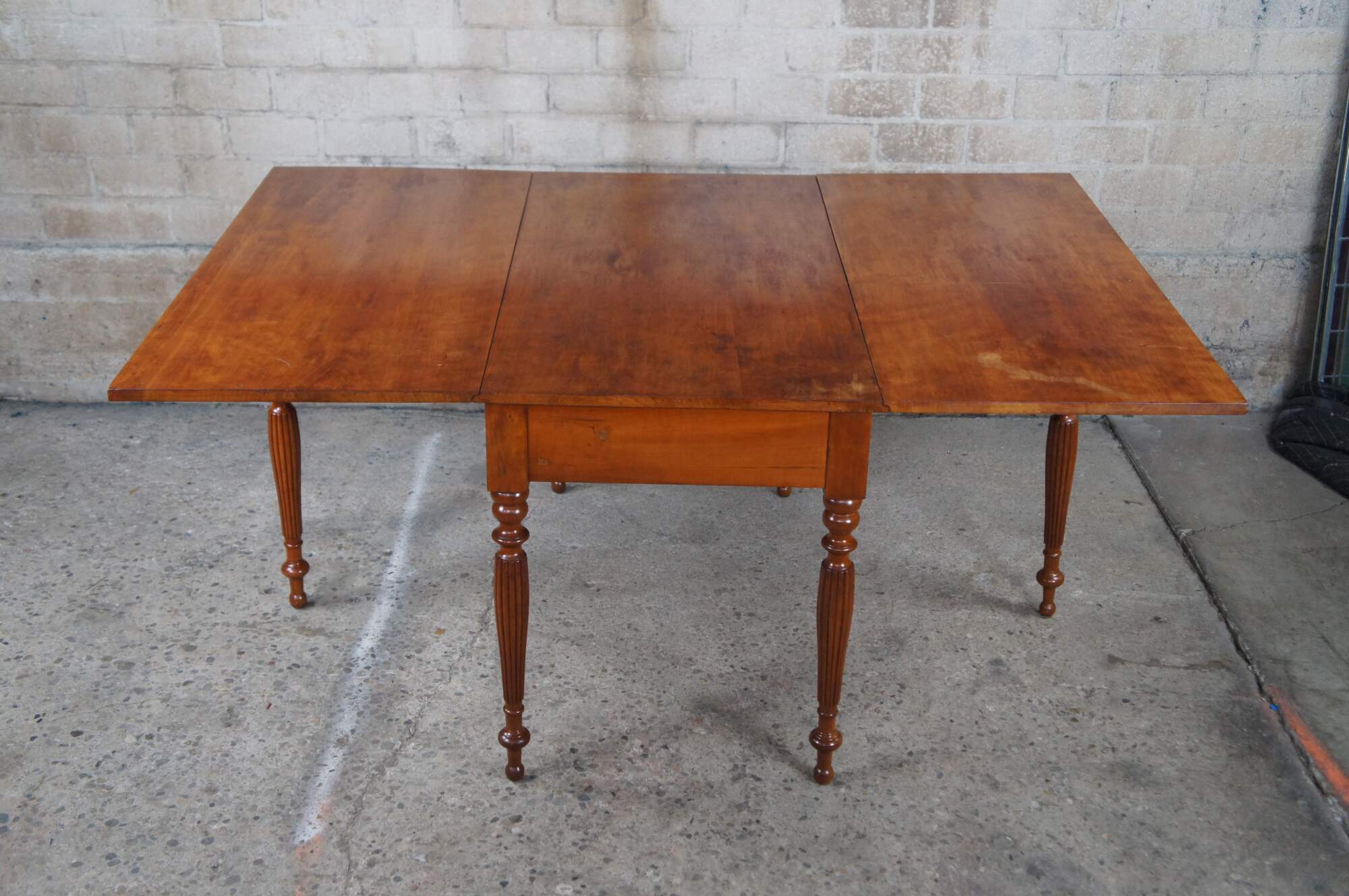 An equisite early 19th century American Sheraton gateleg dining table. Features a rectangular form with long drop leaves made from solid cherry. The table is supported by turned and reeded legs leading to toupie shaped feet. Great for use as breakfast table or against a wall as an entry console table.