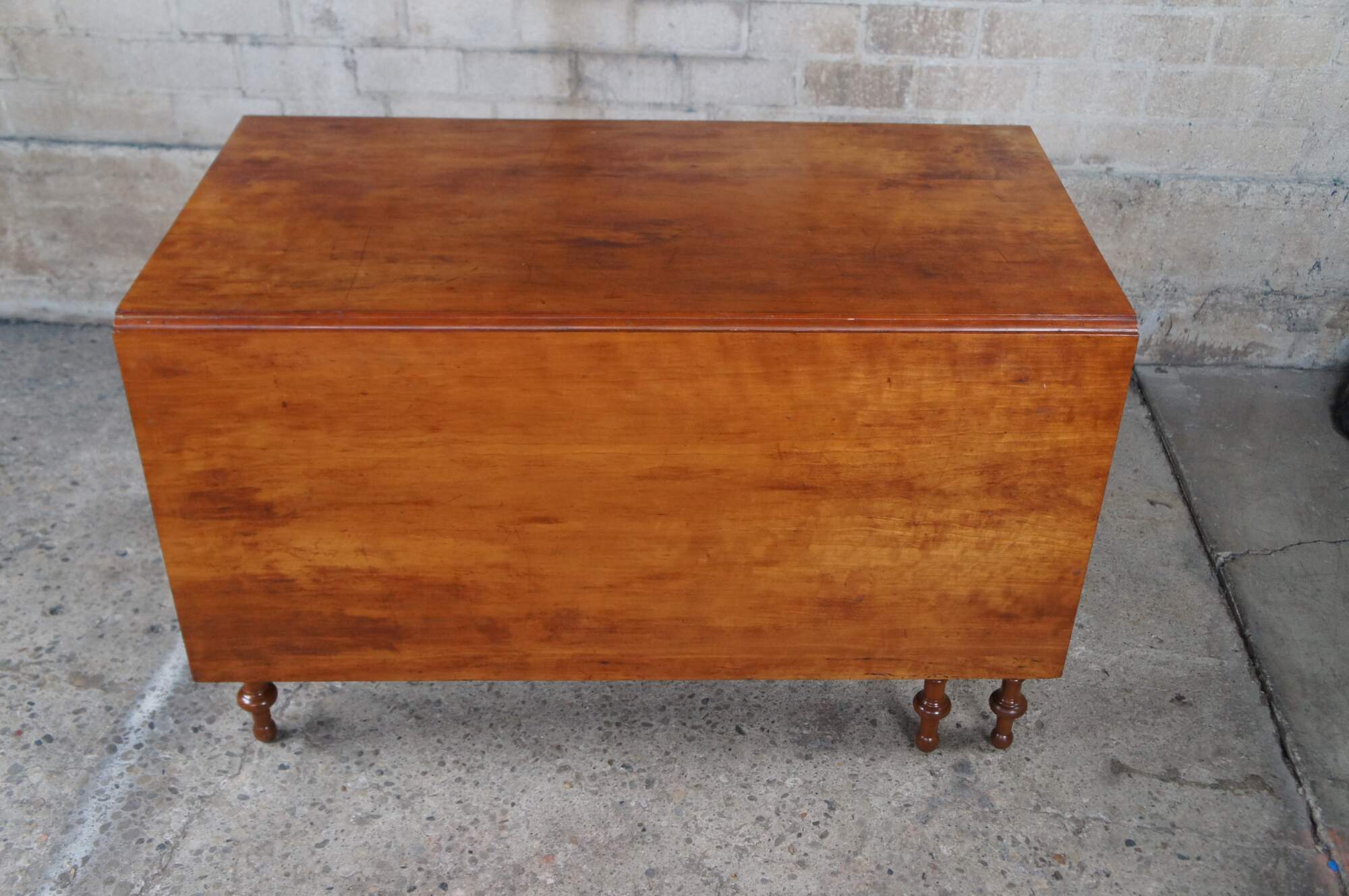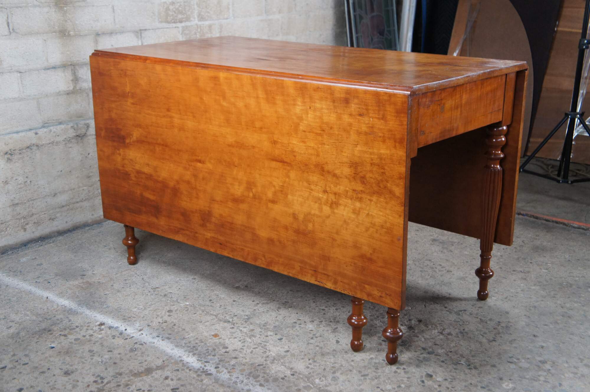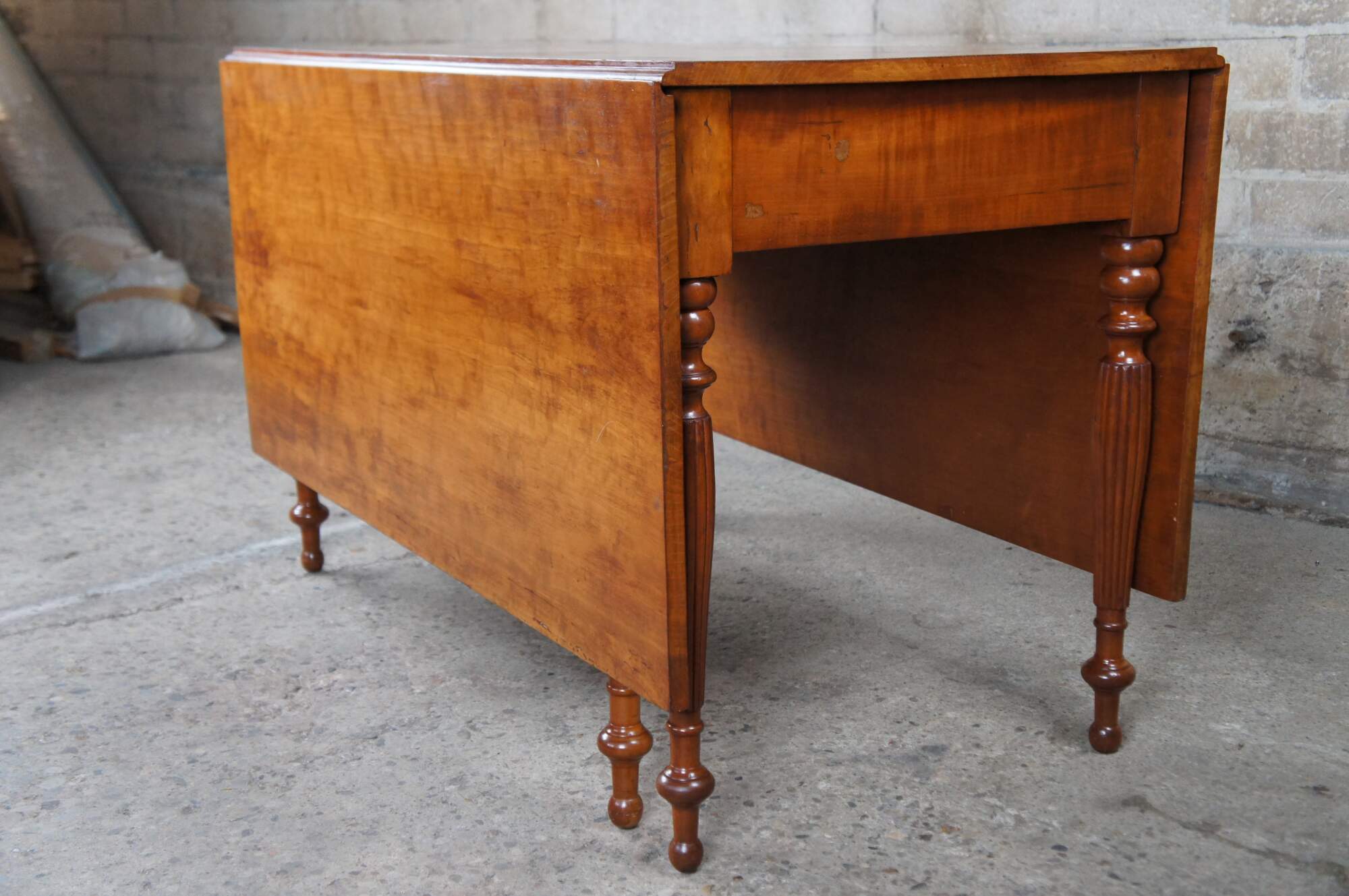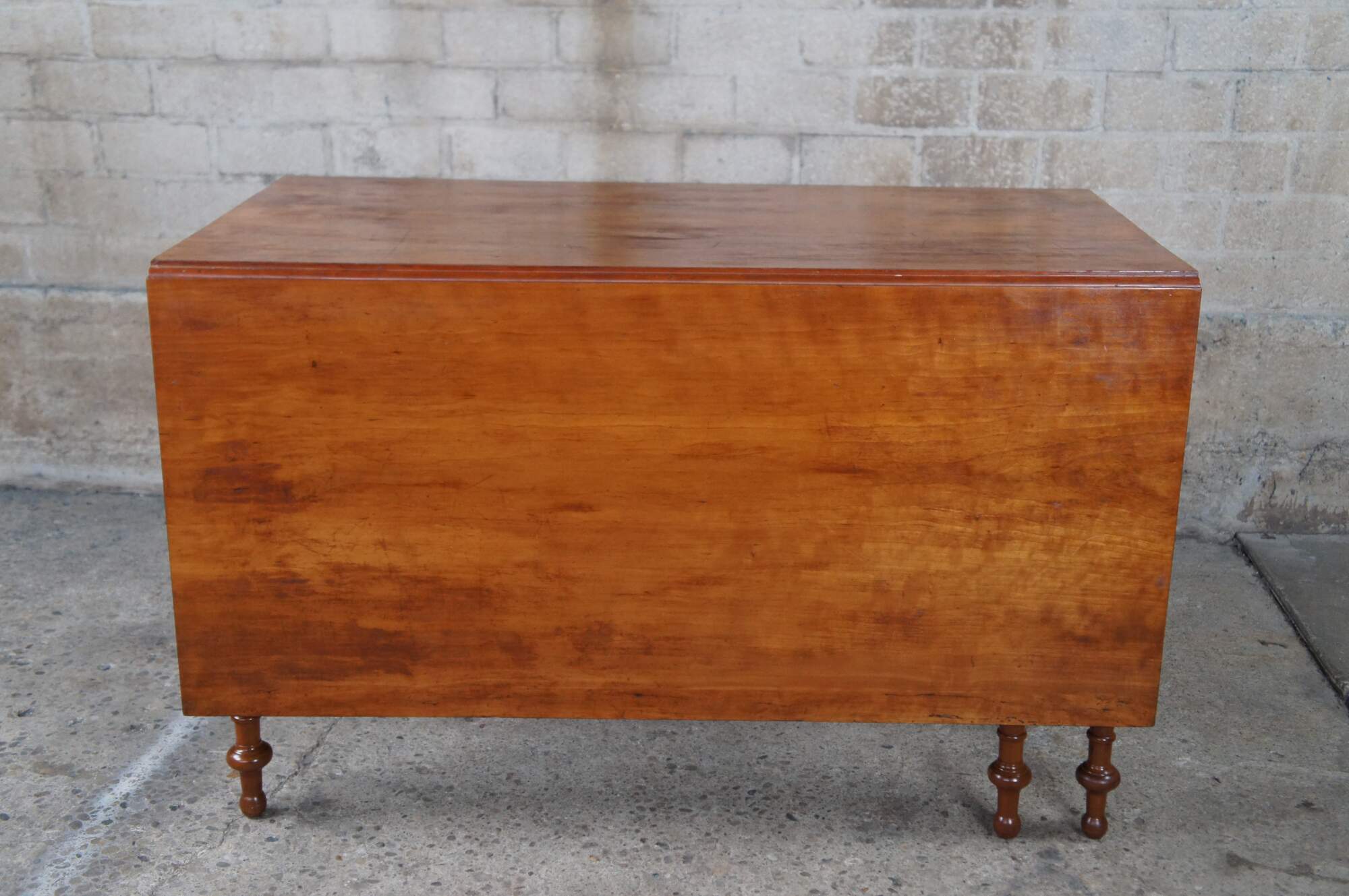 An equisite early 19th century American Sheraton gateleg dining table. Features a rectangular form with long drop leaves made from solid cherry. The table is supported by turned and reeded legs leading to toupie shaped feet. Great for use as breakfast table or against a wall as an entry console table.