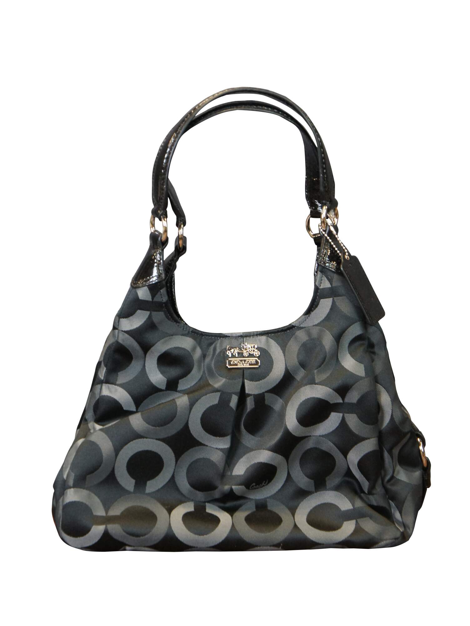 Vintage Coach Madison Maggie op art style signature pattern shoulder bag. Black and silver/gray shantung with patent leather accents and double handles. Chrome hardware. Blue satin lining. Compartment 1 - Magnetic snap closure, two interior slip pockets. Compartment 2 - Zipper closure, two interior slip pockets. Compartment 3 - Magenetic snap closure, one interior zipper pocket. No. H1380-15573M