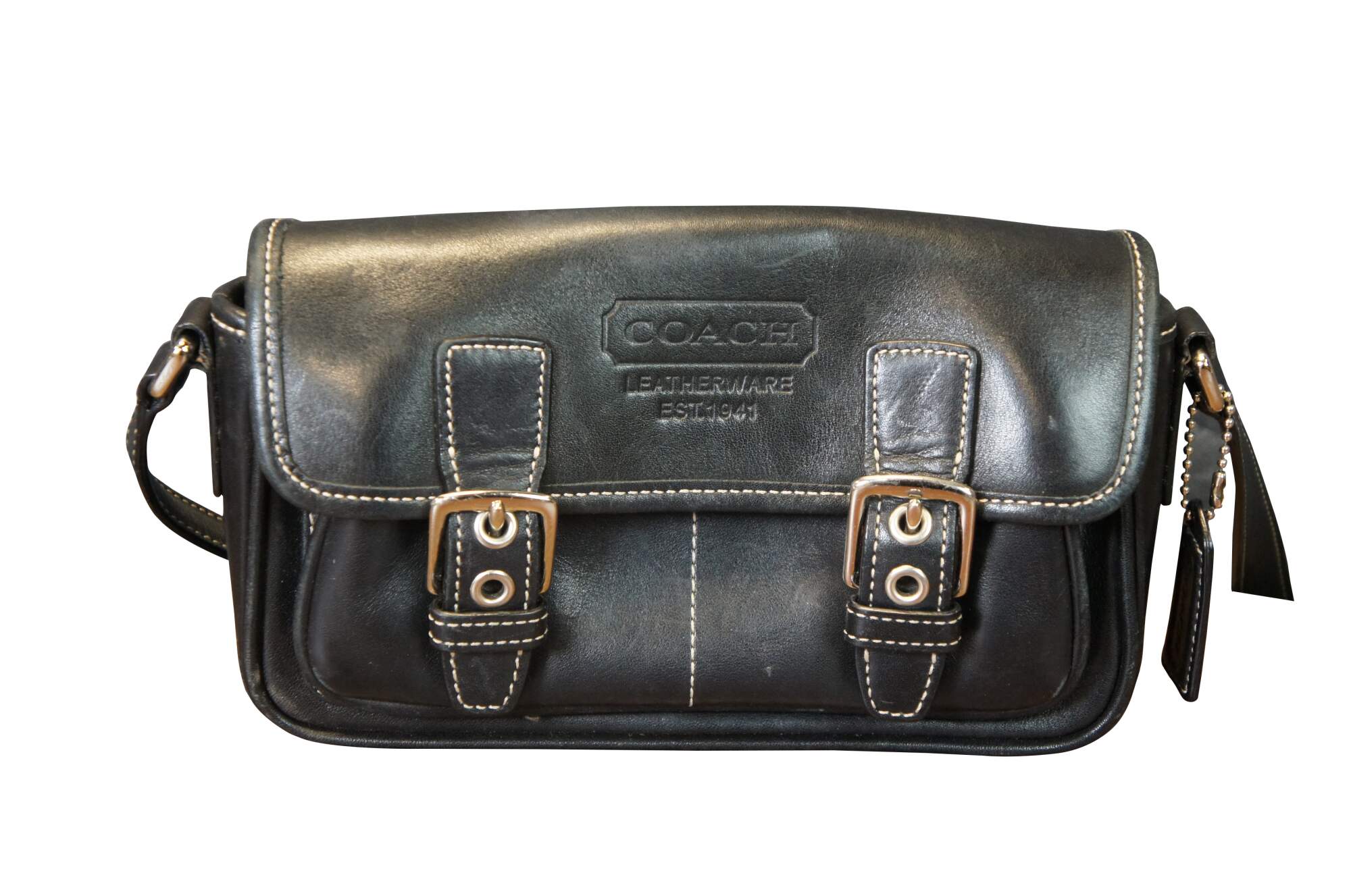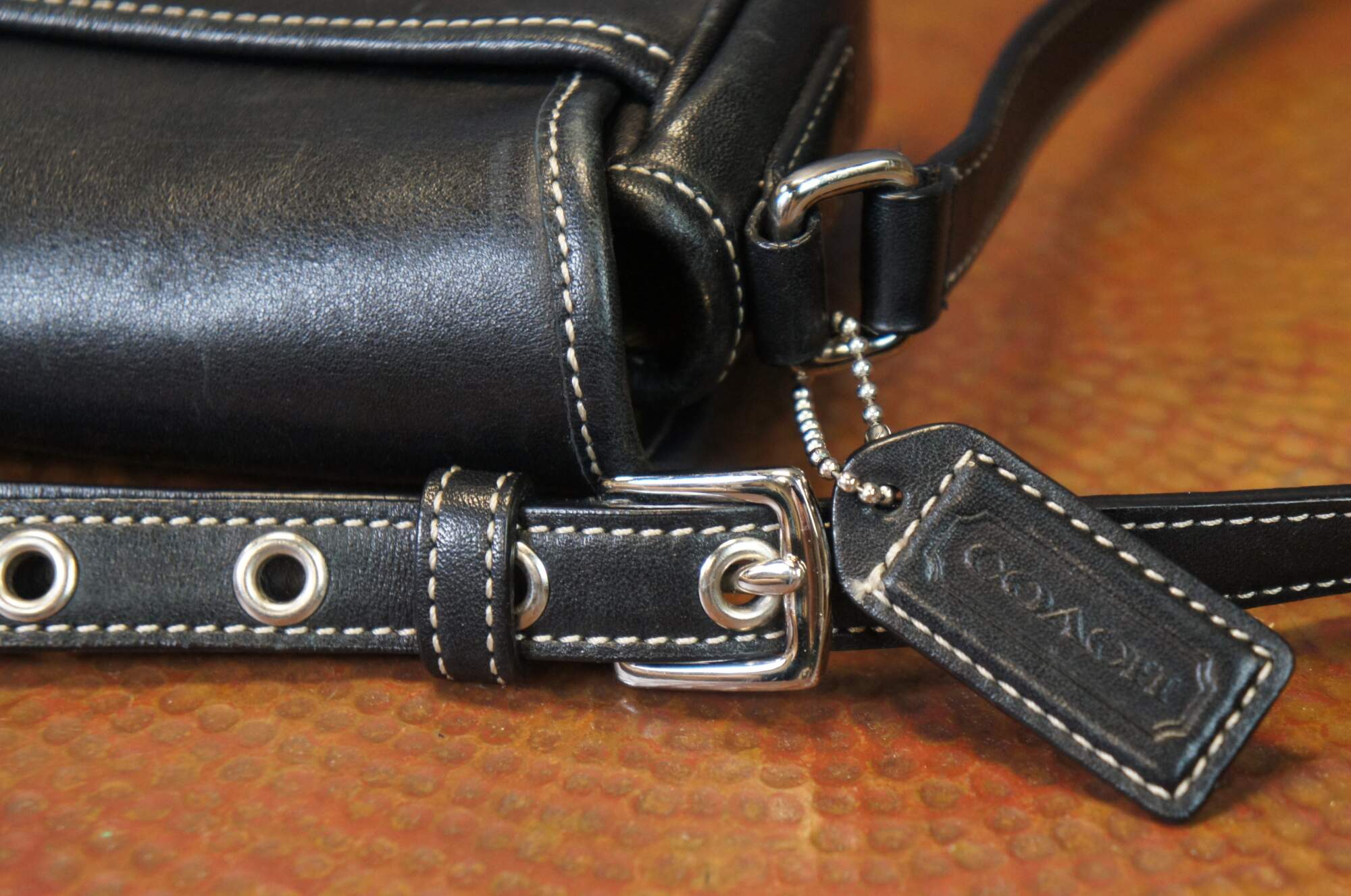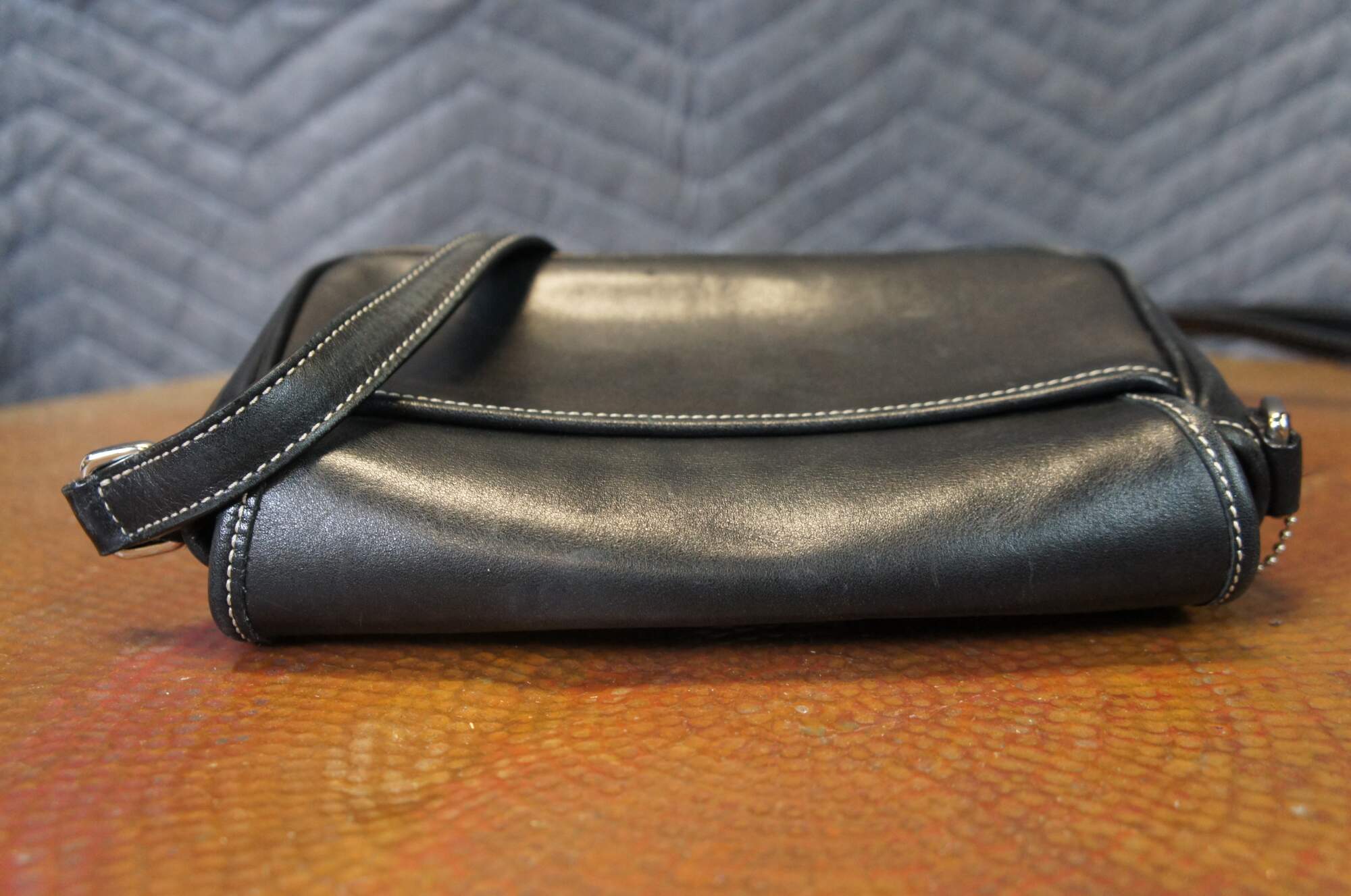Vintage Coach Leatherware small double buckle crossbody shoulder / hand bag / purse. Black leather with contrast stitching. Double magnetic snap closure. Chrome / silver hardware. Adjustable shoulder strap. Back exterior slip pocket. Front exterior slip pocket. One interior zipper pocket. Beige twill lining. No. G30-9355