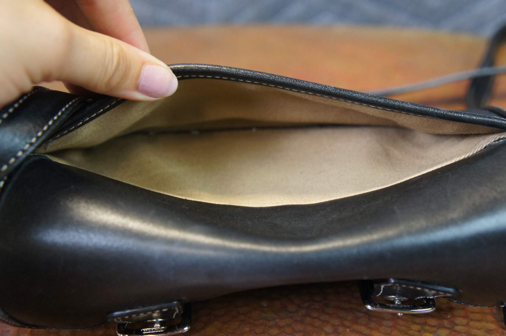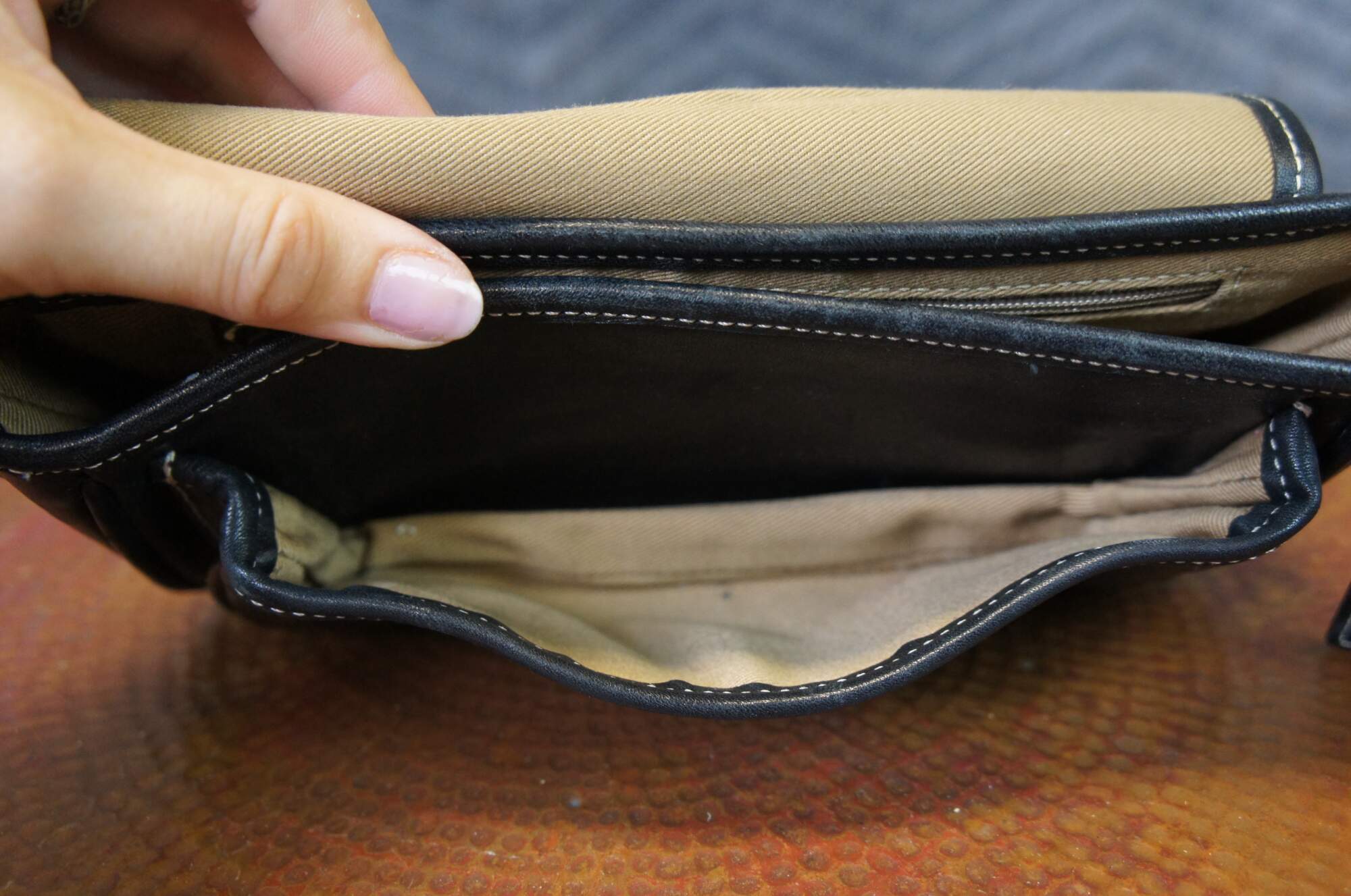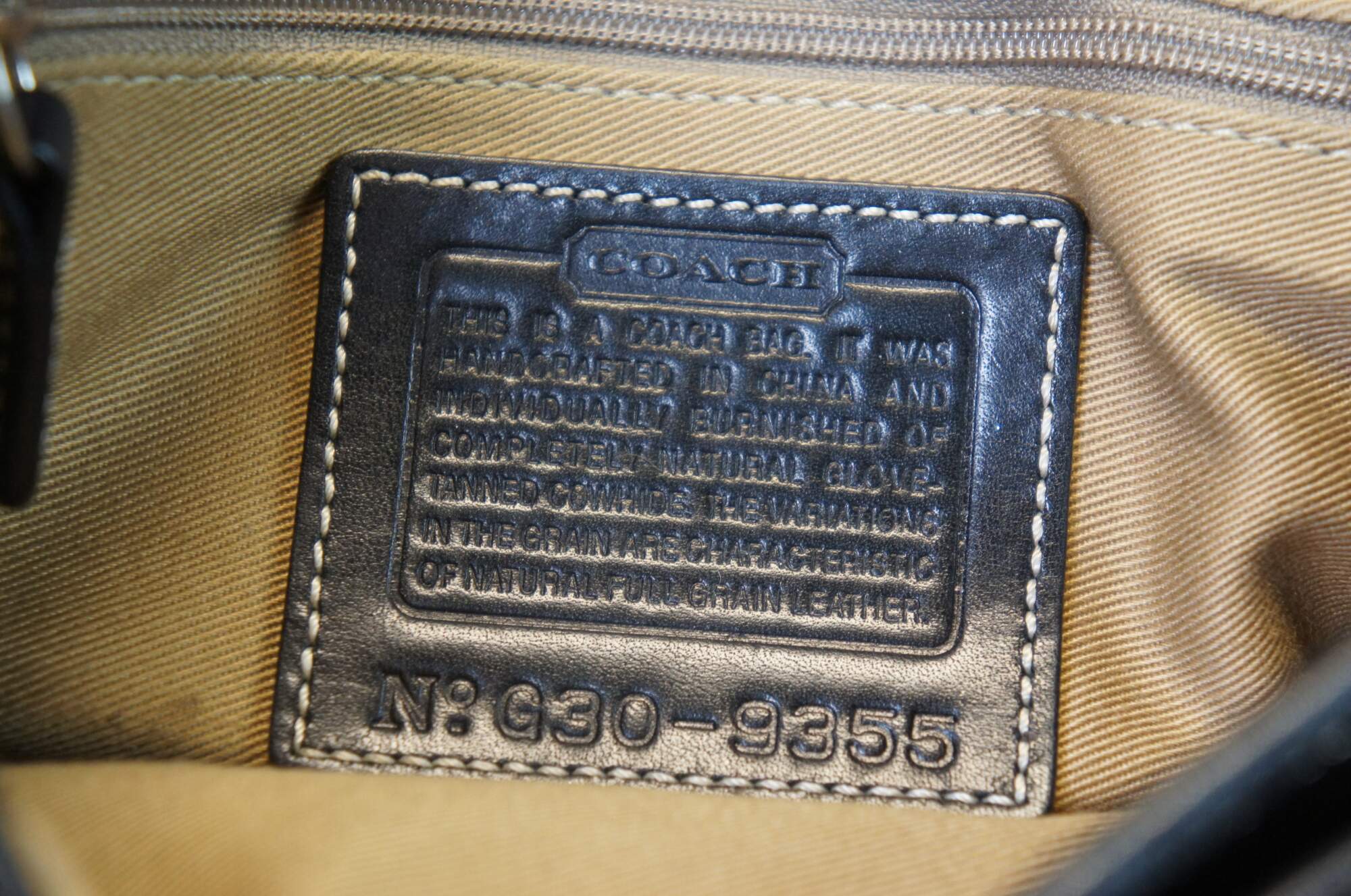 Vintage Coach Leatherware small double buckle crossbody shoulder / hand bag / purse. Black leather with contrast stitching. Double magnetic snap closure. Chrome / silver hardware. Adjustable shoulder strap. Back exterior slip pocket. Front exterior slip pocket. One interior zipper pocket. Beige twill lining. No. G30-9355