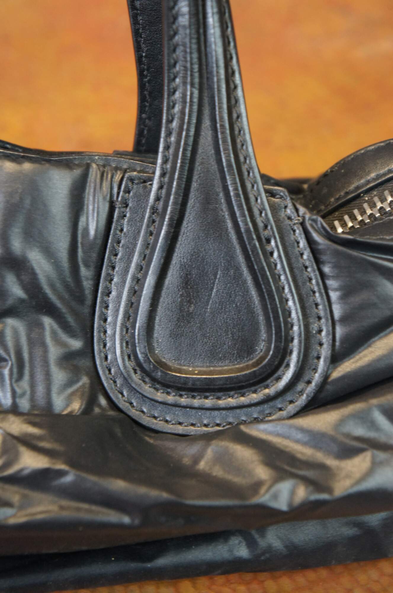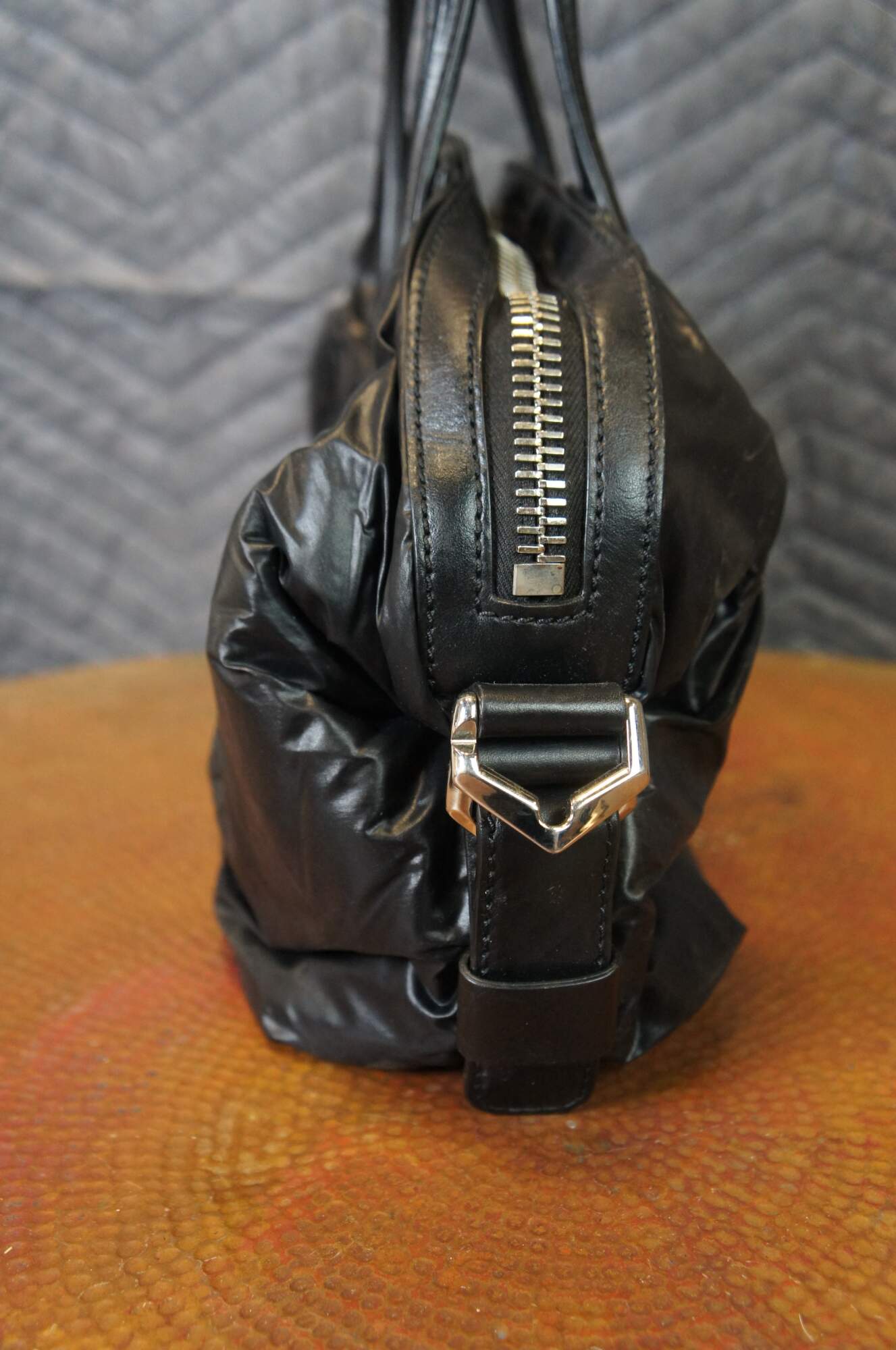 Vintage Givenchy Paris Nightingale small duffle bag / purse. Black nylon with leather double handles and trim. Chrome / silver hardware. Zipper closure. Missing de-tachable shoulder strap. Black cotton twill lining. Two interior slip pockets/ one interior zipper pocket. Made in Italy.