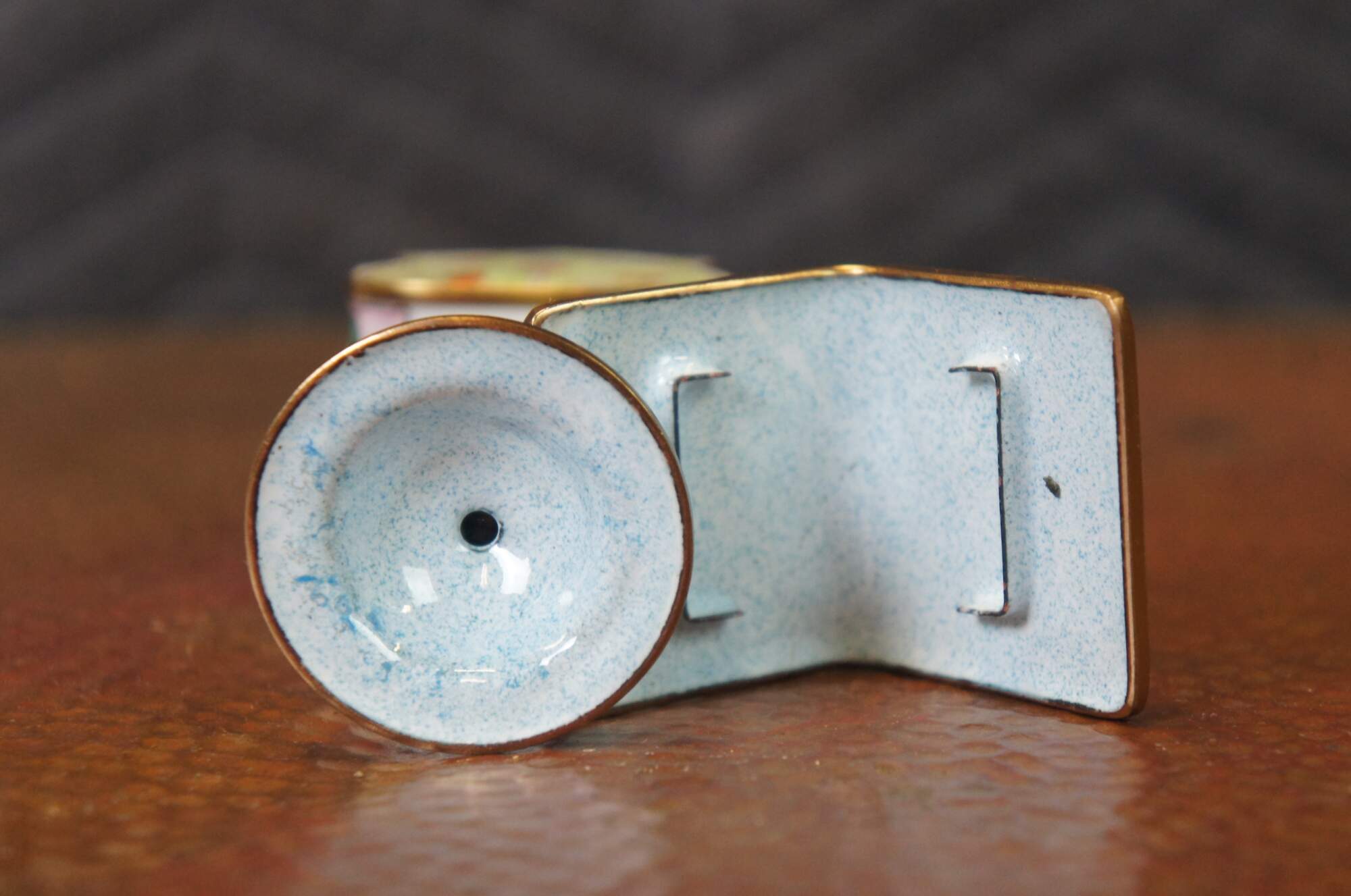 Late 20th century Kelvin Chen hand painted enamel birdhouse keepsake box / figurine / stamp roll holder. Green guitar shaped, leaf patterned birdhouse on a post with sign reading "Tree Top Inn," studded with ladybugs and autumn leaves, topped with a yellow and orange bird. Blue and white speckled interior. Hand numbered 629 - 2001.