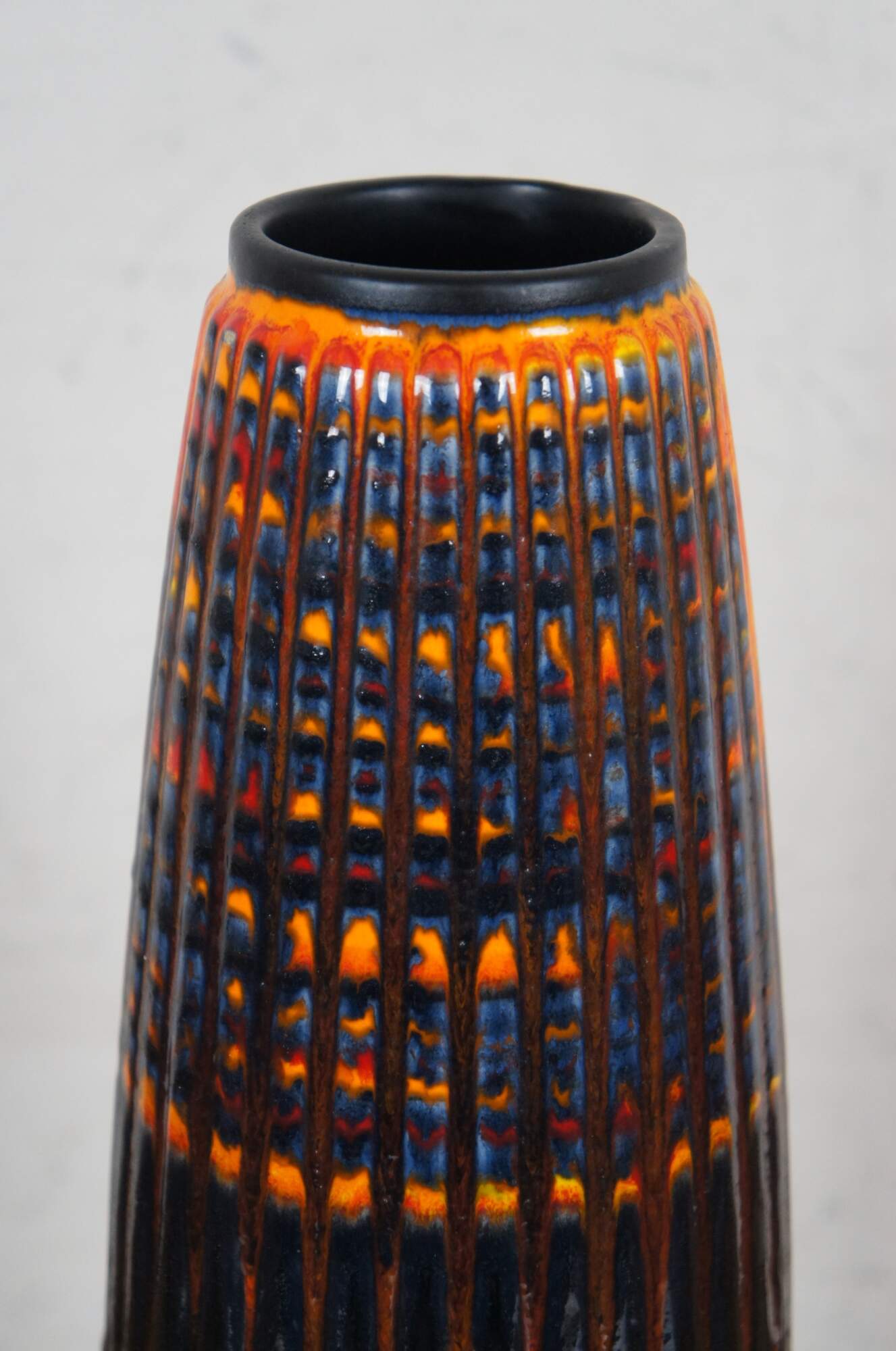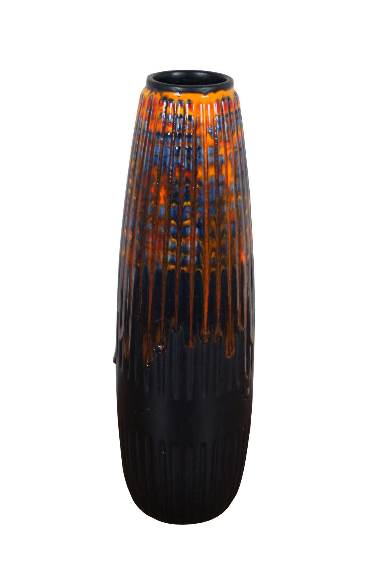 Mid 20th century flower vase by Haeger Potteries. Tall ovoid form in matte black with a grooved / fluted surface and a drip glaze in orange, blue, and red. The Peacock Glaze was created by Royal Hickman and introduced by Haeger in 1966. Numbered 25H.