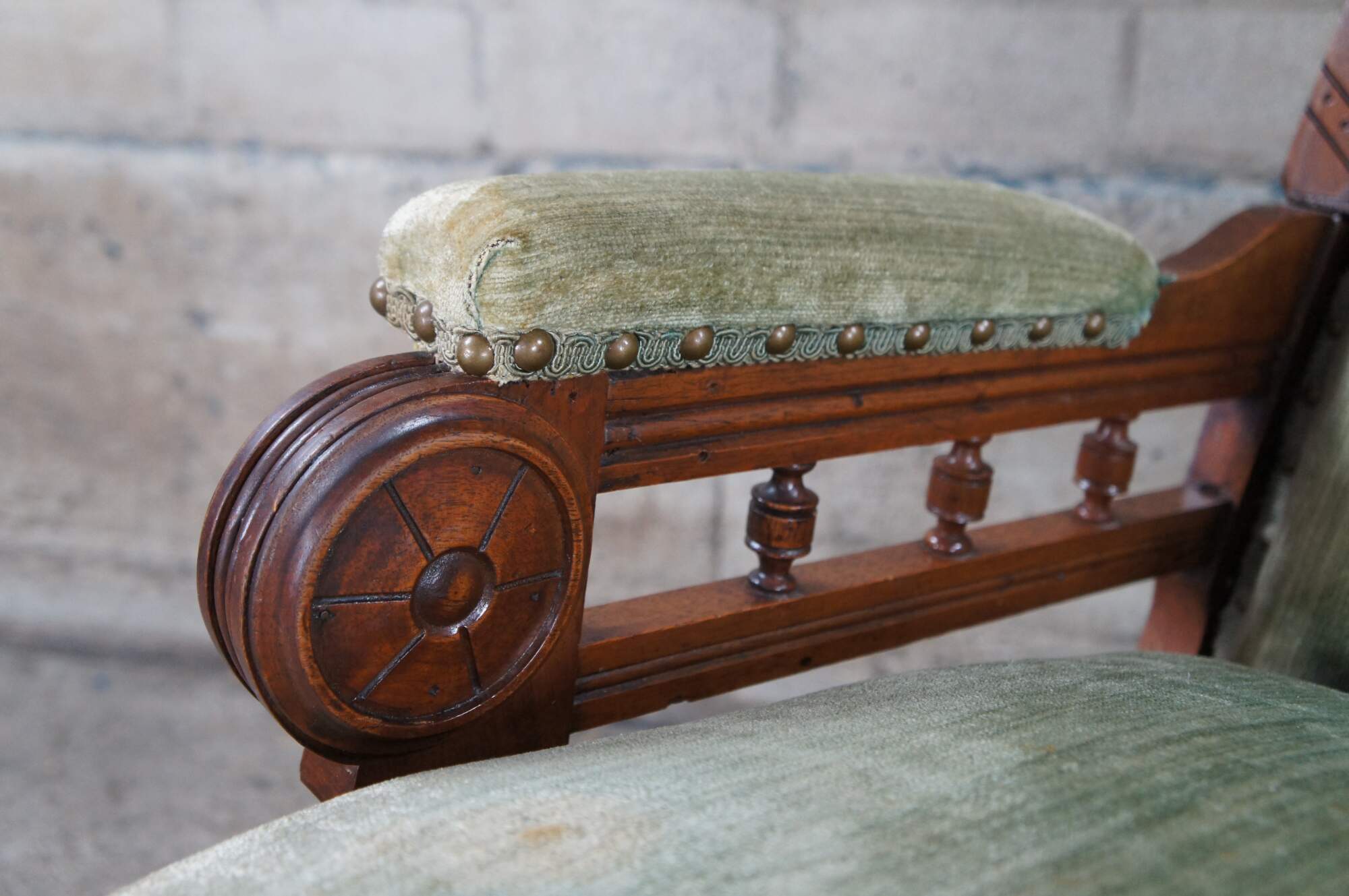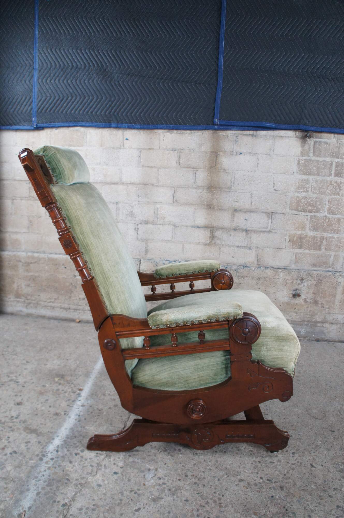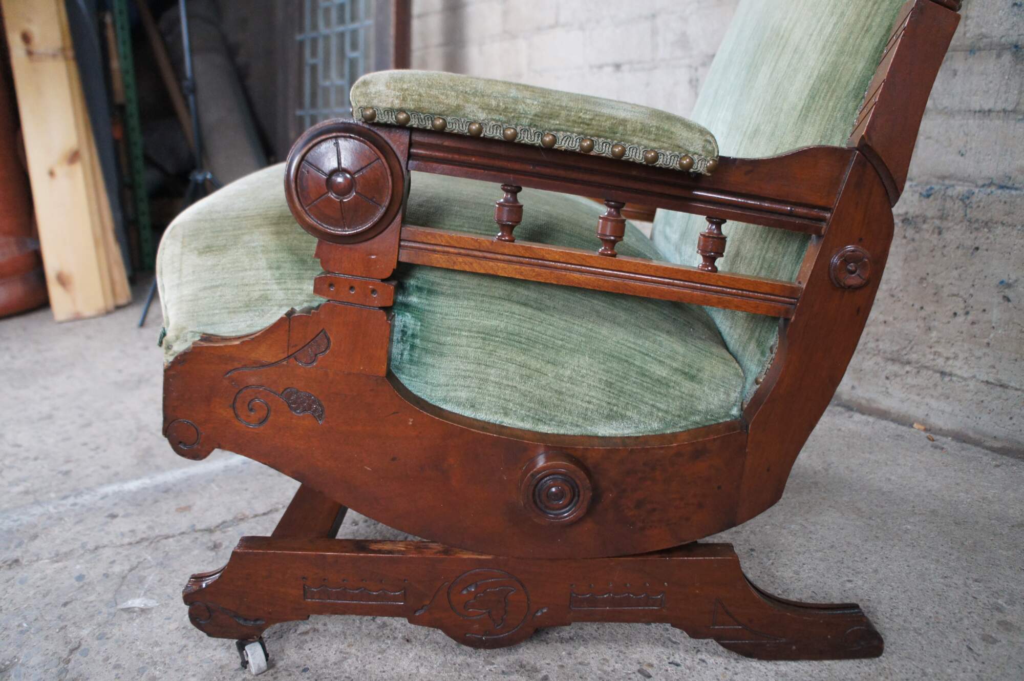 Antique Victorian platform rocking armchair. Made of walnut featuring Eastlake styling with turned foliate and wheel designs, padded arms / headrest, and nailhead trim. Upholstered in green velvet. Rock, Hughes & Co., Furniture & Rugs , Urbana Ohio.