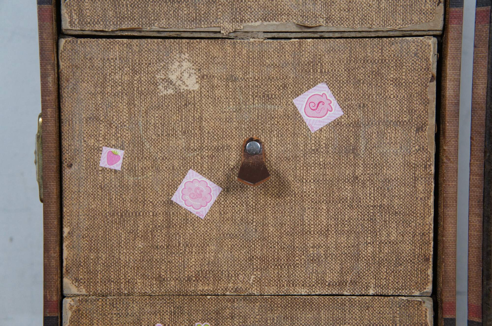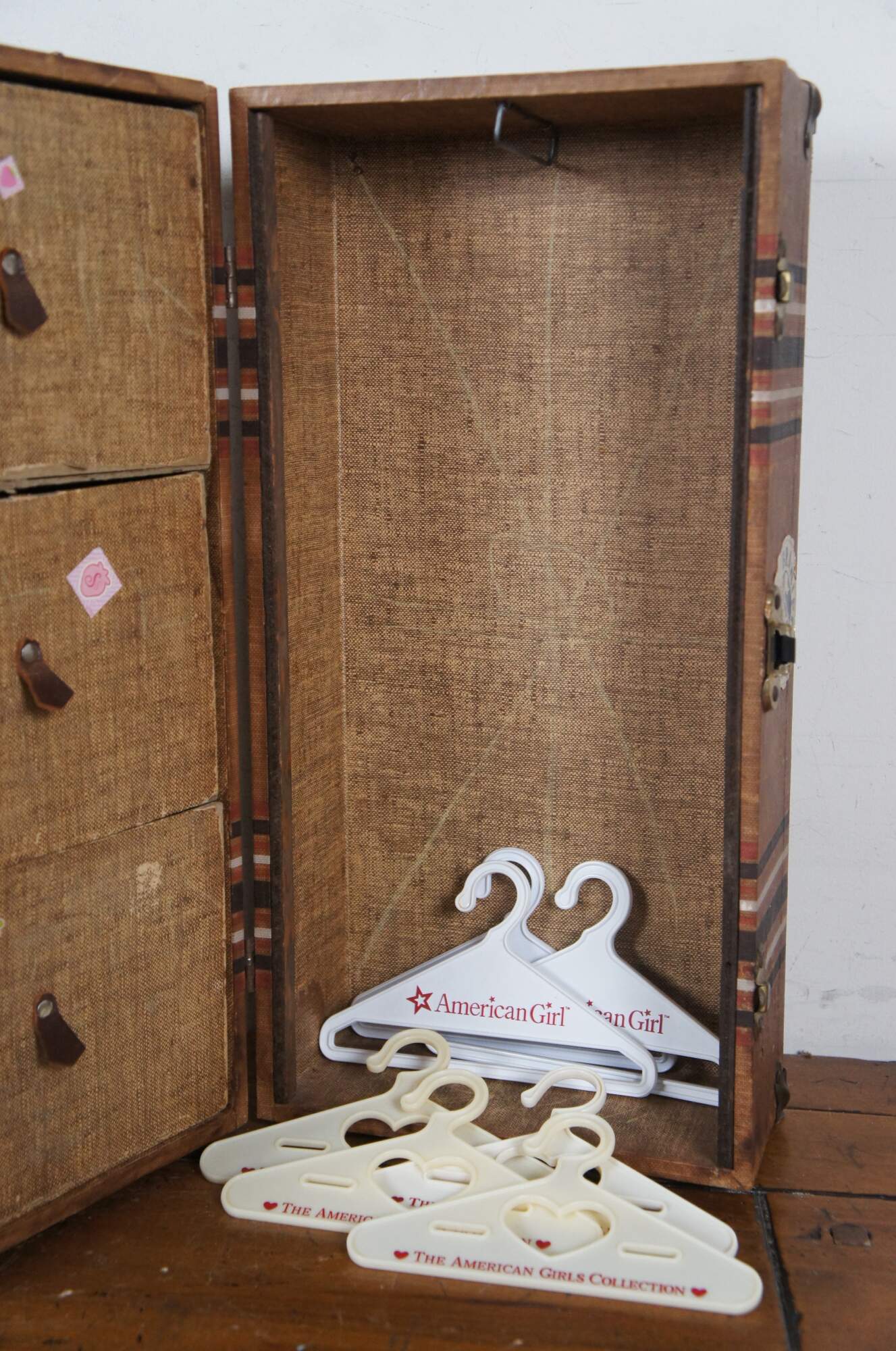 Mid 20th century doll sized steamer trunk / foot locker / wardrobe for the storage of doll clothes and accessiroes. Rectangular form with brown striped surface, embellished with several travel stickers from the era. Metal capped corners and three latches (central locking latch is broken). Interior has a rail for hanging clothes on one side and three drawers on the other. Includes seven modern American Girl doll clothes hangers.