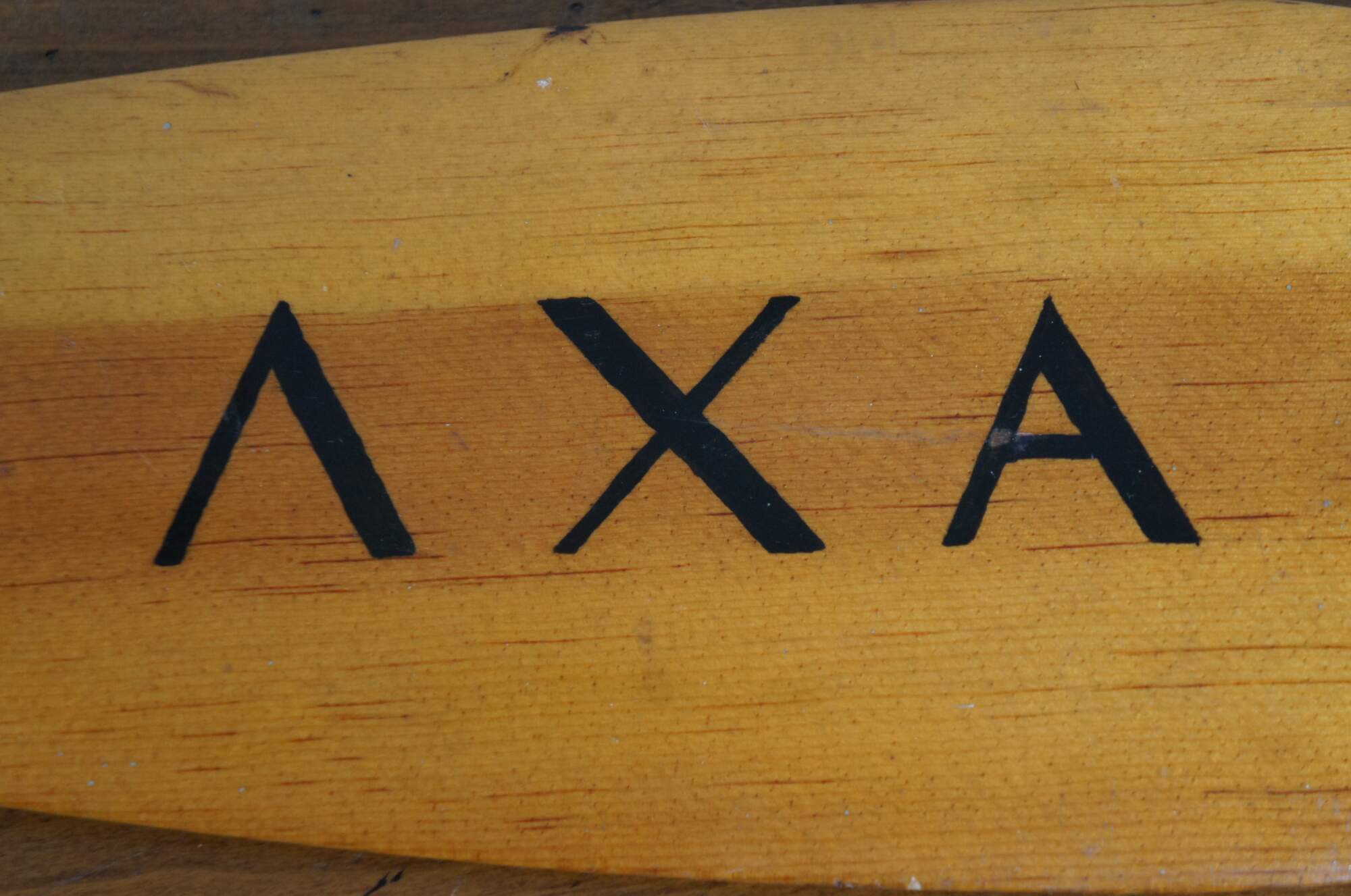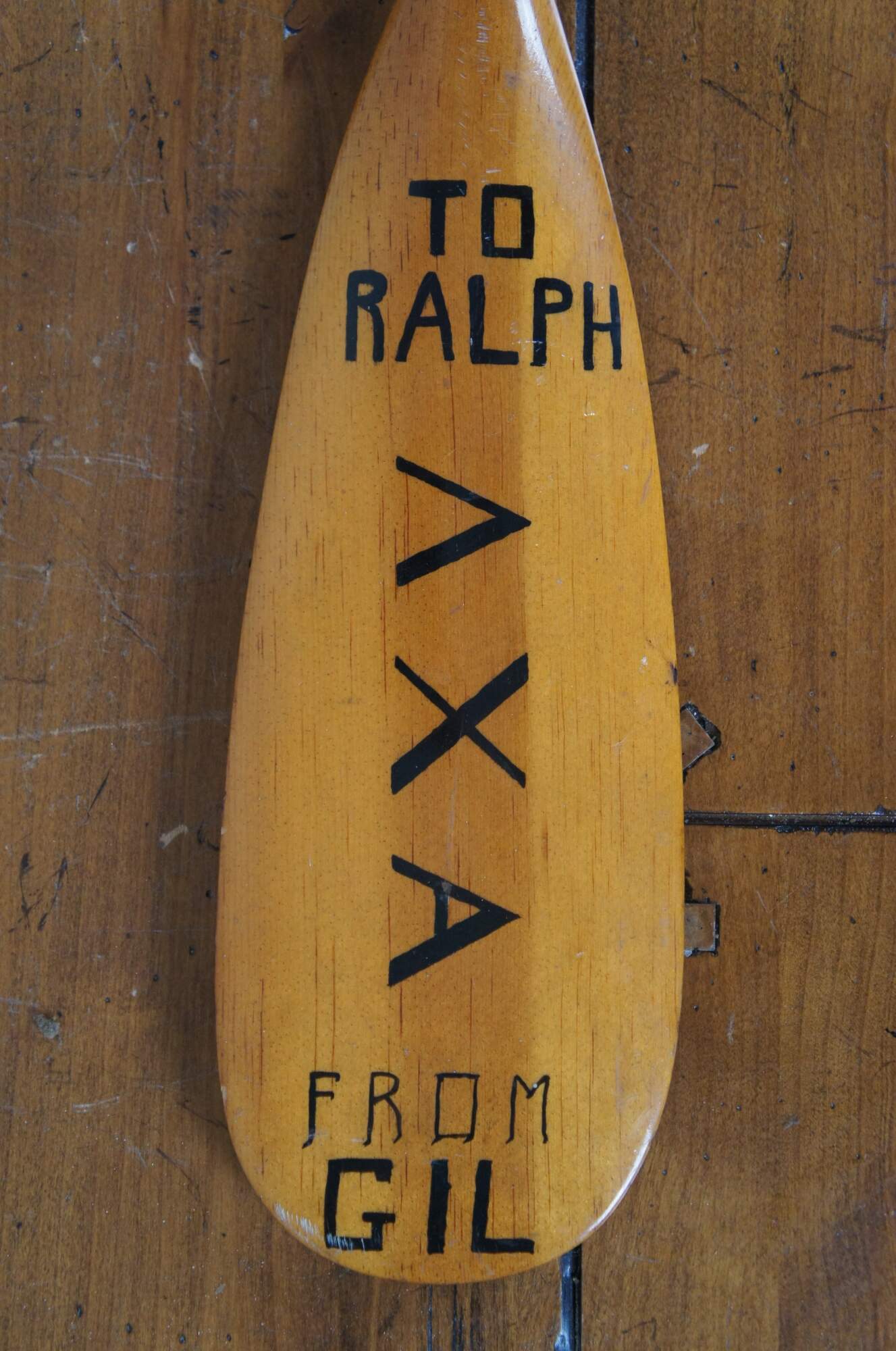 Mid 20th century wooden folk art canoe oar / paddle, custom decorated with "To Ralph From Gil" and the letters of the Lambda Chi Alpha college / university fraternity.