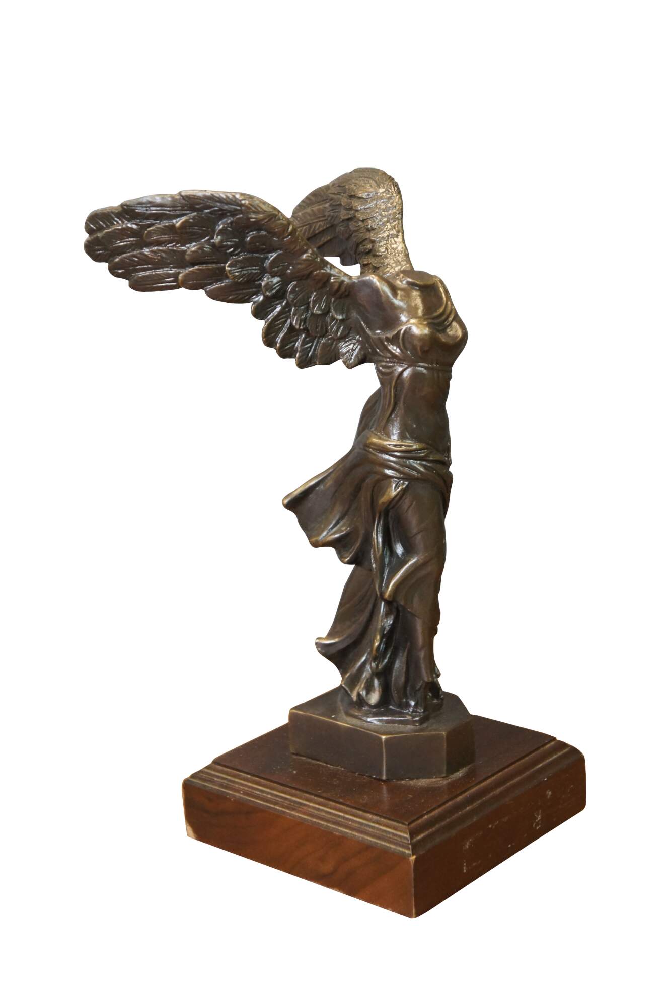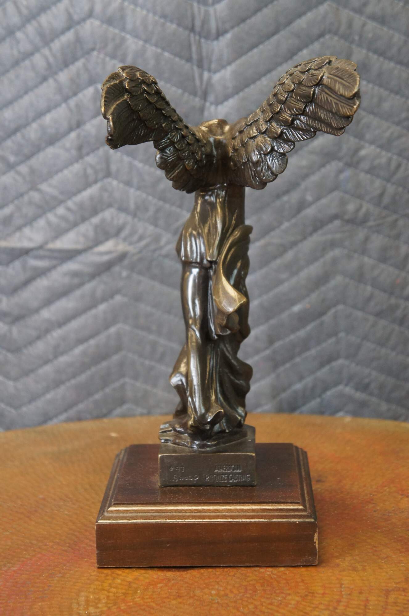 Late 20th century bronze figurine / art sculpture Winged Victory, representing the historic Nike of Samothrace, as crafted by Wally Shoop of American Bronze Casting Ltd. Figure is mounted on a beveled wood plinth. Marked on side of base. Copyright 1997. Item number B391.