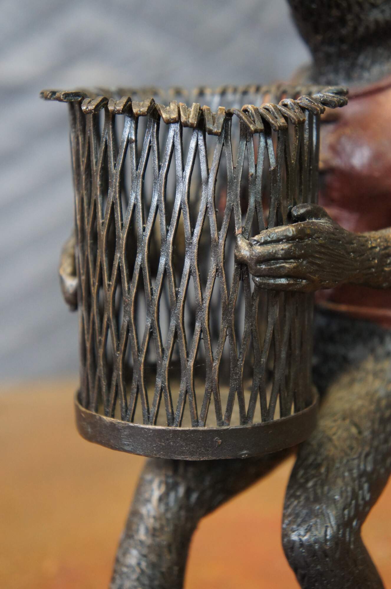 Late 20th century bronze figurine / votive candholder / toothpick / pen holder / library bookend in the shape of a monkey / chimpanzee wearing a red vest, carrying a cylindrical basket, standing on a rectangular base. Attibuted to Maitland Smith.