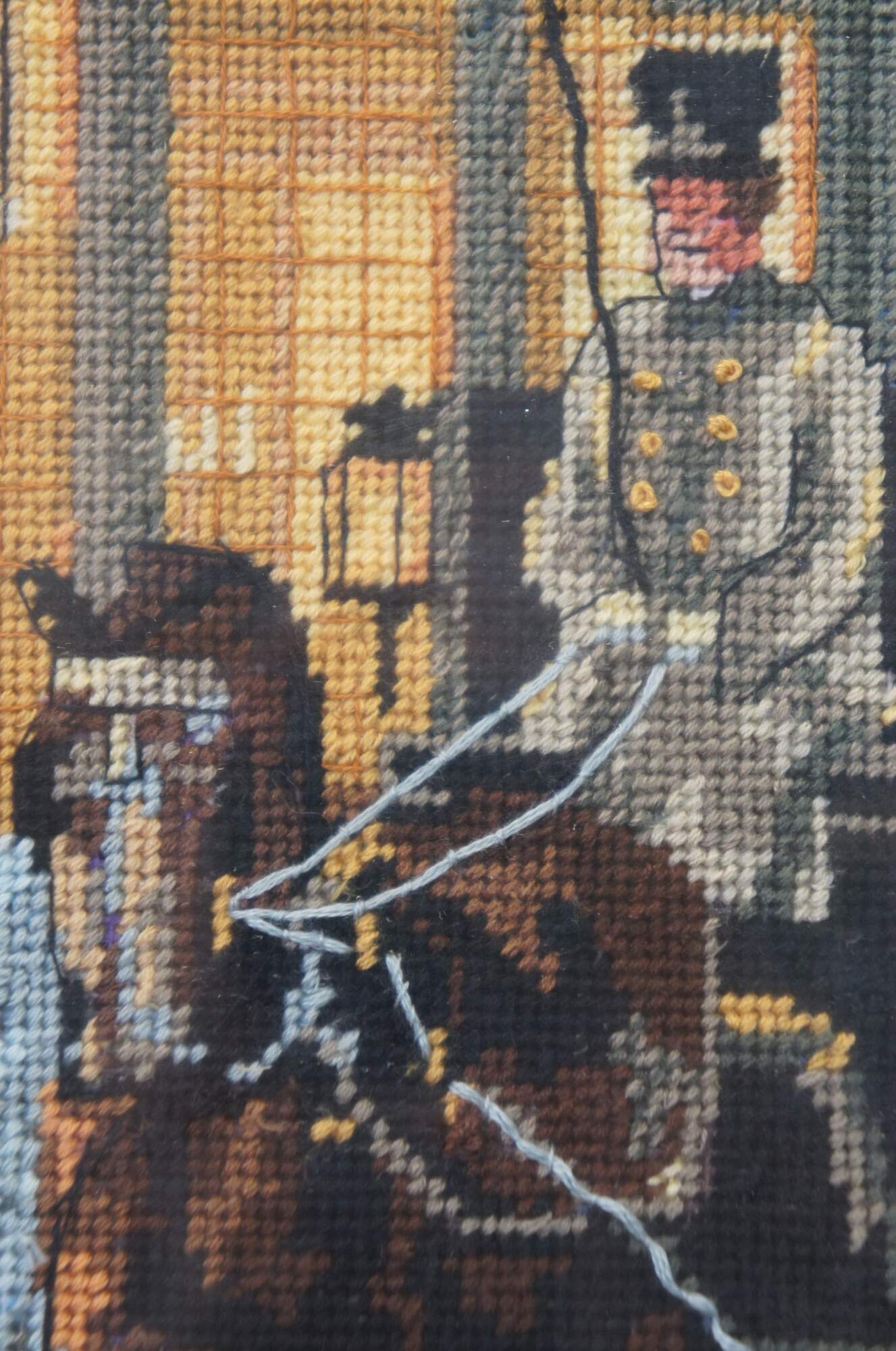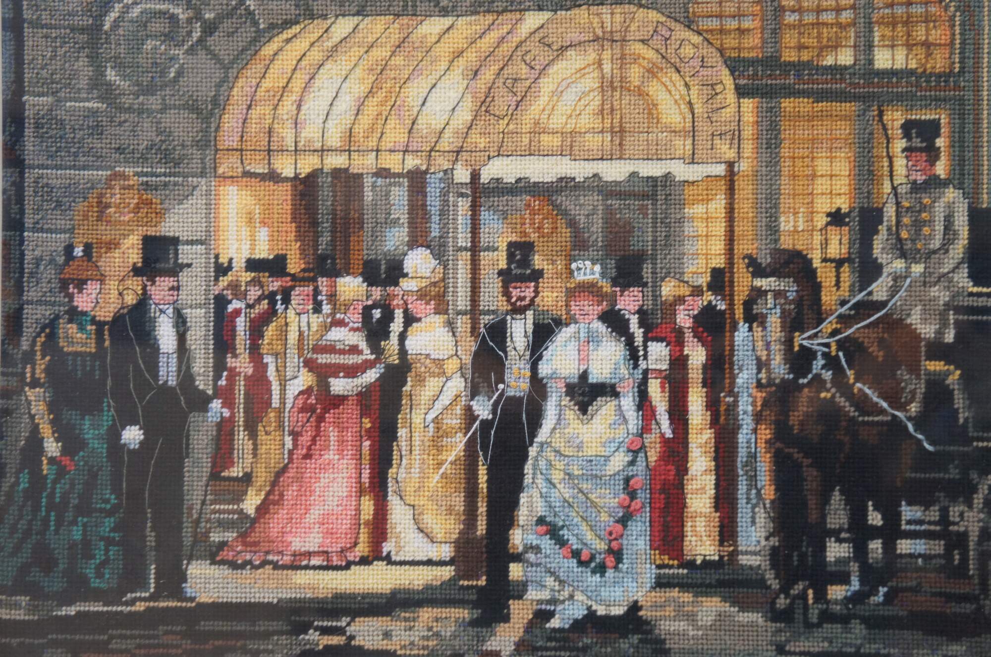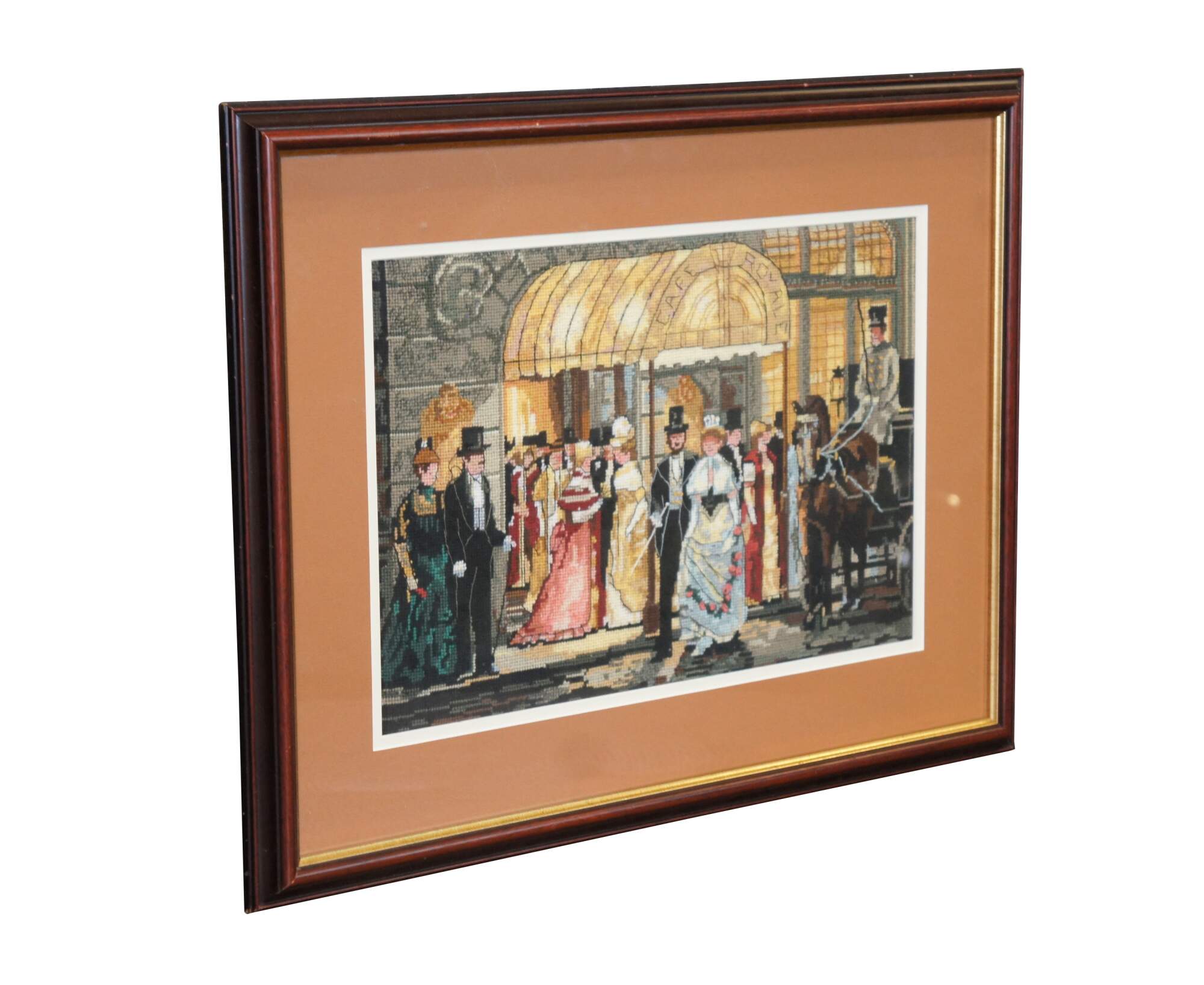 Late 20th century framed and completed, hand crafted cross stitch art titled Cafe Royale depicting a Victorian era street scene of a carriage and elegant figures in evening wear at the entrance to the Cafe Royale. The Gold Collection by Dimensions - Number 2465 - Cafe Royale - A Needlepoint Design by Alan Maley. Beveled wood frame with gold interior edge; apricot and white layered mat.