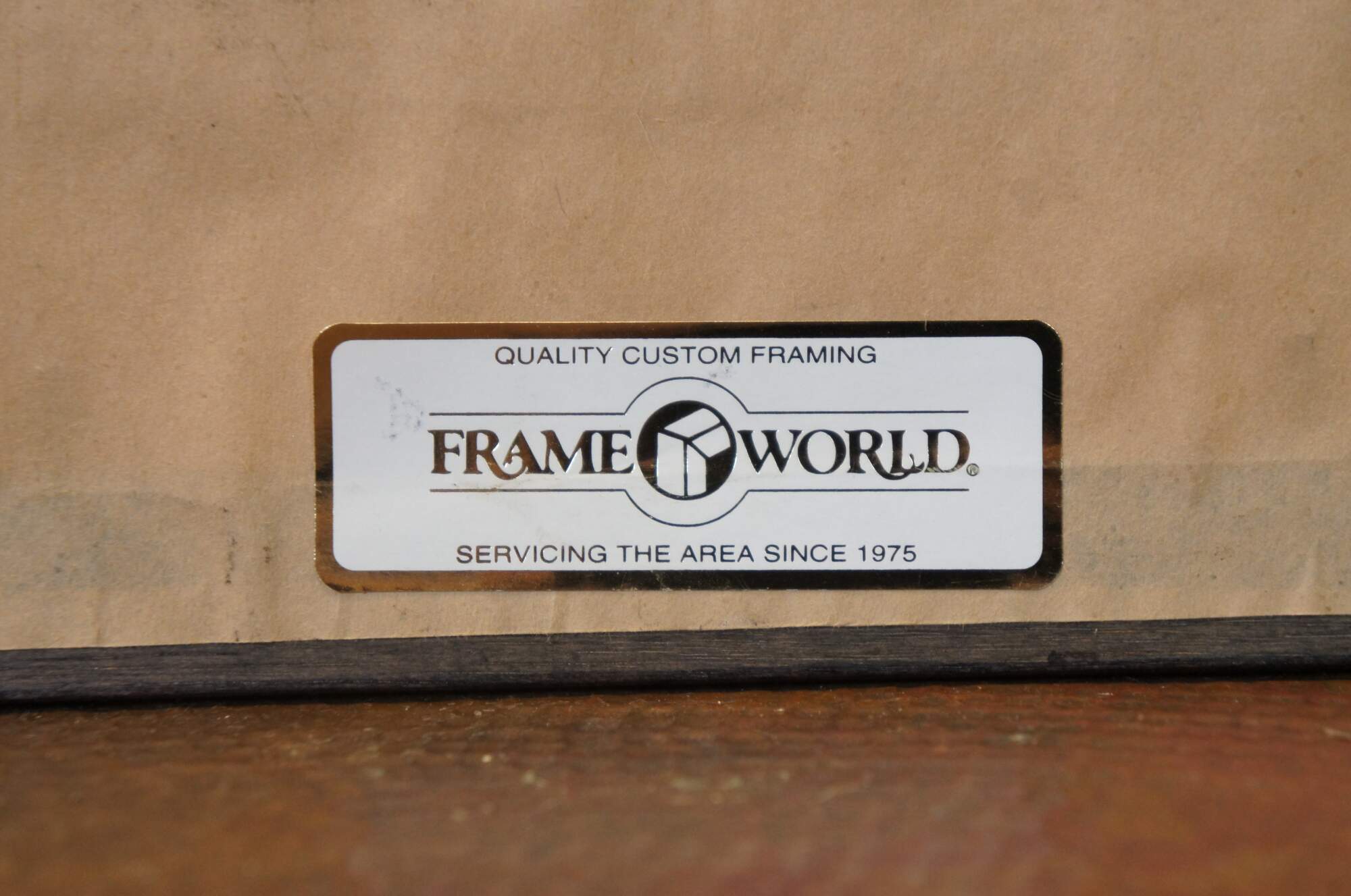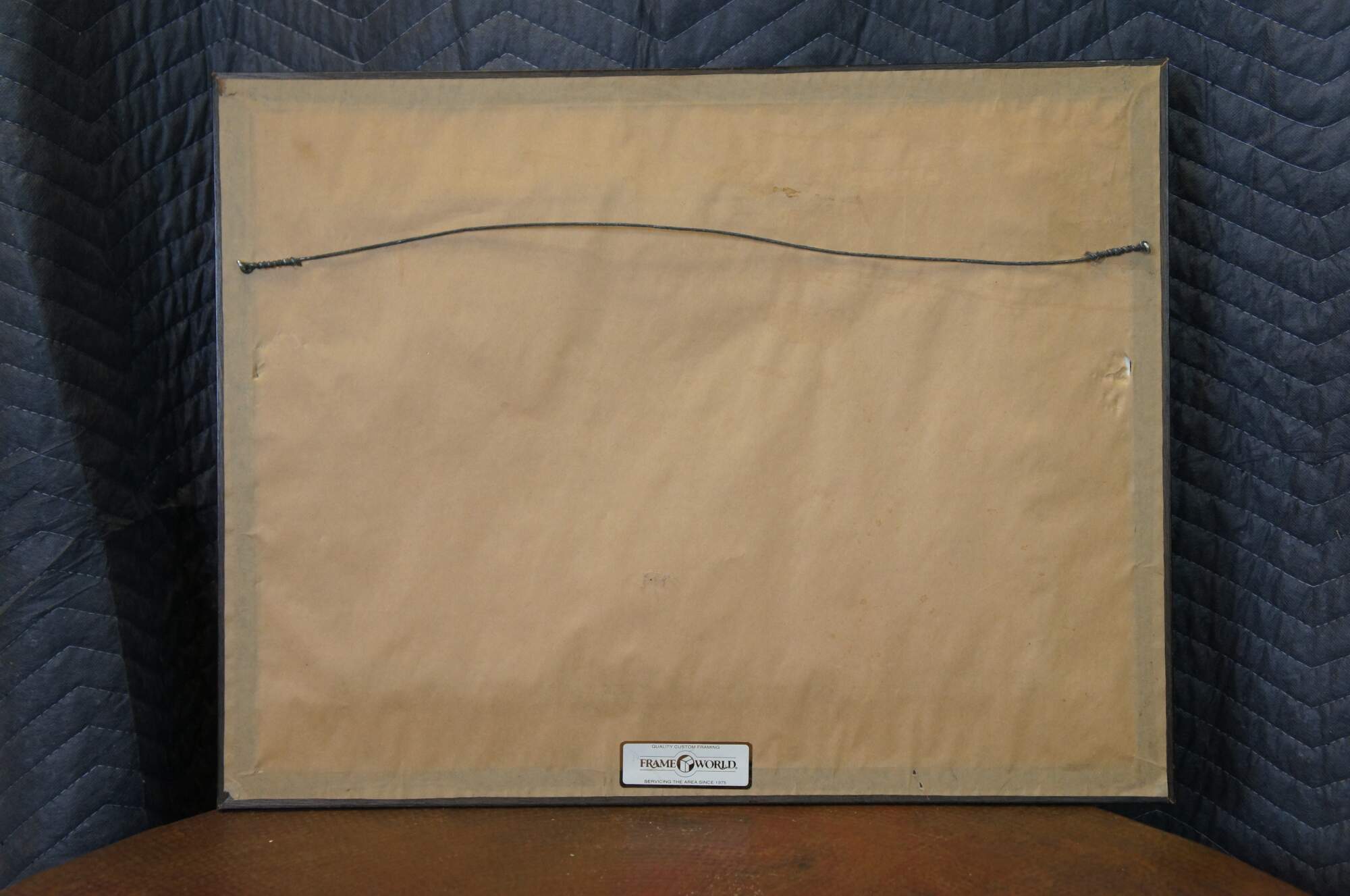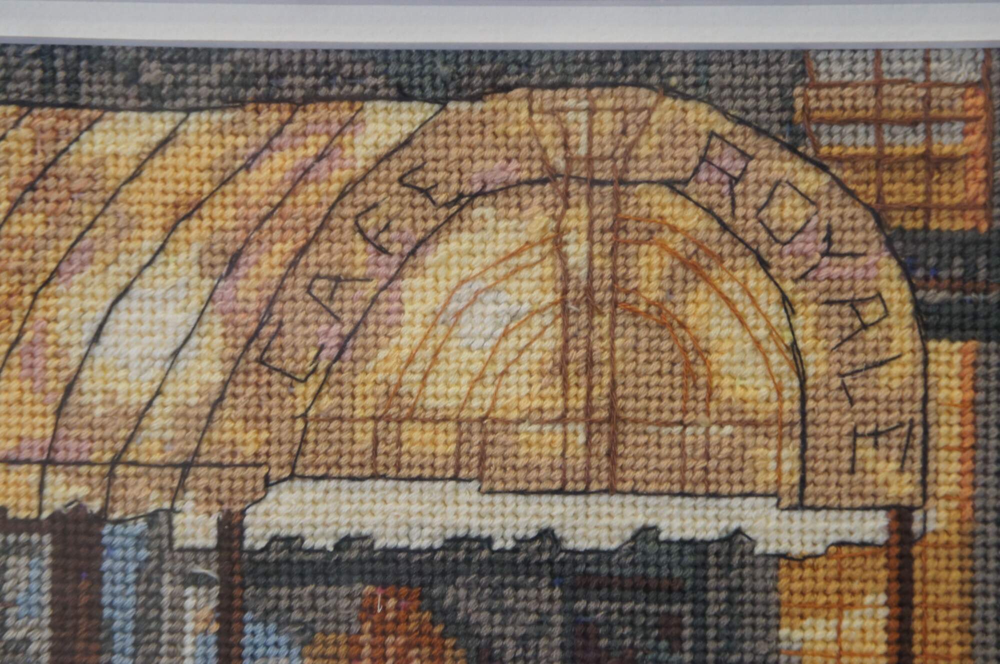 Late 20th century framed and completed, hand crafted cross stitch art titled Cafe Royale depicting a Victorian era street scene of a carriage and elegant figures in evening wear at the entrance to the Cafe Royale. The Gold Collection by Dimensions - Number 2465 - Cafe Royale - A Needlepoint Design by Alan Maley. Beveled wood frame with gold interior edge; apricot and white layered mat.