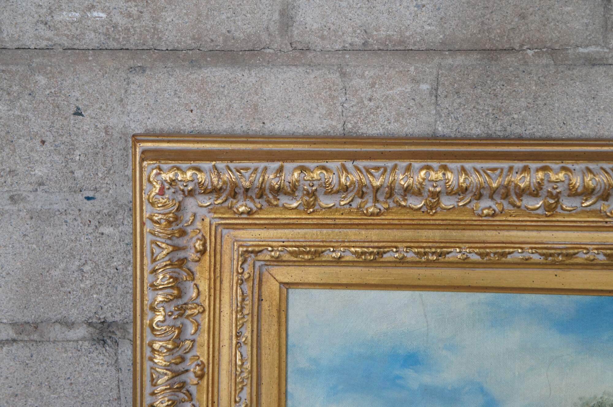 A beautiful 20th century oil painting on canvas, signed lower right. Features a landscape with pond and water lillies. Trees can be seen in the background beneath a partly cloudy sky. The painting is framed in wood with gilt finish.