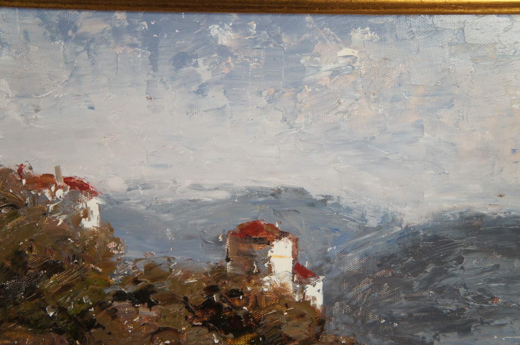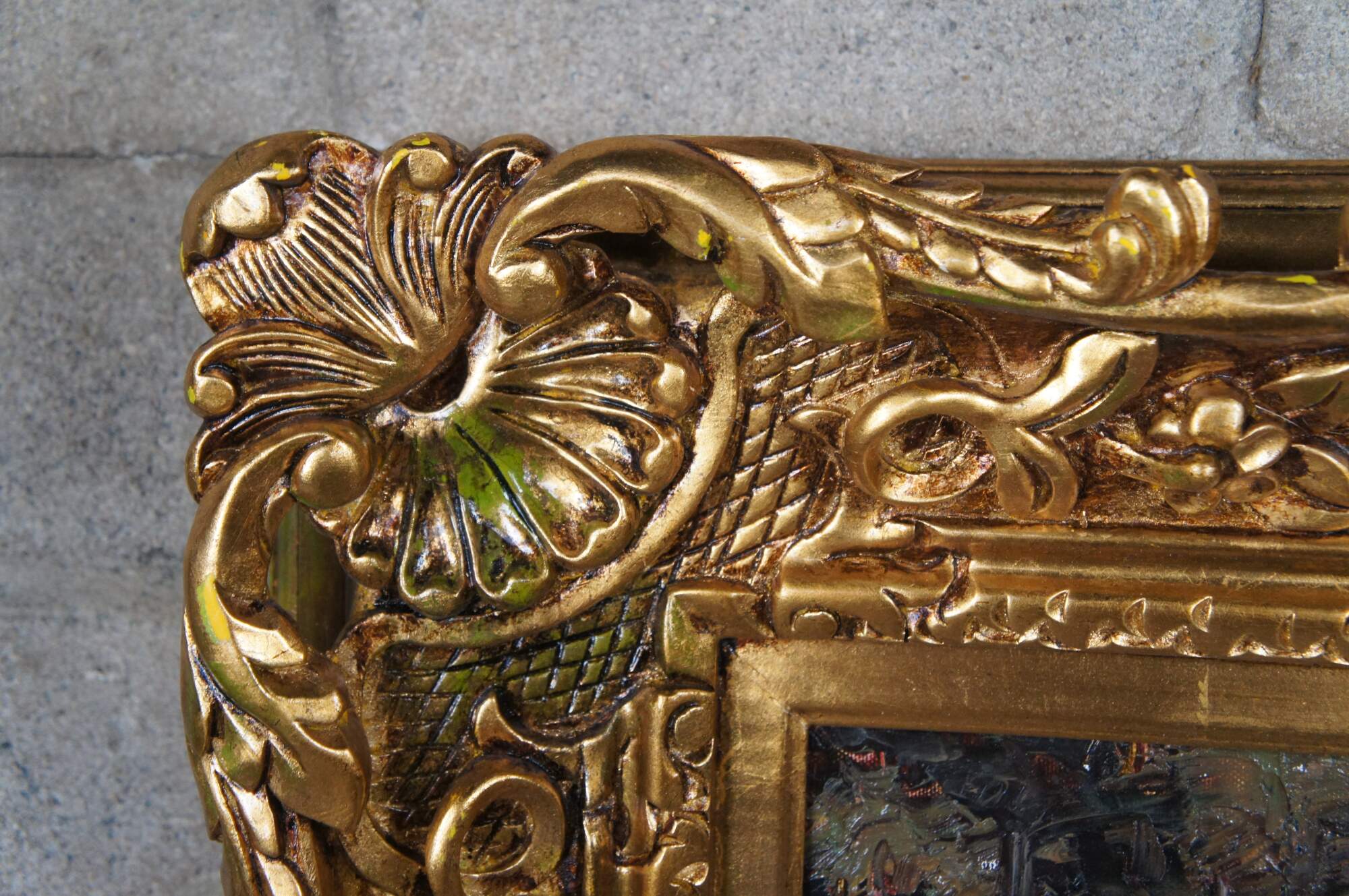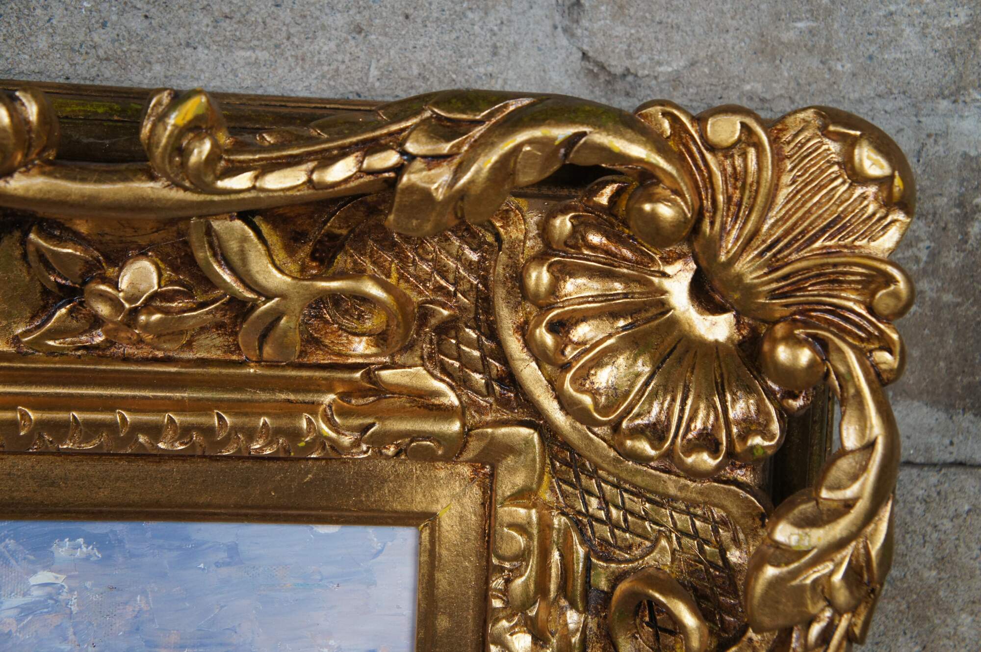 An impressionist seascape, signed lower right. The painting is on canvas and features a coastal town showing parts of the cityscape with sailboats at the port. Signed lower right. Famred in gold with acanthus and scalloped detail.
