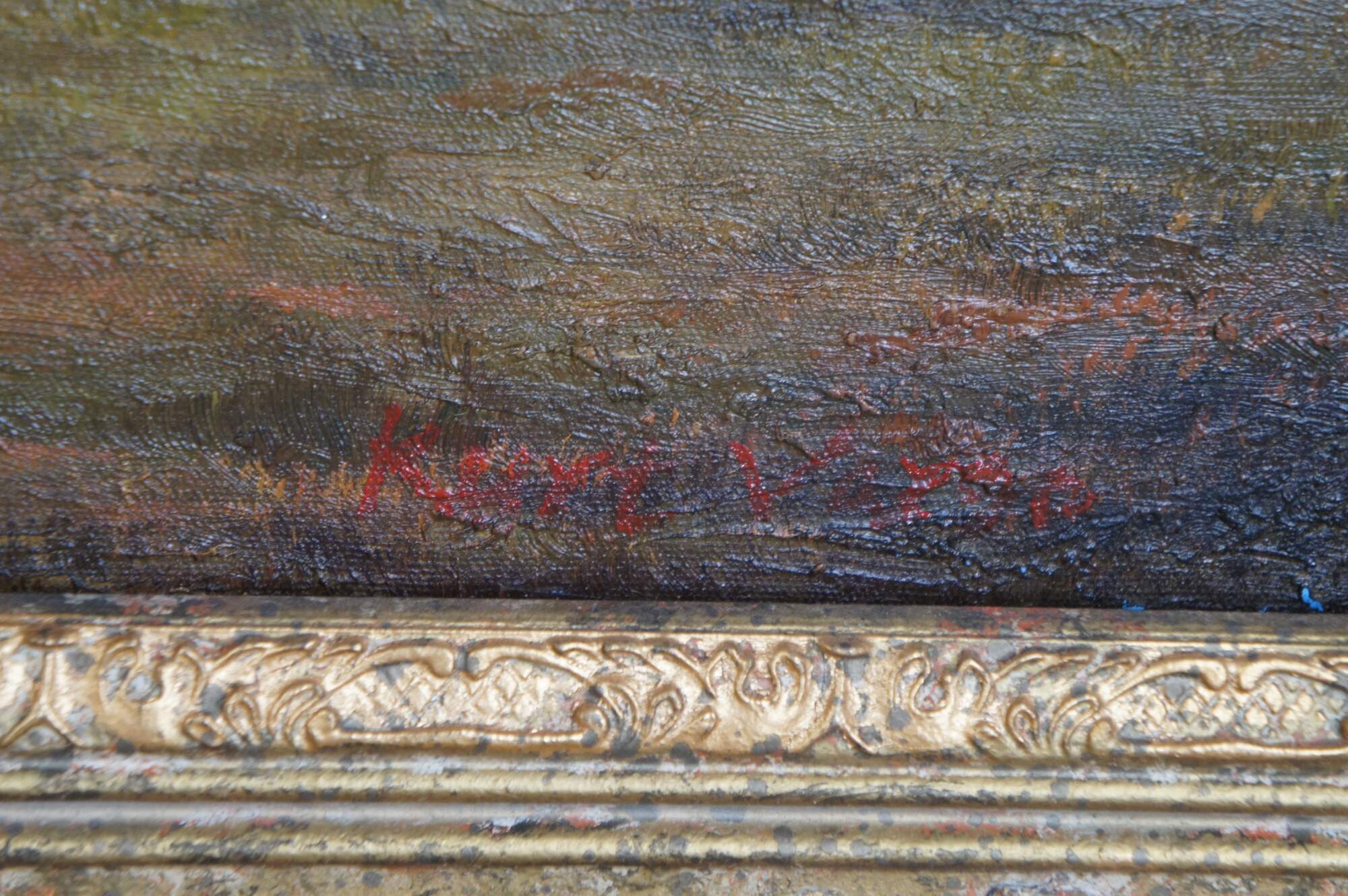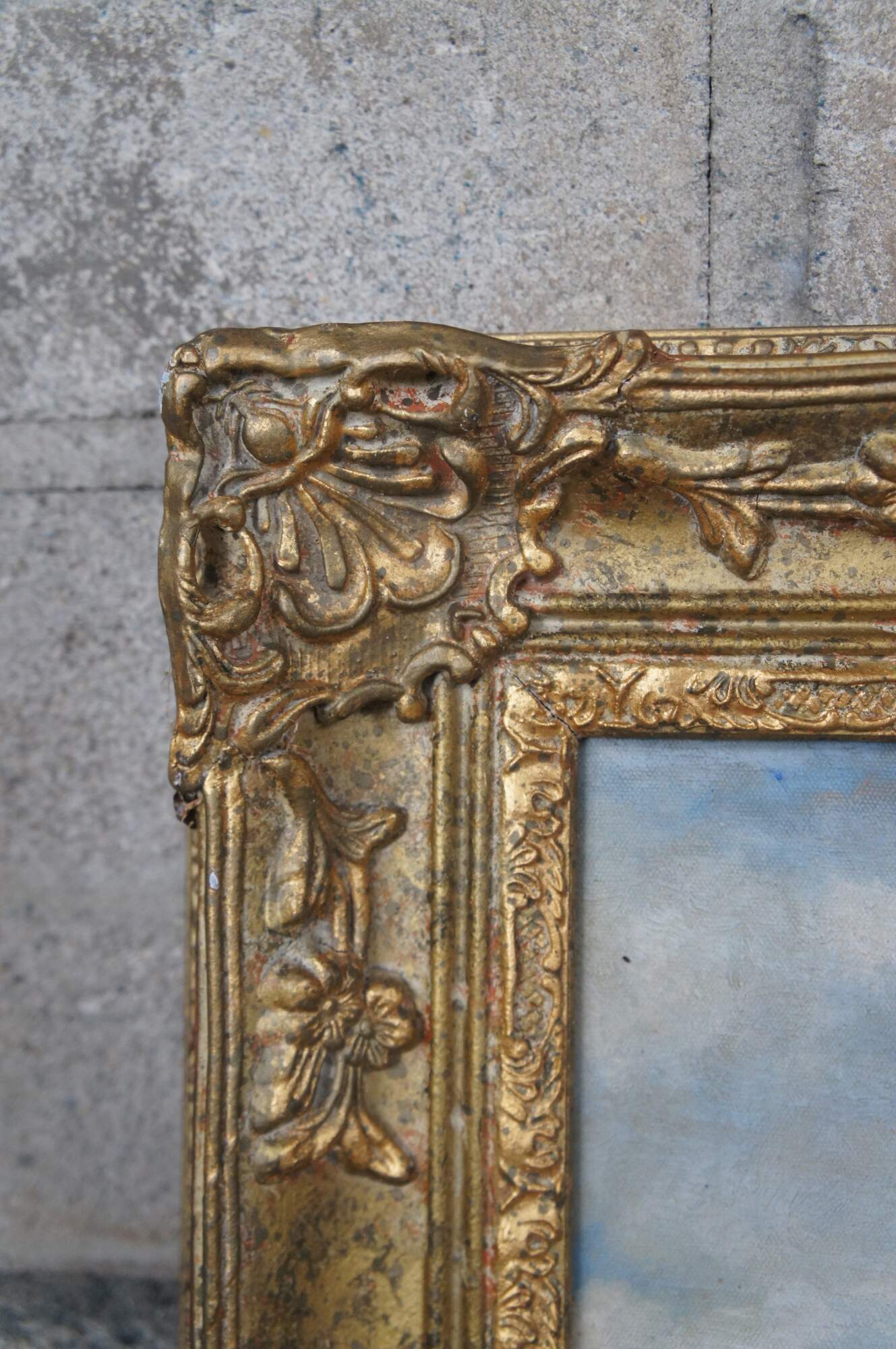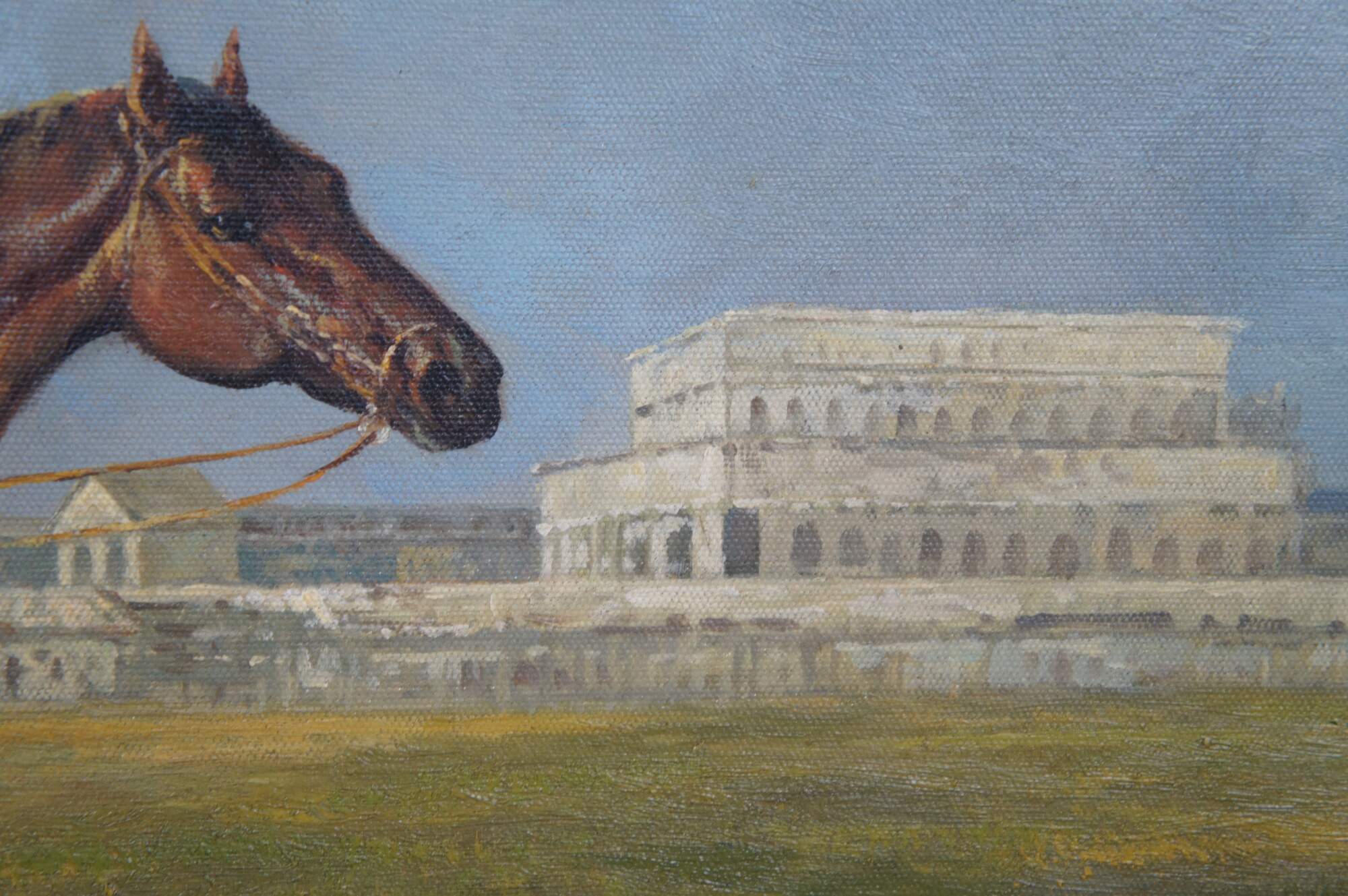 20th Century painting after Benjamin Cam Norton's Rowley Mile. Unsigned. Features a Jockey in red posing on his race horse. The painting is framed in gold.