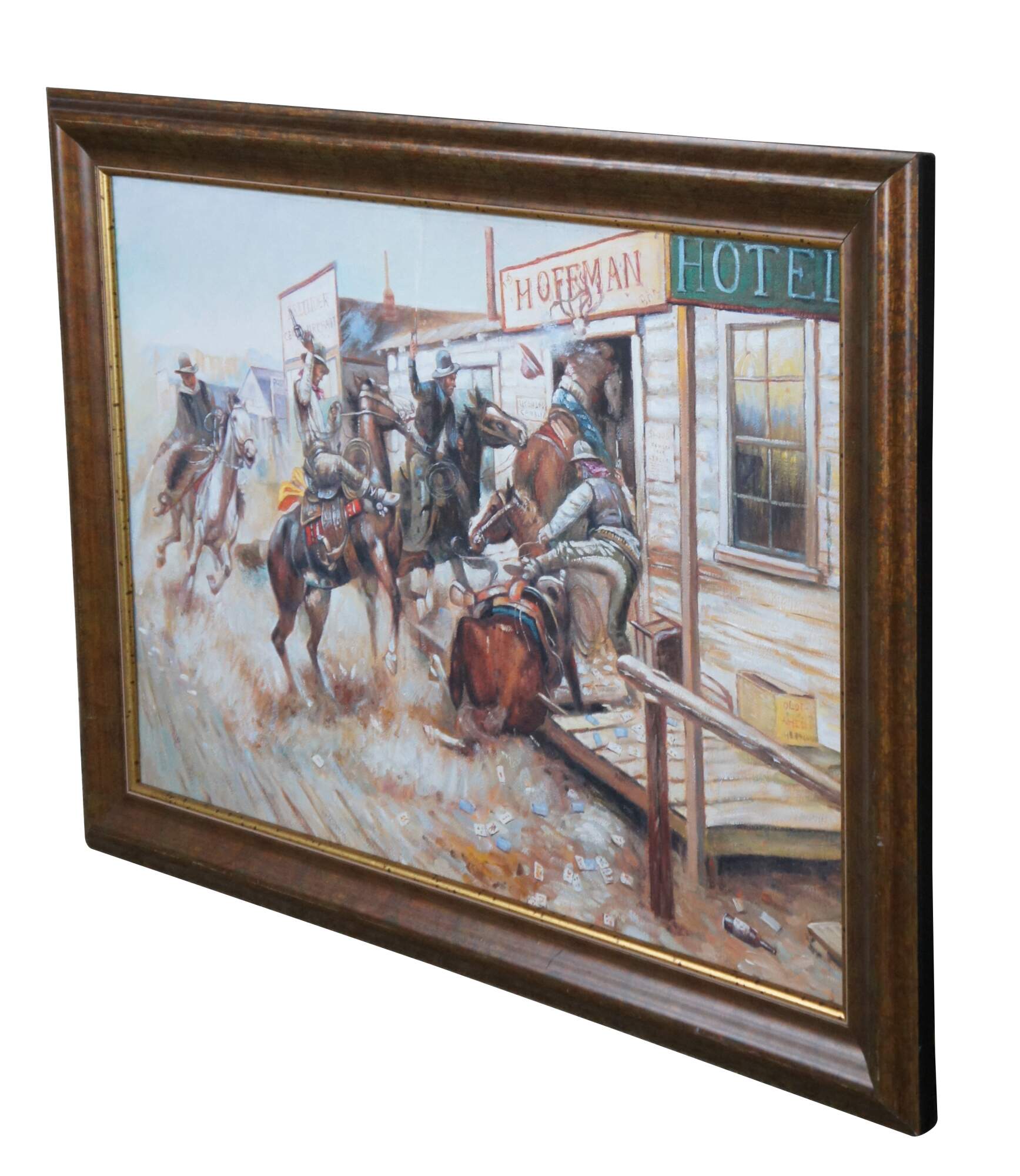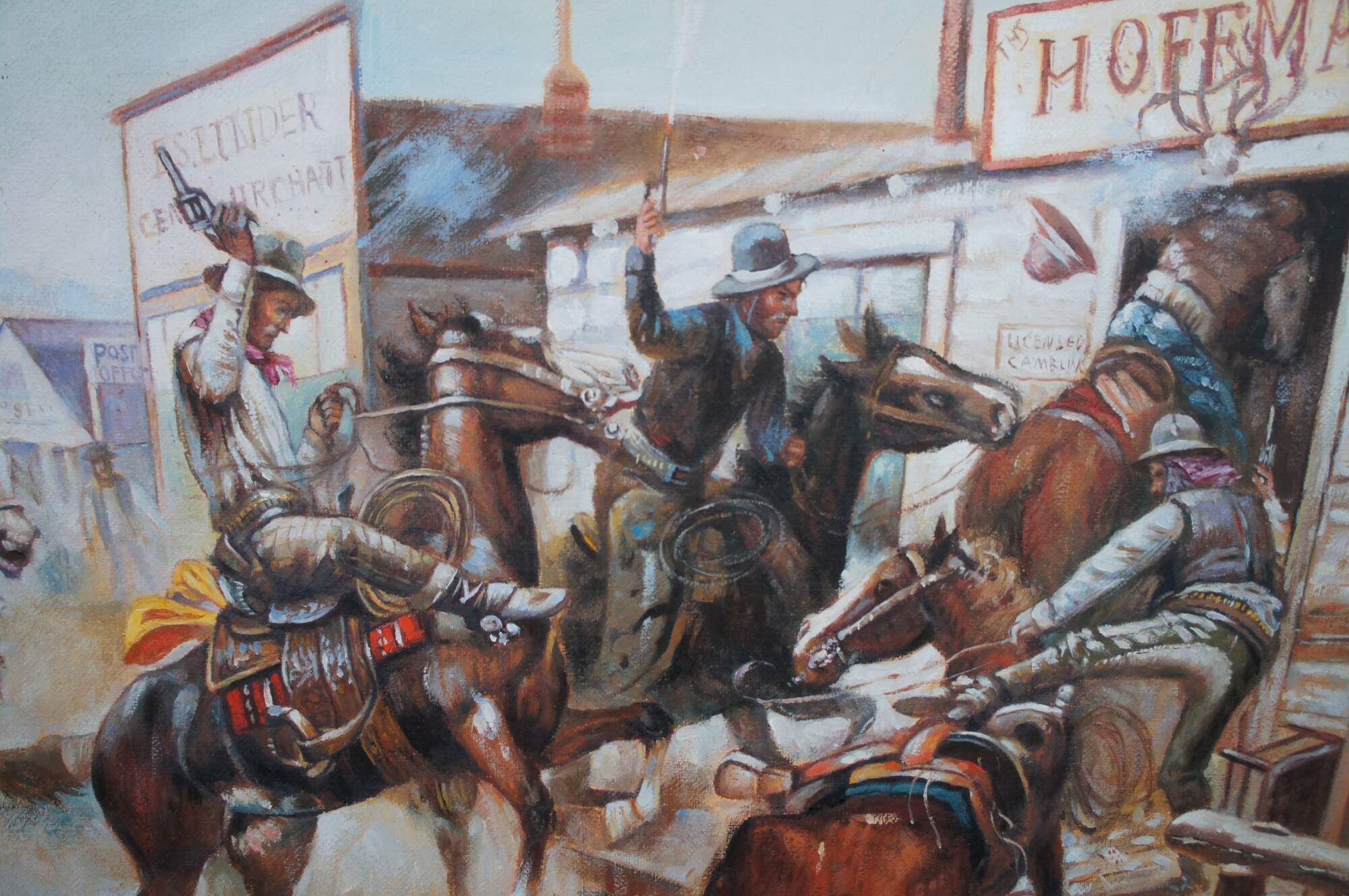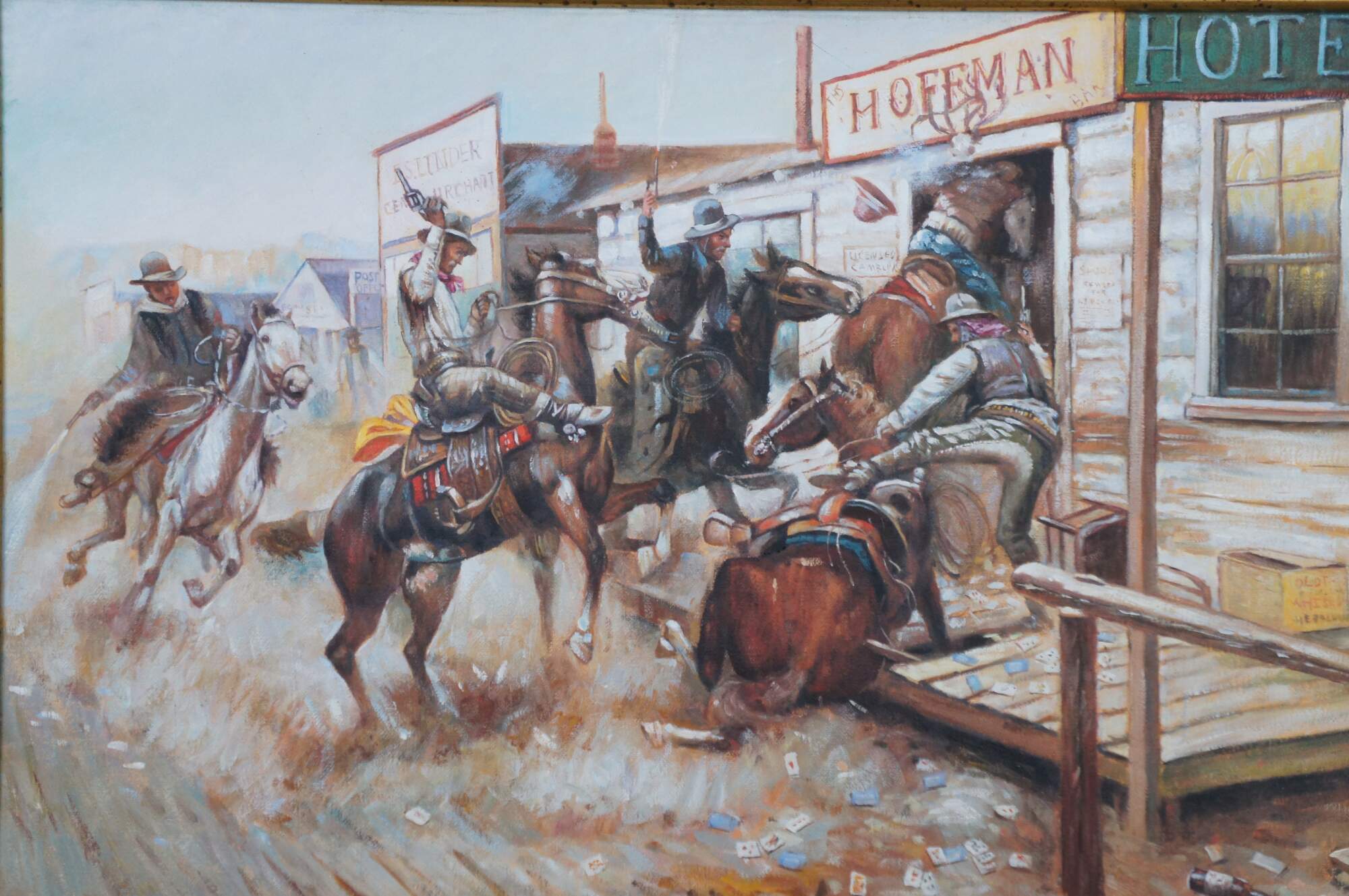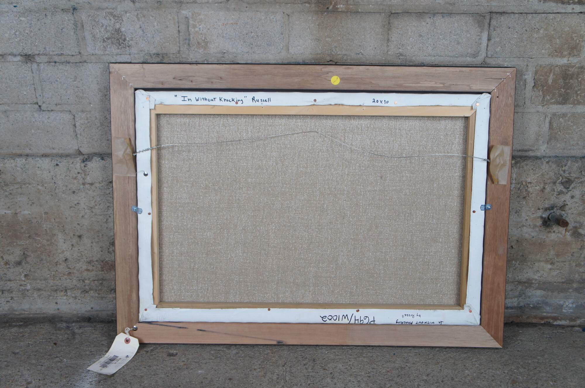 A large reproduction painting of "In Without Knocking" by Charles Marion Russell. Unsigned, framed in wood. Circa last quarter 20th century.