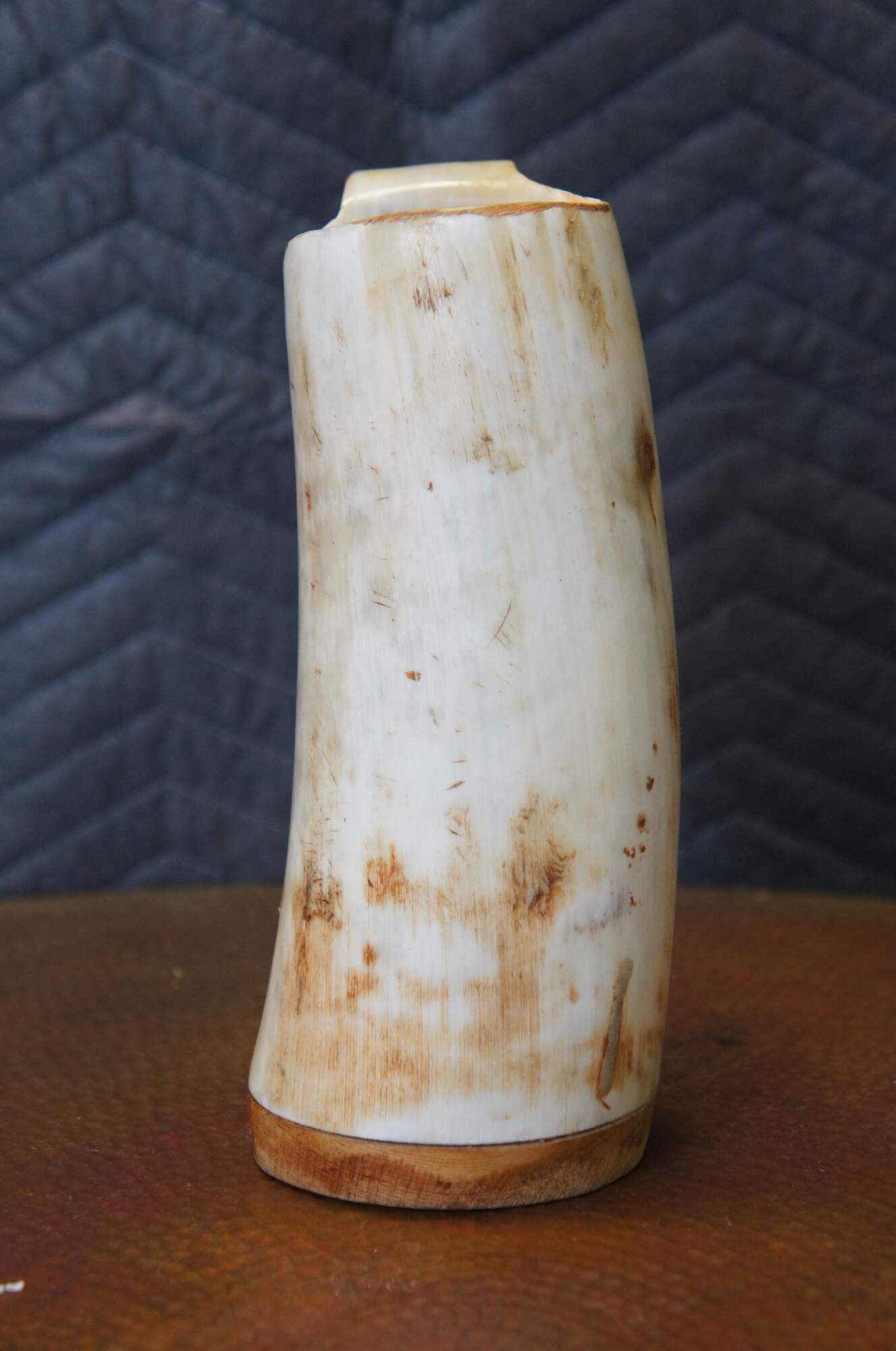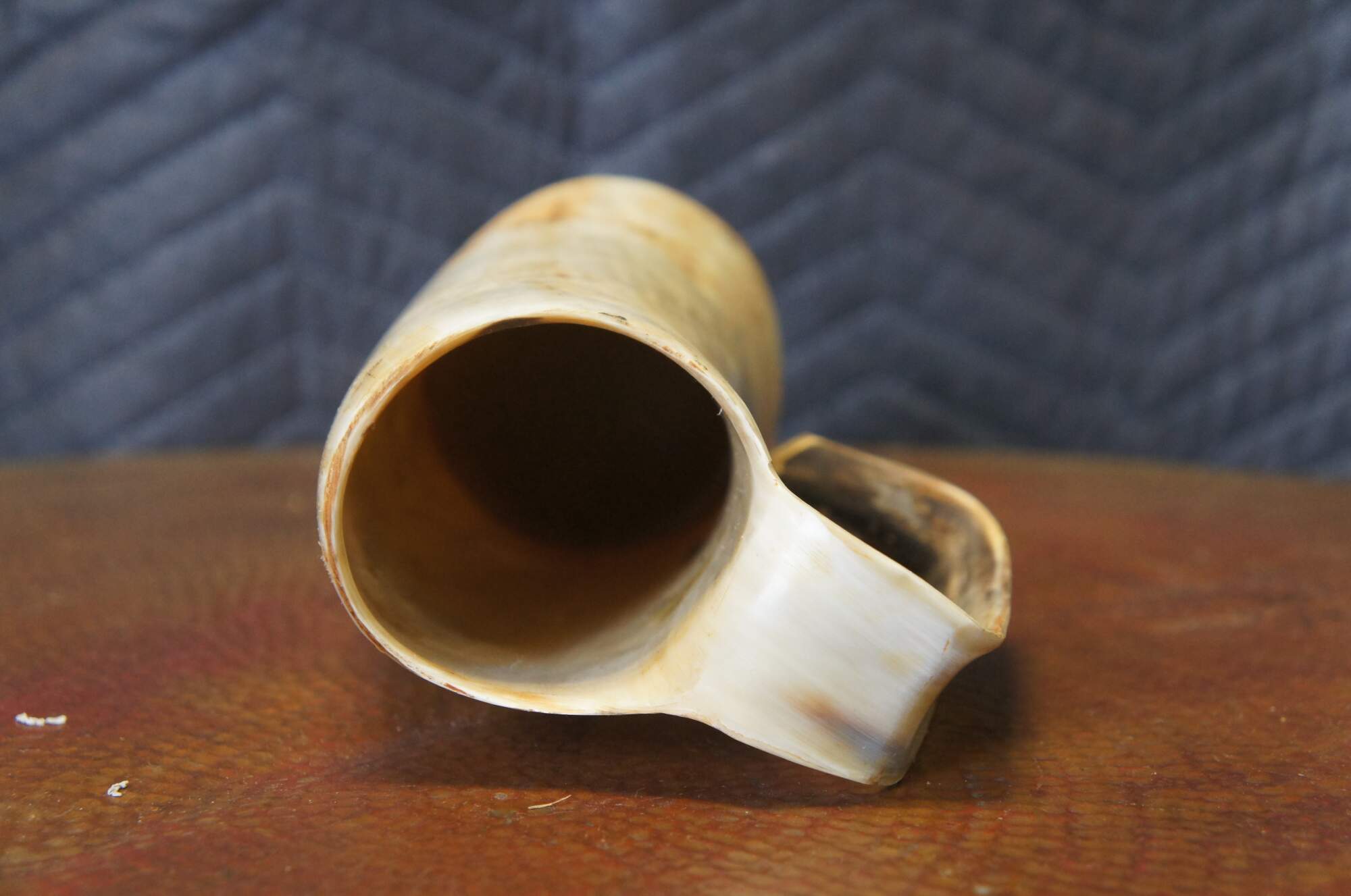 Late 20th century natural horn Viking / Renaissance Festival style drinking mug with resin coated wood base. Crafted by Handfaste. Made in Sweden.