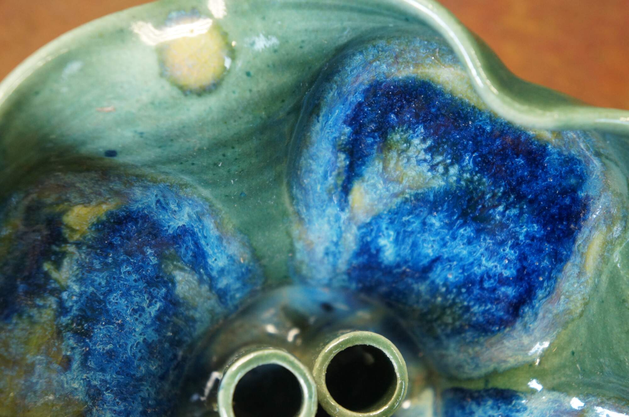 Late 20th century ceramic ikebana / flower bowl featuring a ruffled flower shaped upper edge and three flower frogs / tubes fixed at the center, with holes at the base for water to reach the flowers. Glazed in green, blue and yellow. Ikebana is the Japanese art of floral arrangment.
