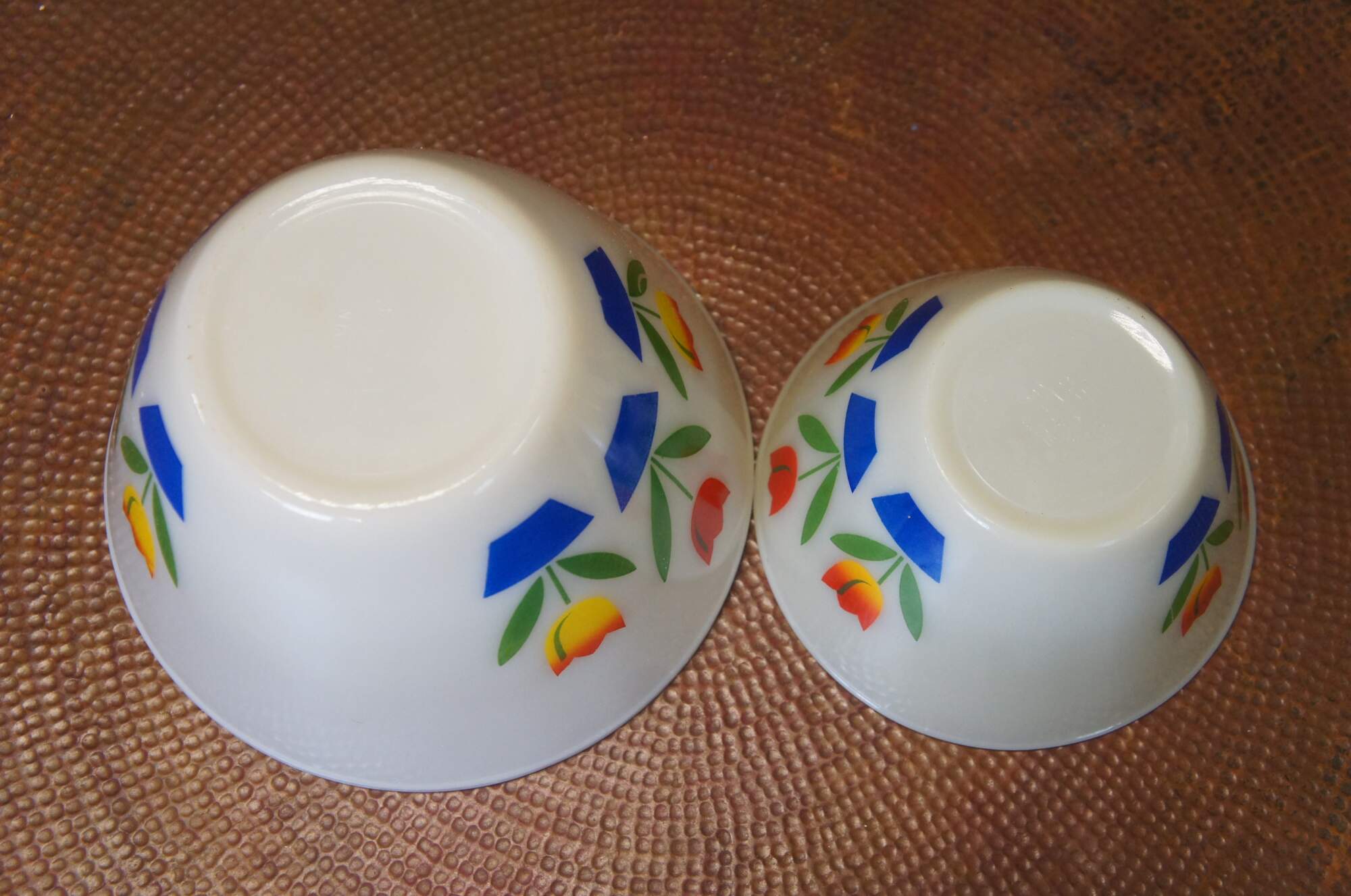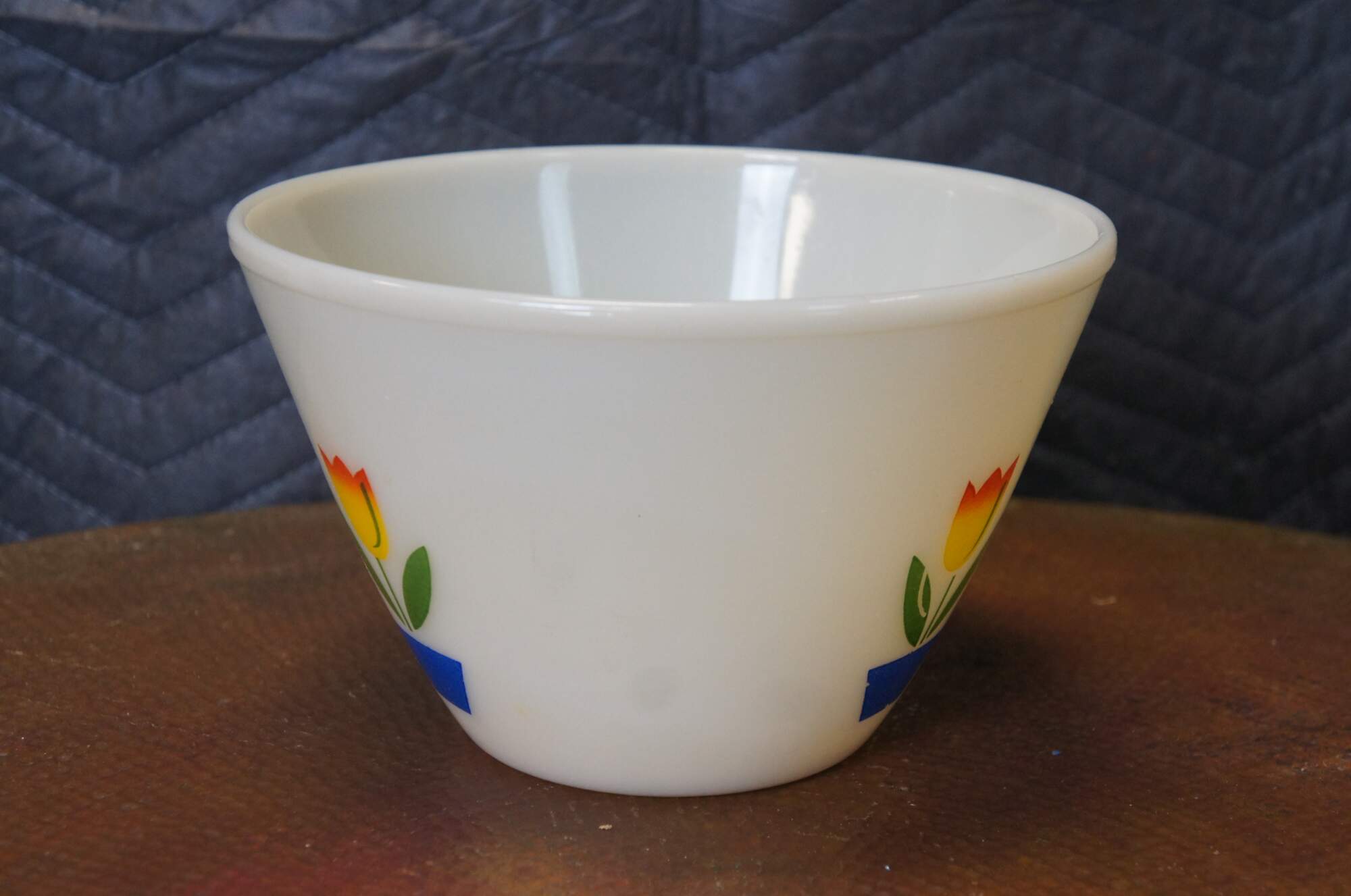 Pair of mid 20th century Fire-King Oven Ware nesting mizing bowls by Anchor Hocking. Conical shape of off white semi-translucent glass, printed with a pattern of primary color red and orange tulips in little blue pots. Produced circa 1948-1950 (Dating: https://firekinggrill.com/fireking-jadeite-dish-markings/#google_vignette)