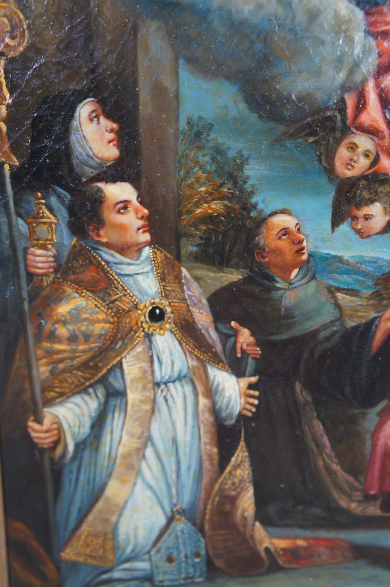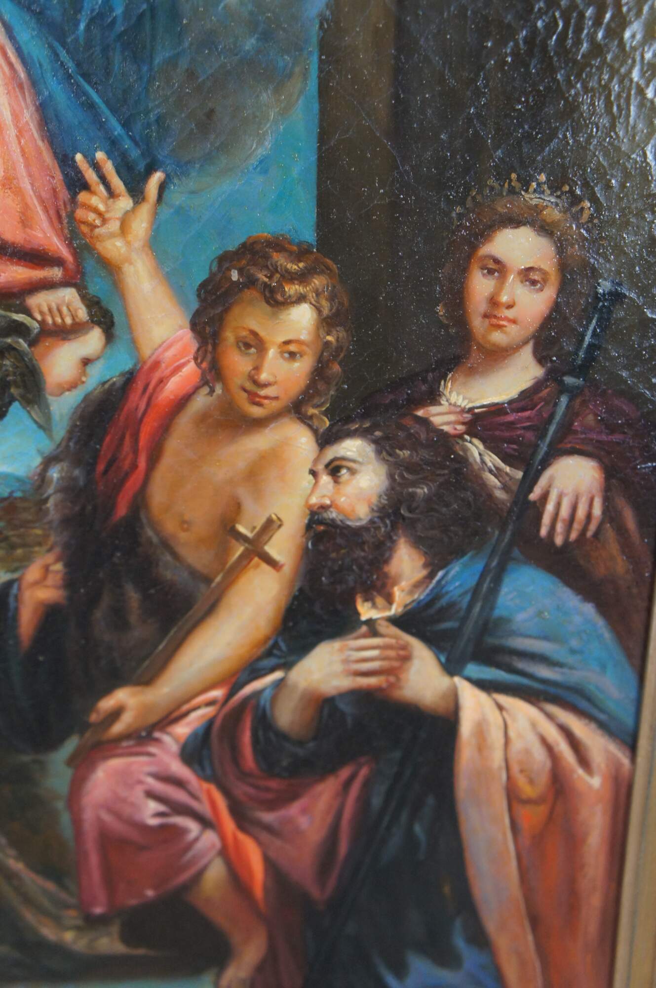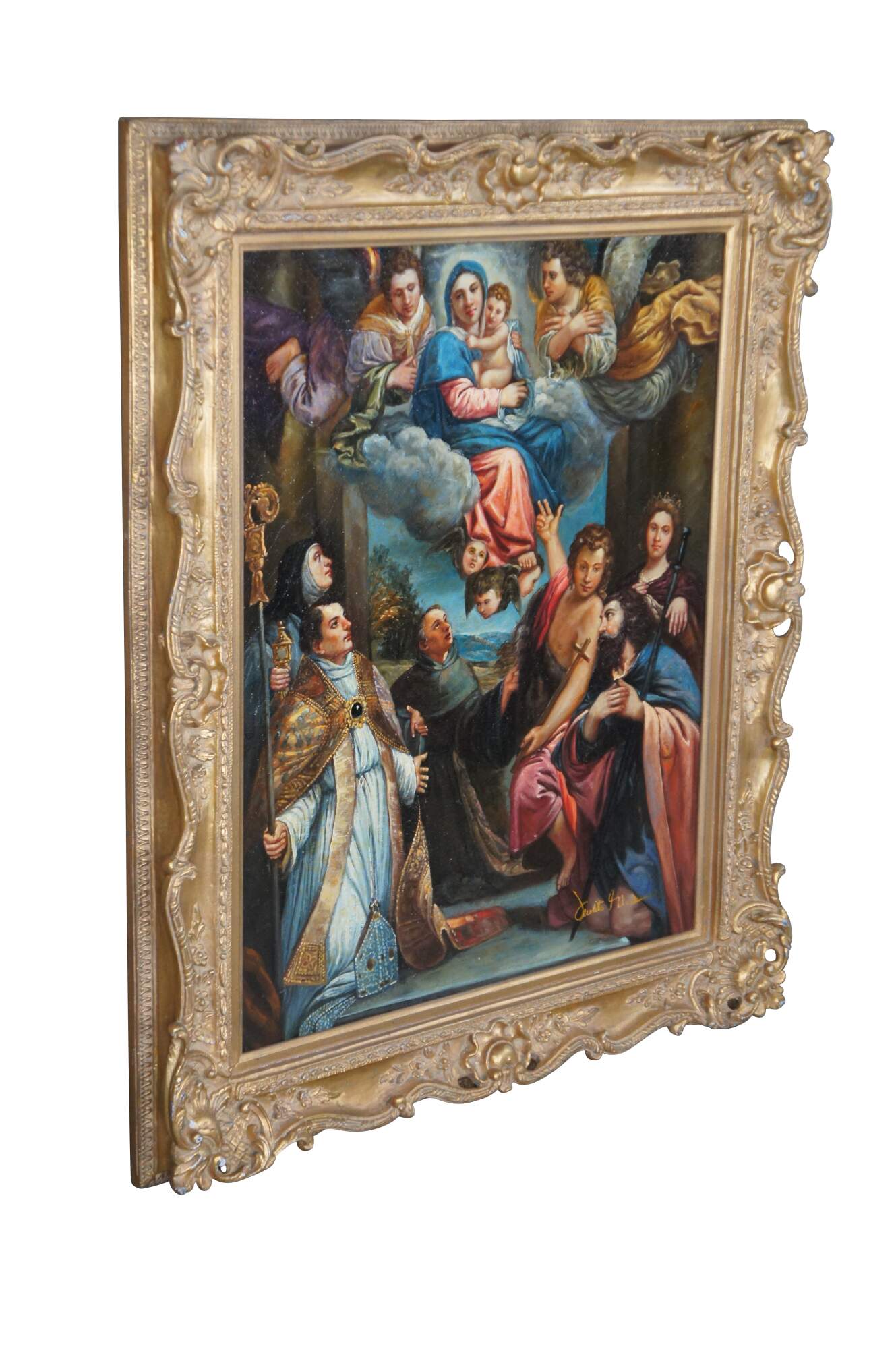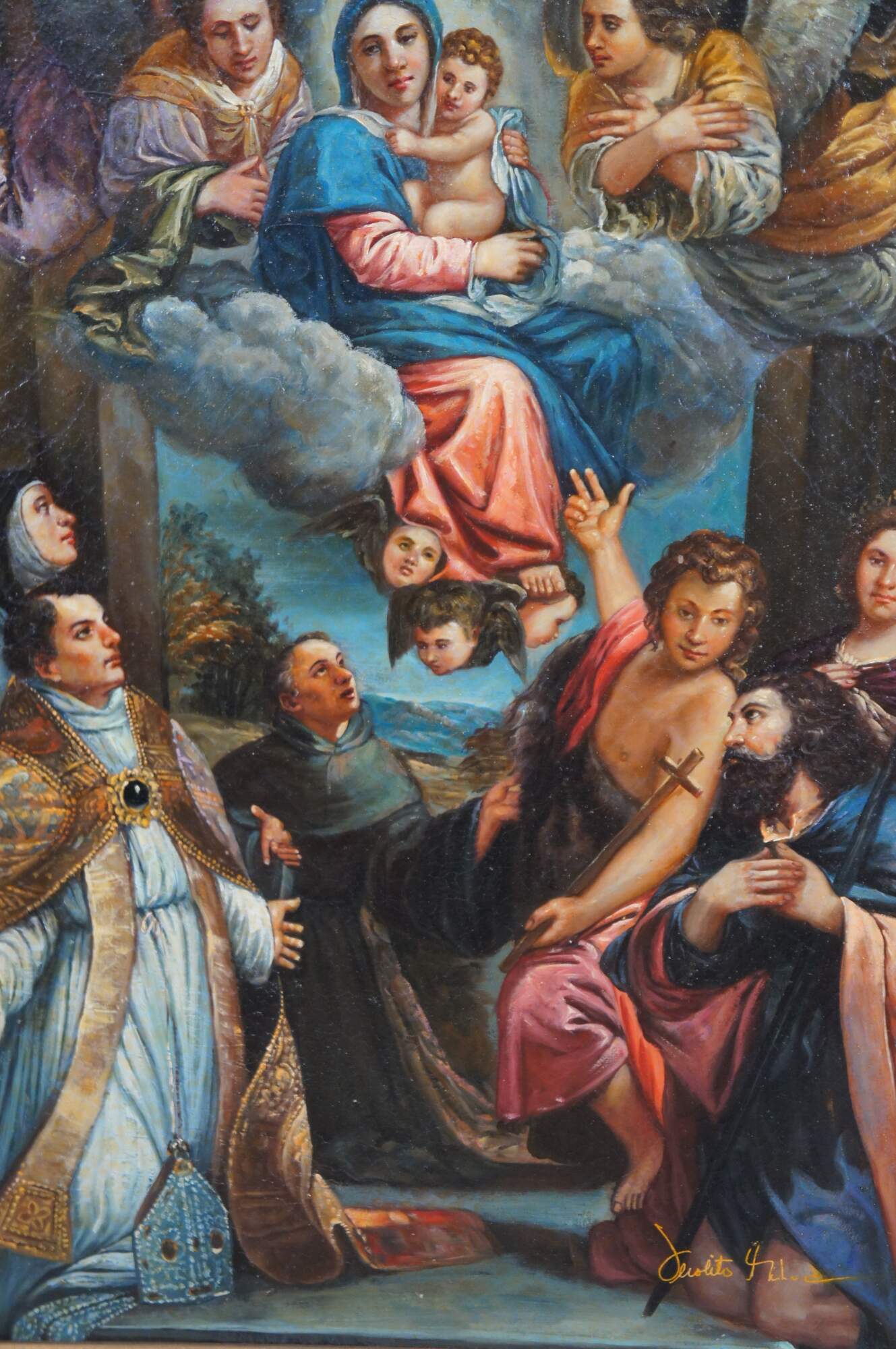 Madonna in Glory with Saints" a Contemporary School oil painting after Anibale Carracci. The oil painting is on canvas with craquelure giving off the appearance of age. Signed lower right and framed in Baroque manner with gold finish. The original was painted during the 16th century and is in the ePinacoteca Nazionale di Bologna collection in Italy.