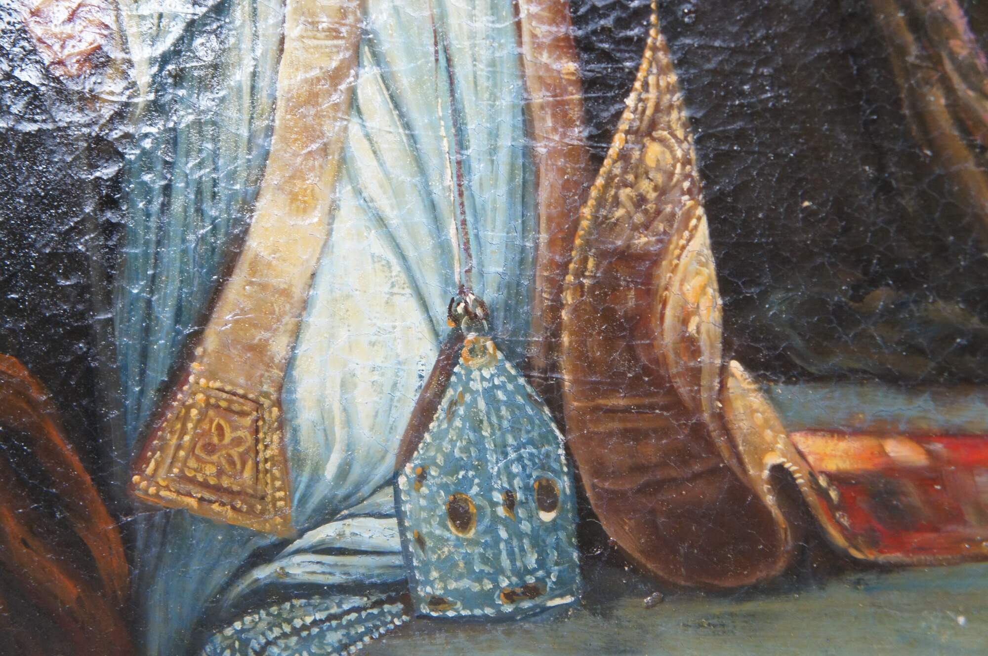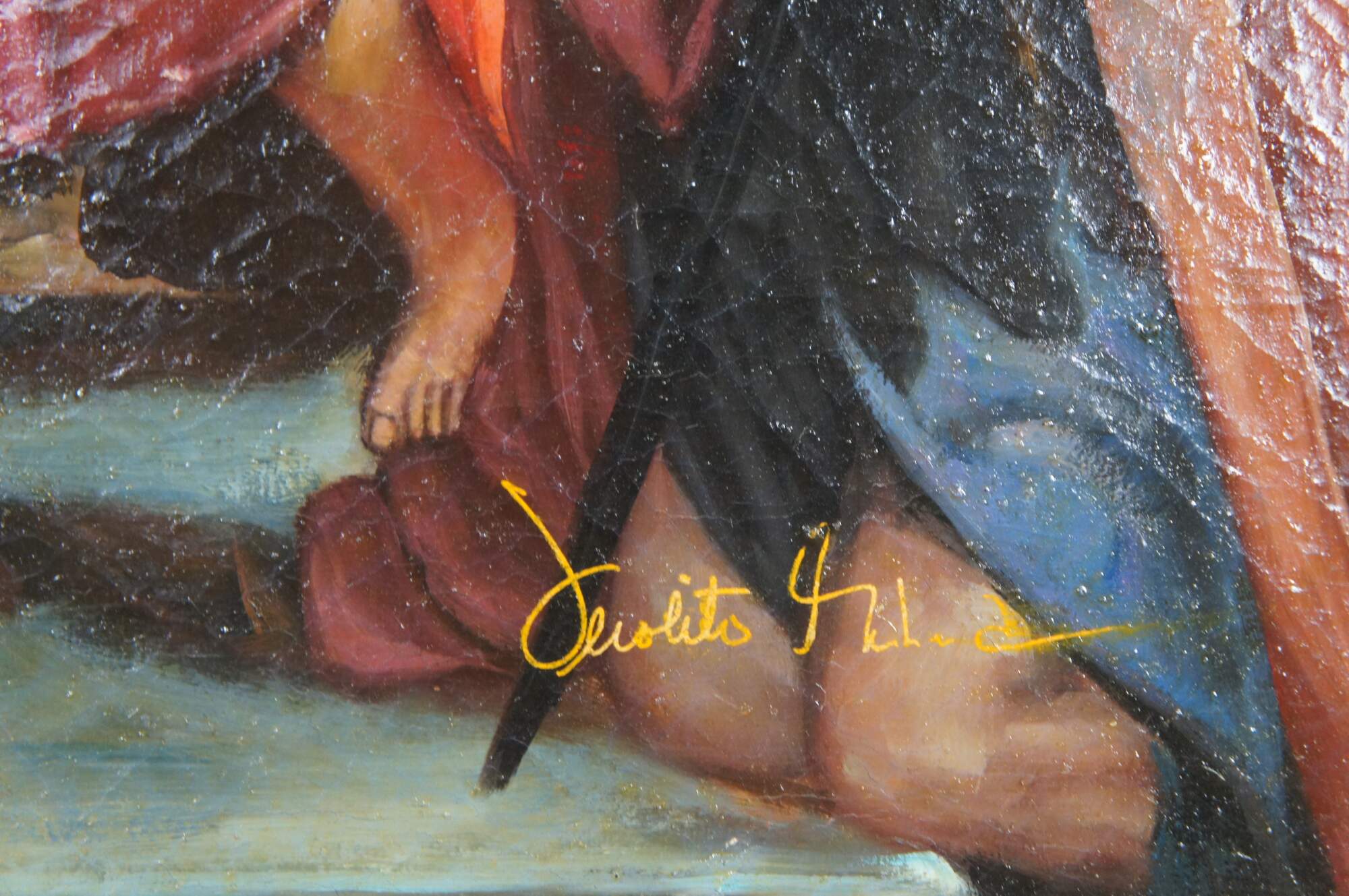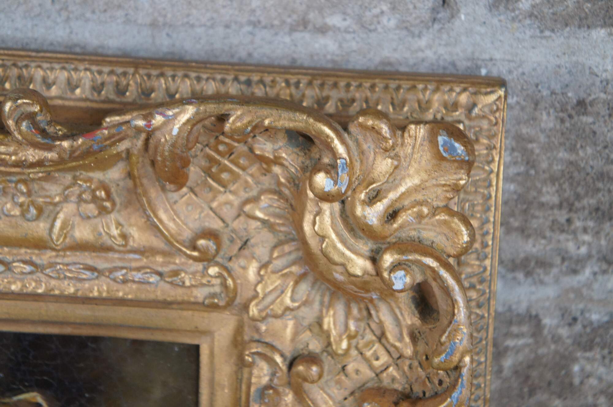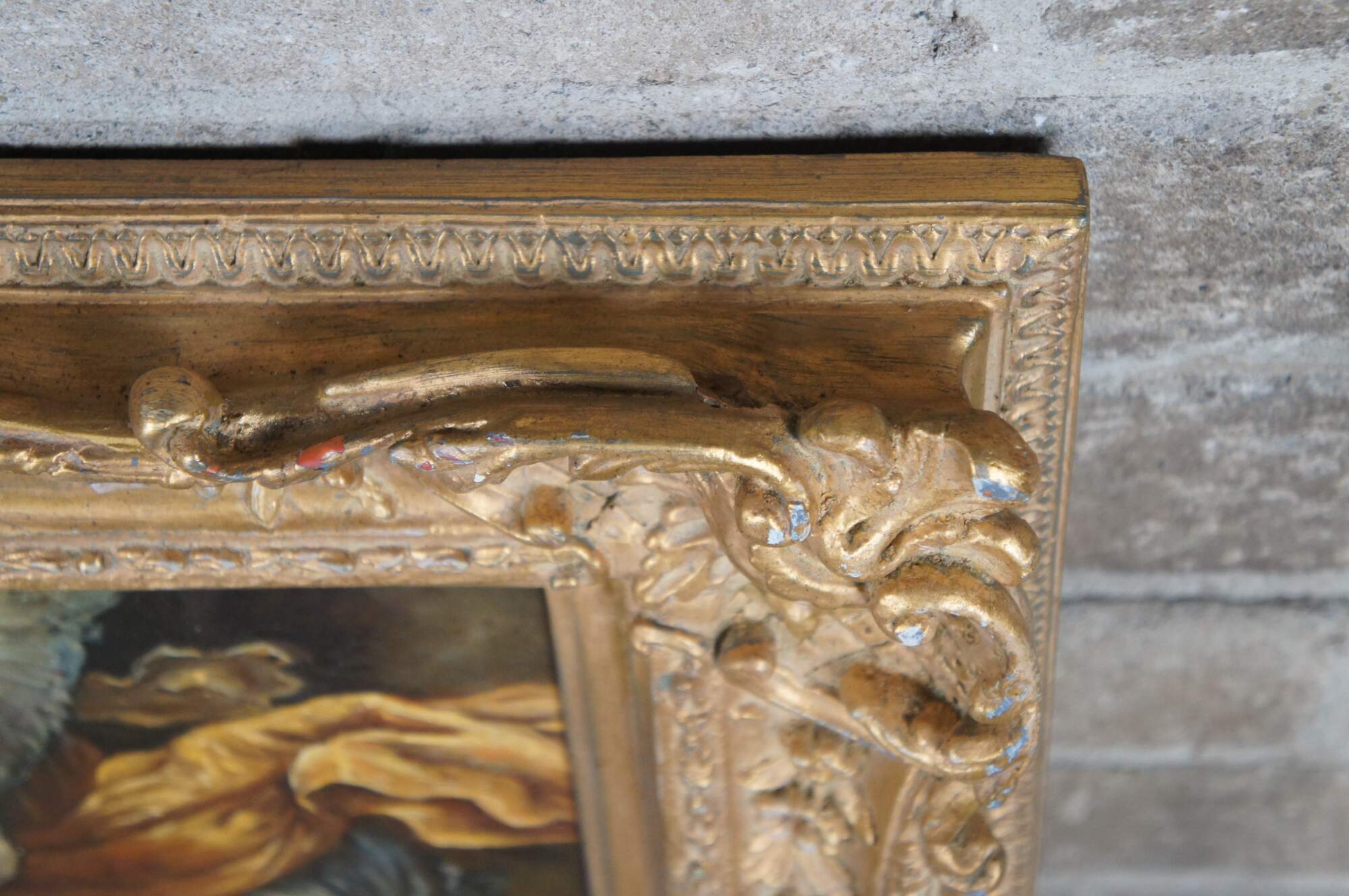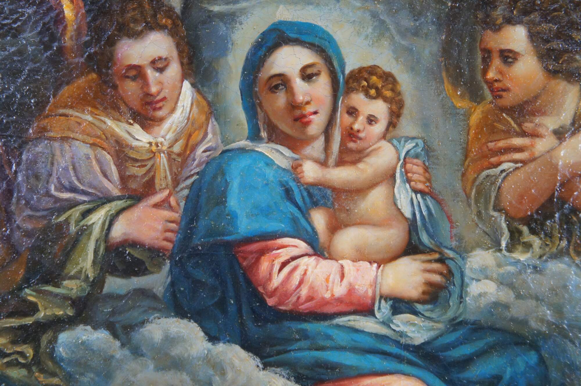 Madonna in Glory with Saints" a Contemporary School oil painting after Anibale Carracci. The oil painting is on canvas with craquelure giving off the appearance of age. Signed lower right and framed in Baroque manner with gold finish. The original was painted during the 16th century and is in the ePinacoteca Nazionale di Bologna collection in Italy.