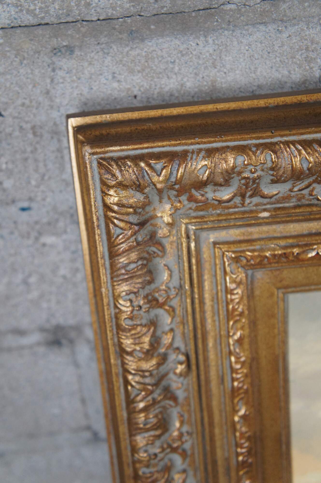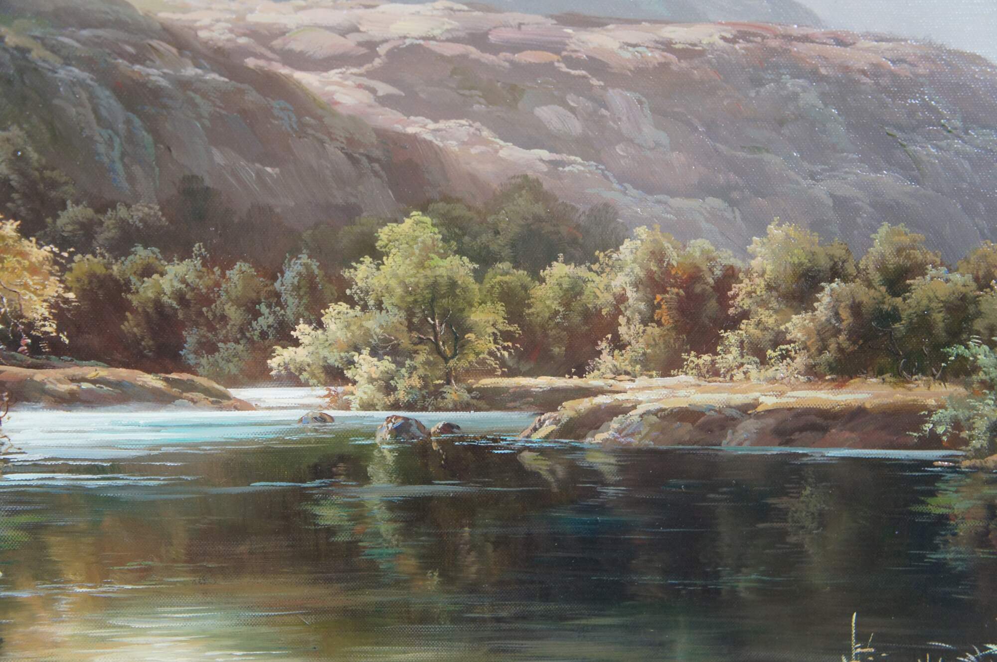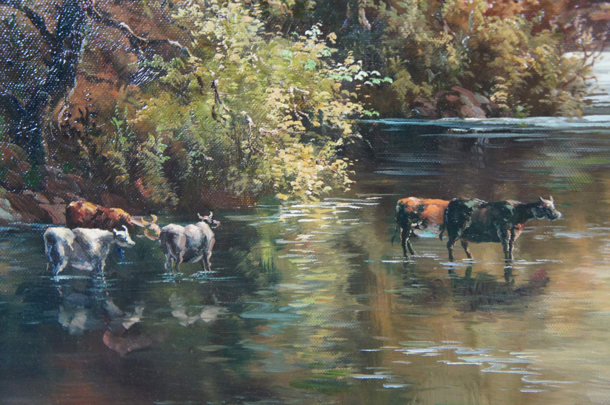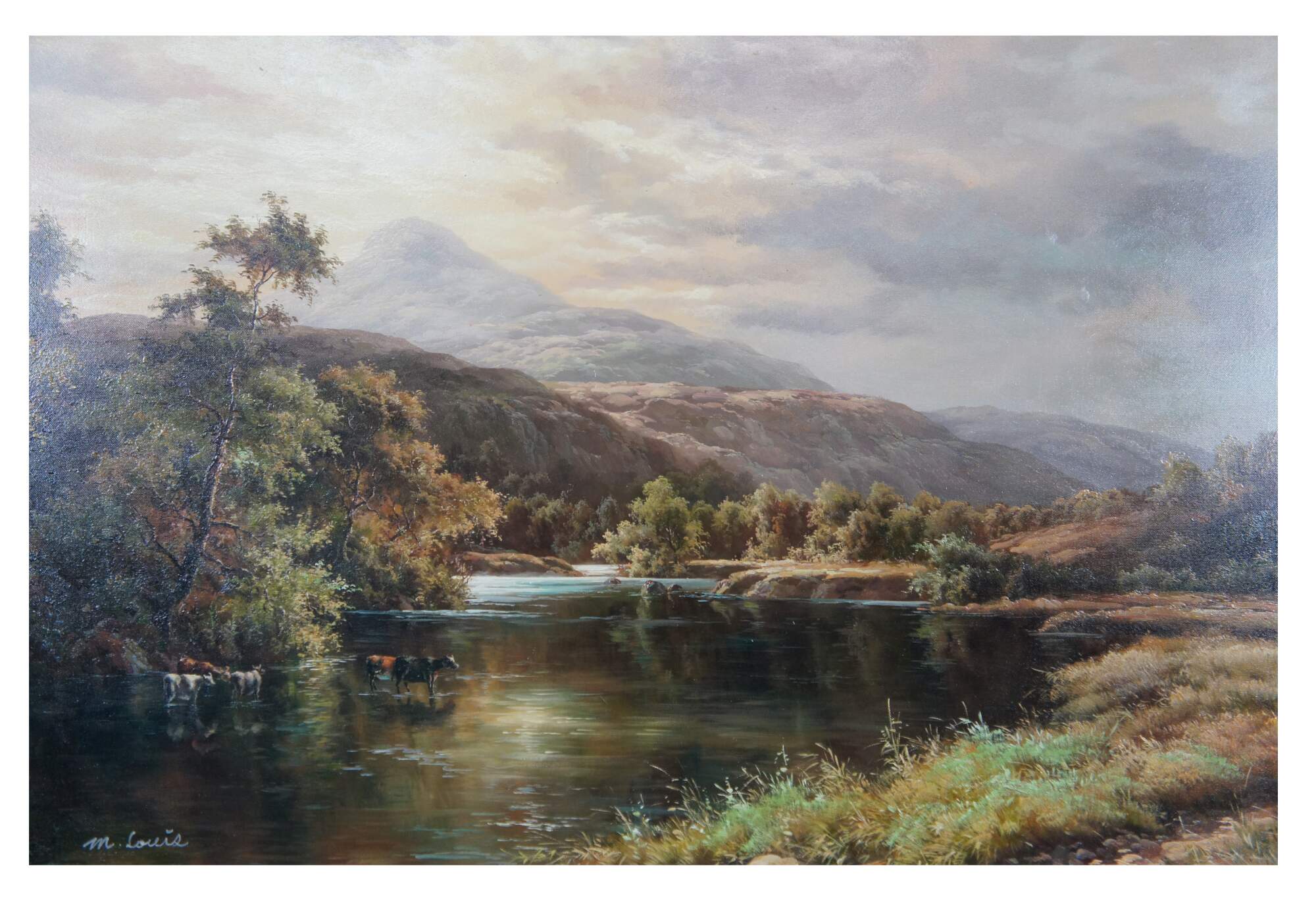 Late 20th Century Pastoral River landscape. Signed lower left. Features a woodland view of the countryside with cattle relaxing in the river infront of a mountainous backdrop. The oil painting is on canvas and signed M. Louis along the lower left. Features a trodational frame finished in gold with acanthus detail.