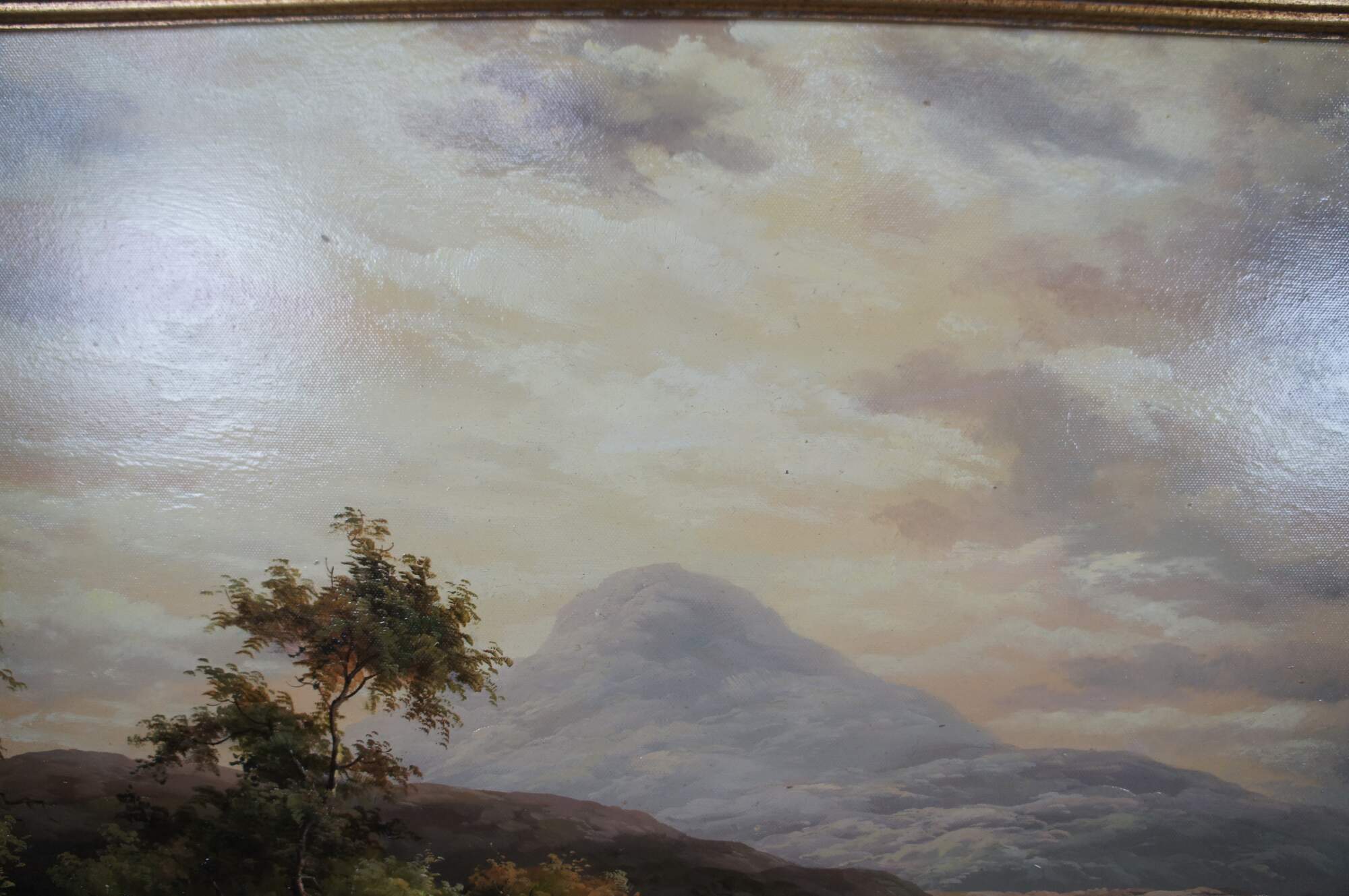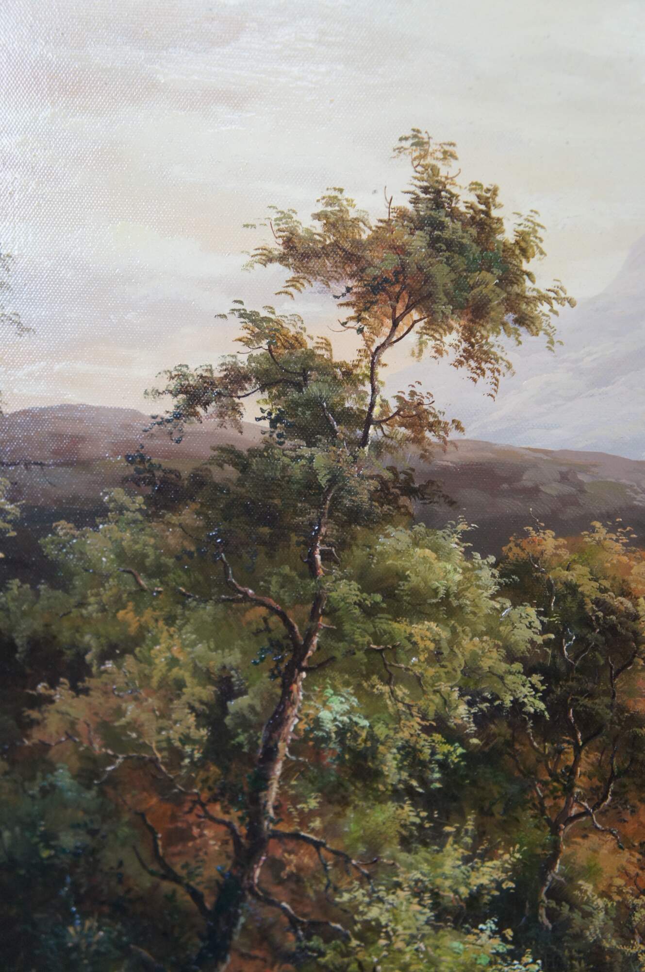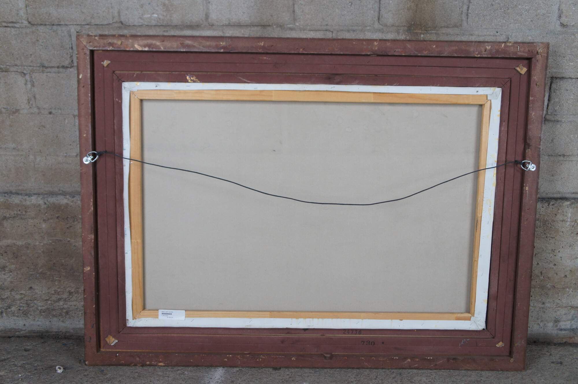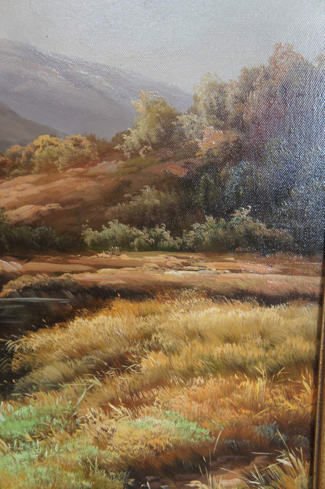 Late 20th Century Pastoral River landscape. Signed lower left. Features a woodland view of the countryside with cattle relaxing in the river infront of a mountainous backdrop. The oil painting is on canvas and signed M. Louis along the lower left. Features a trodational frame finished in gold with acanthus detail.