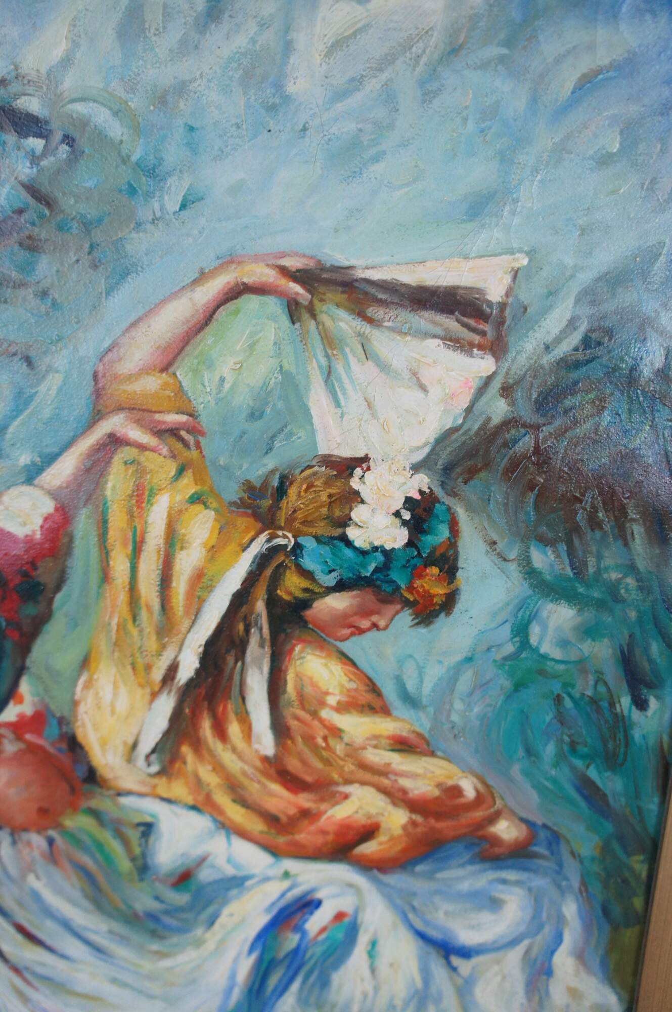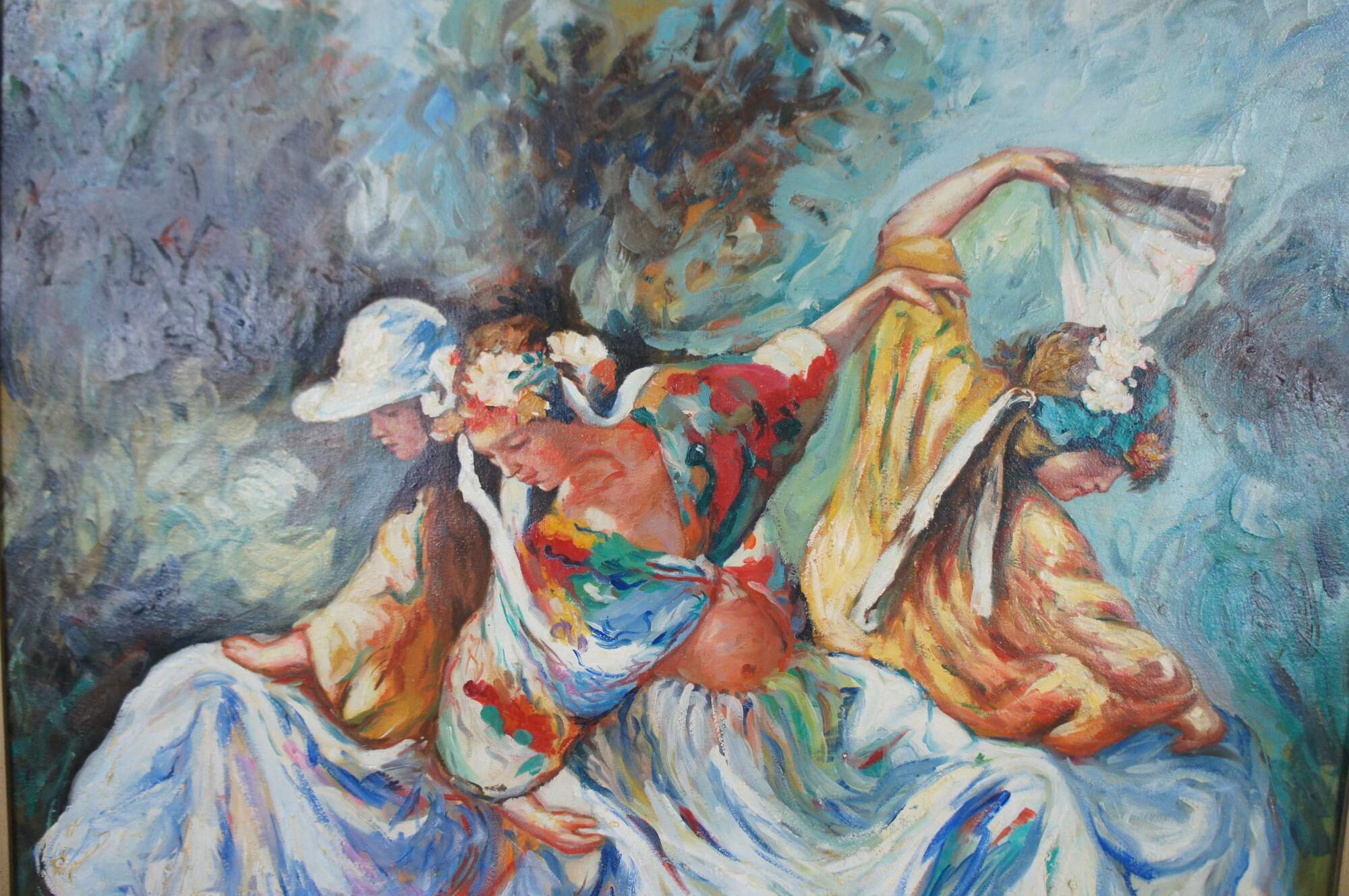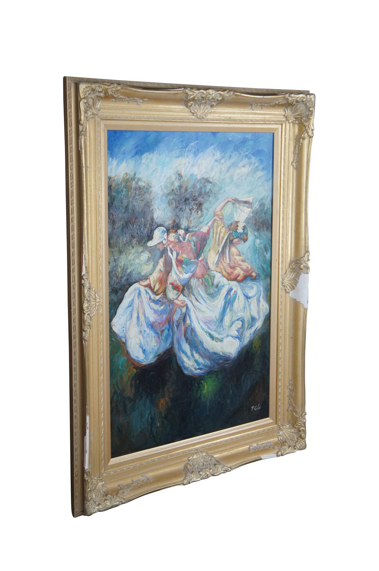 Alegoria De La Danza by P. Cole After Jose Royo (Spanish, B. 1941). The oil painting depicts three women in impressionist style dancing in flowing dresses surrounded by foliage. Signed lower right, canvas framed in French manner with gold finish.