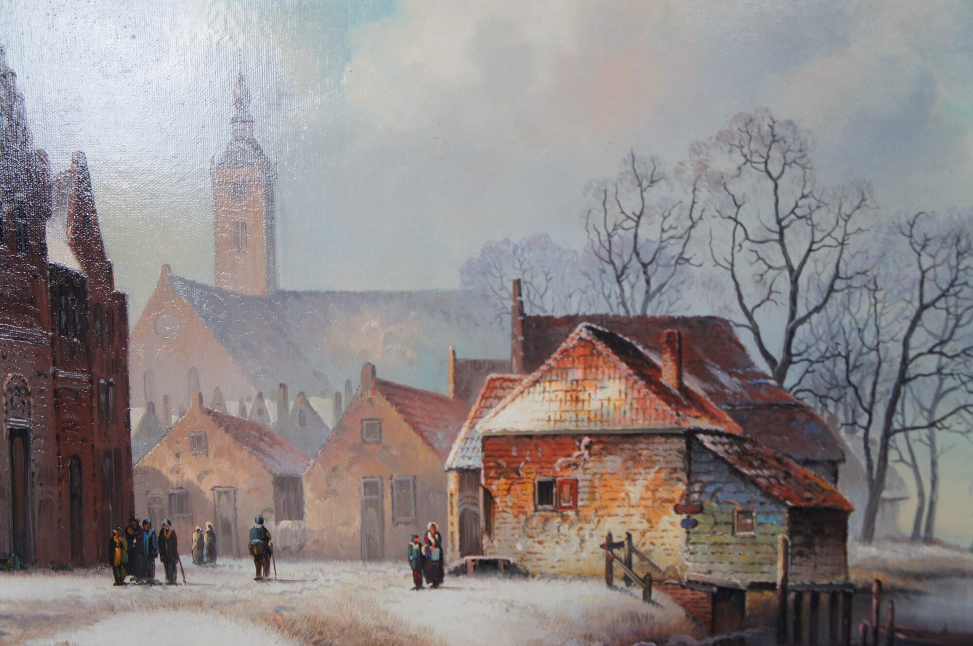 20th Century Dutch oil painting on canvas by David Ronald, signed lower left. The painting showcases a coastal village or town in winter. Figures can be seen playing over the frozen water and within the town. Framed in wood with ribbed accents.