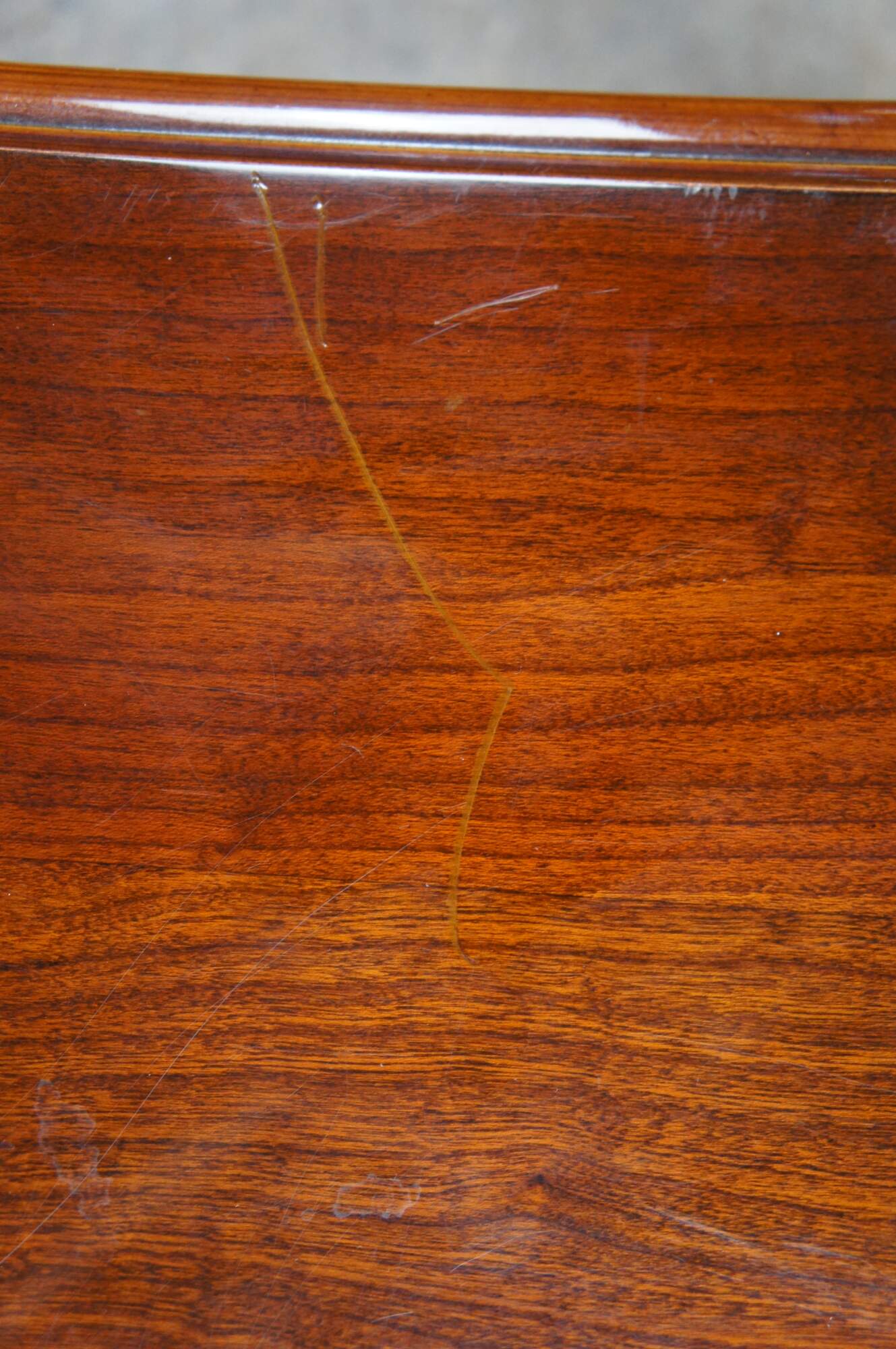 Vintage Queen Anne style side tables featuring rectangular form with serpentine legs, pad feet and one drawer with federal / colonial brass hardware.