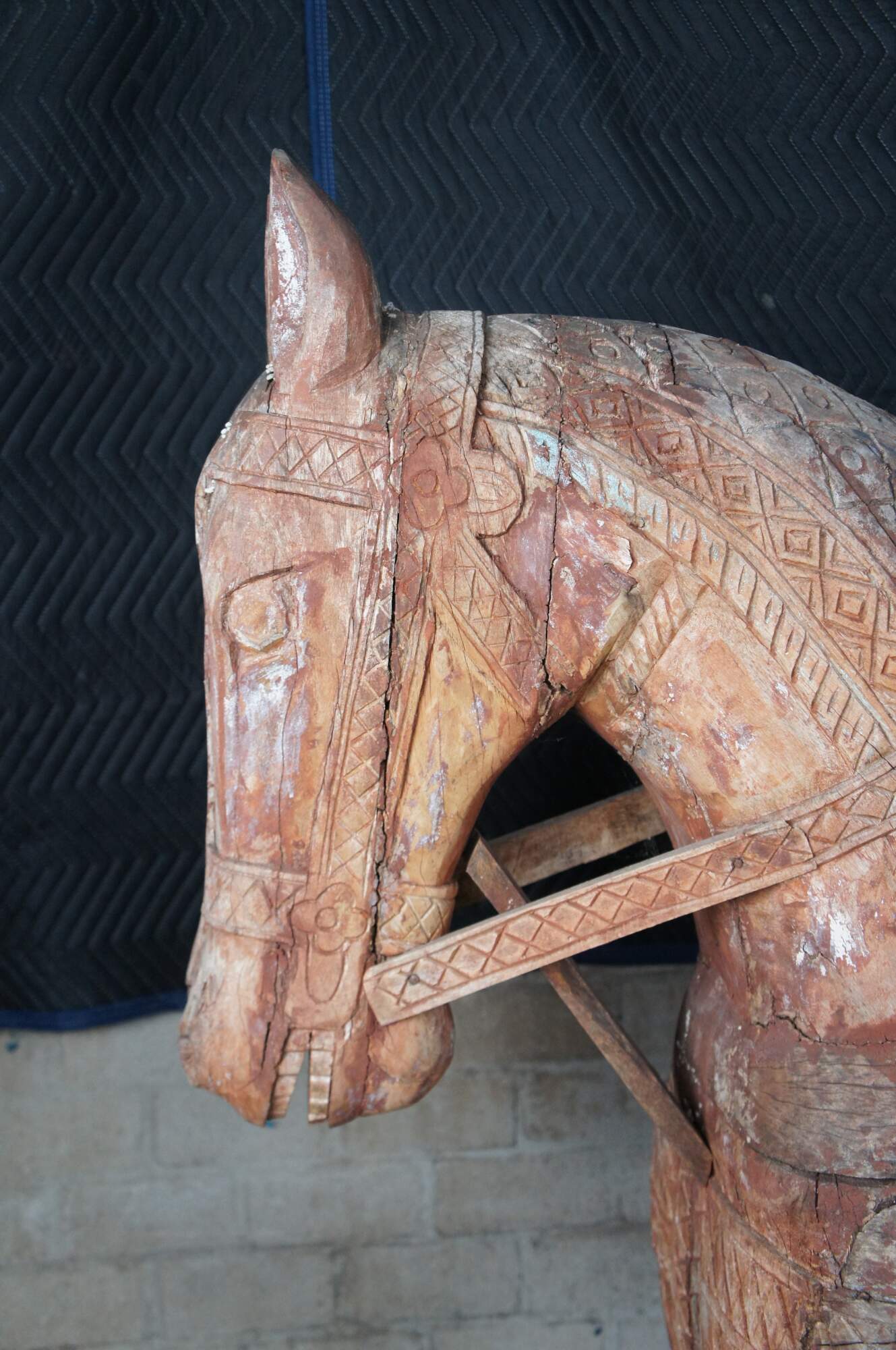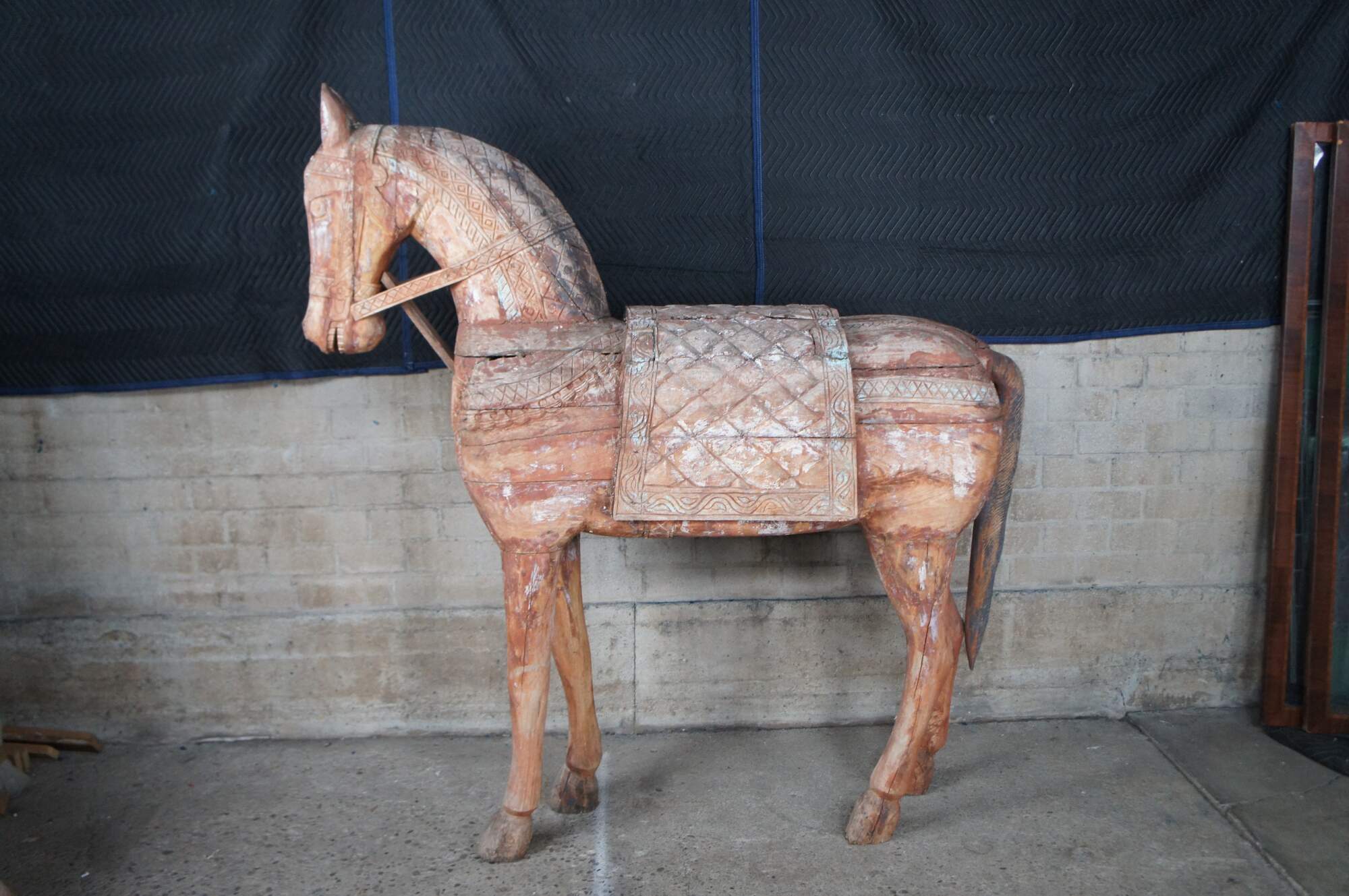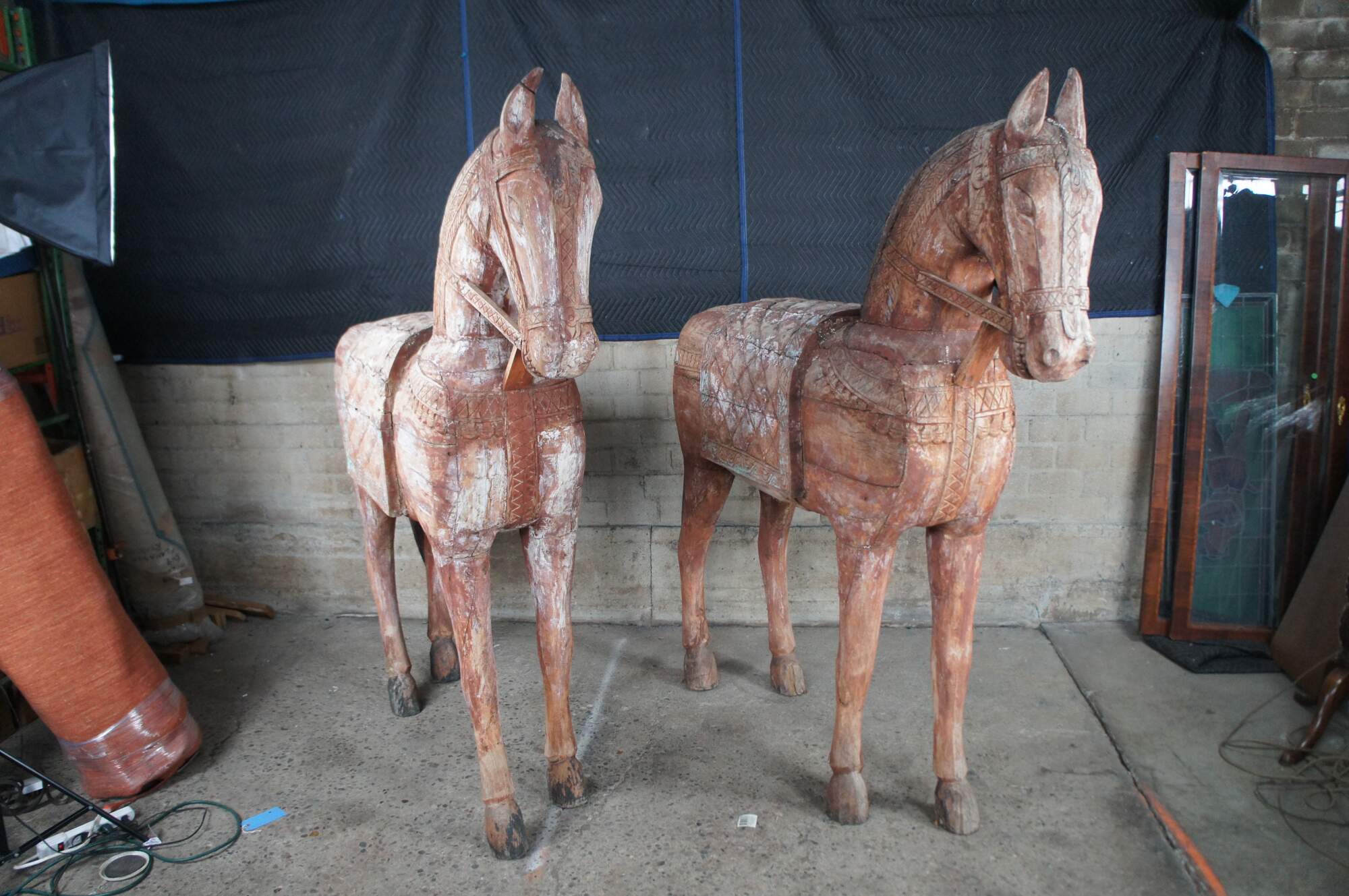 Very impressive pair of vintage lifesize horse sculptures or statues. Made of wood featuring a primitive / rustic asian design. Very heavy and sturdy.