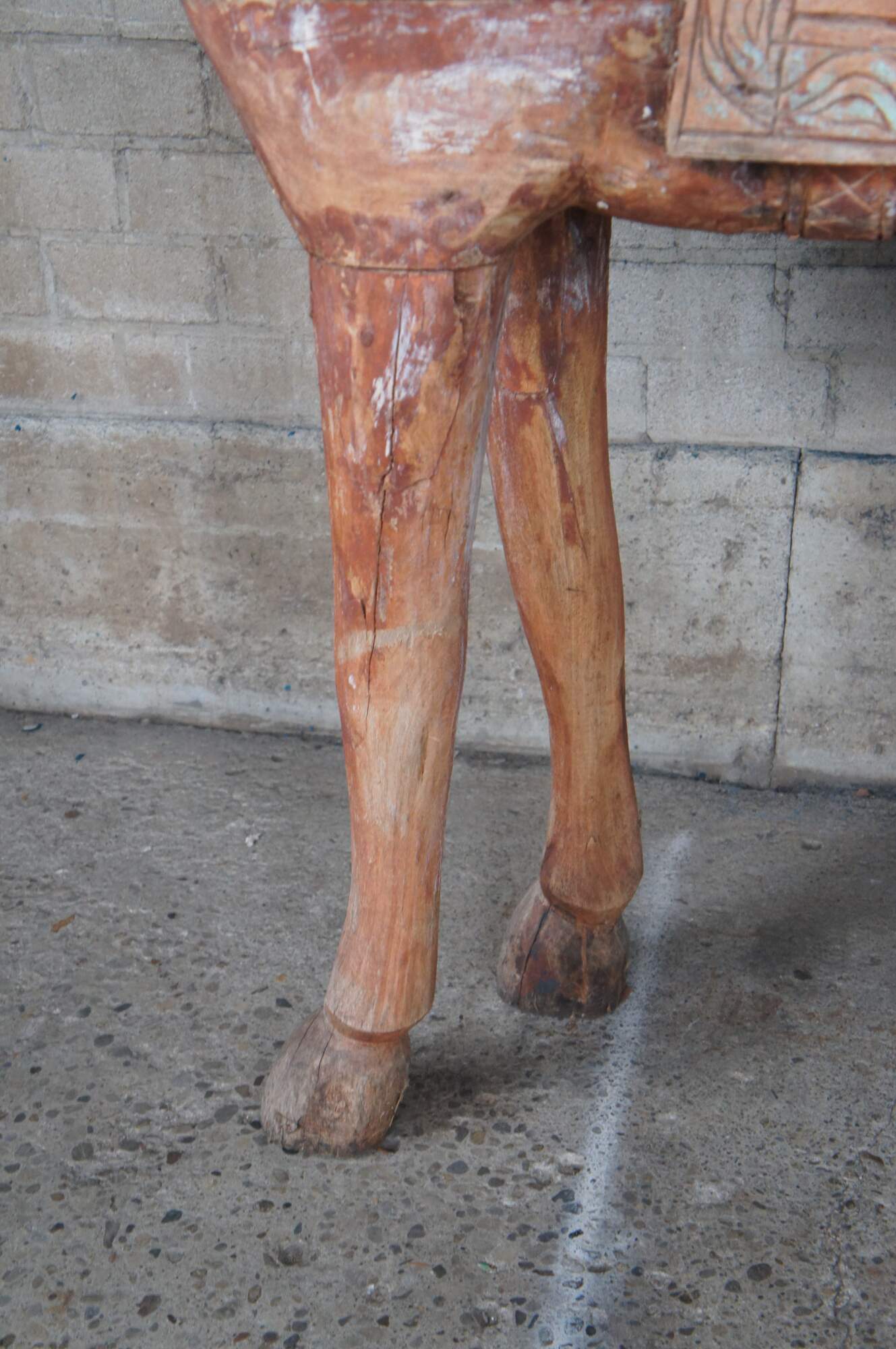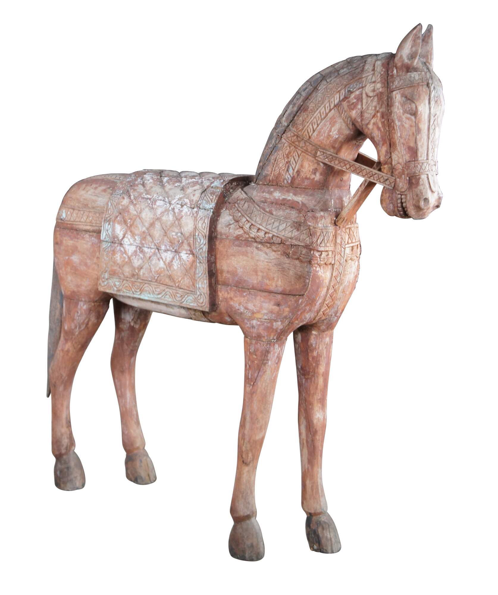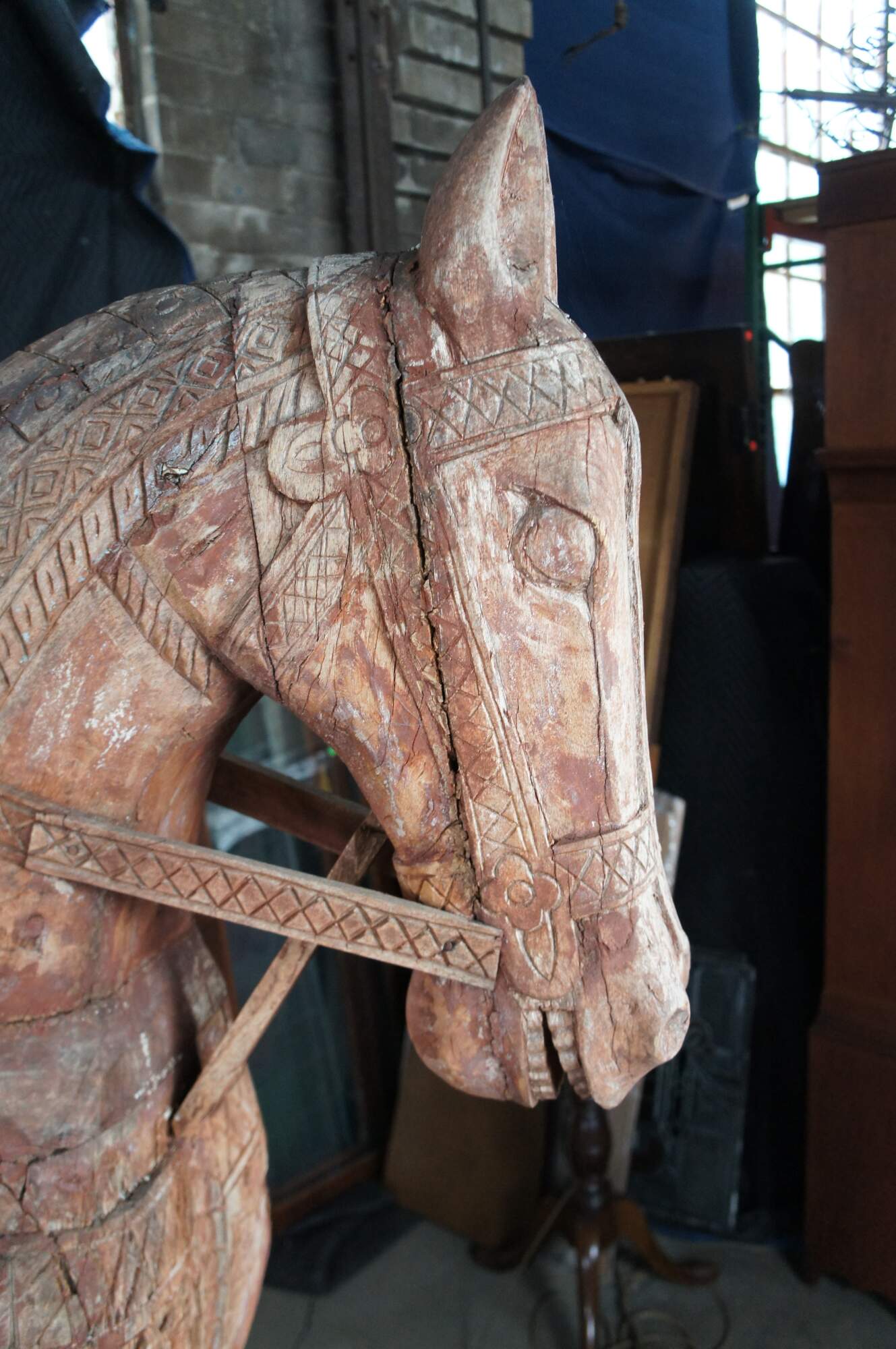 Very impressive pair of vintage lifesize horse sculptures or statues. Made of wood featuring a primitive / rustic asian design. Very heavy and sturdy.