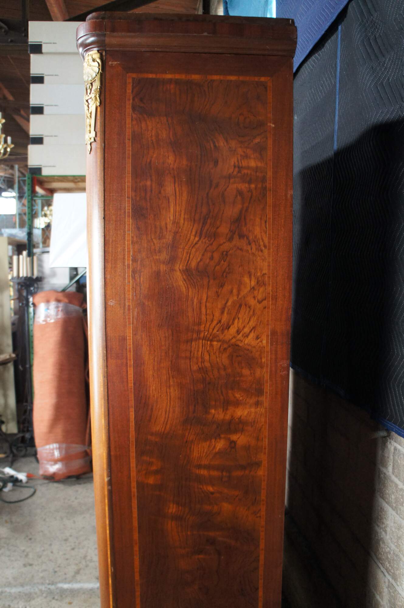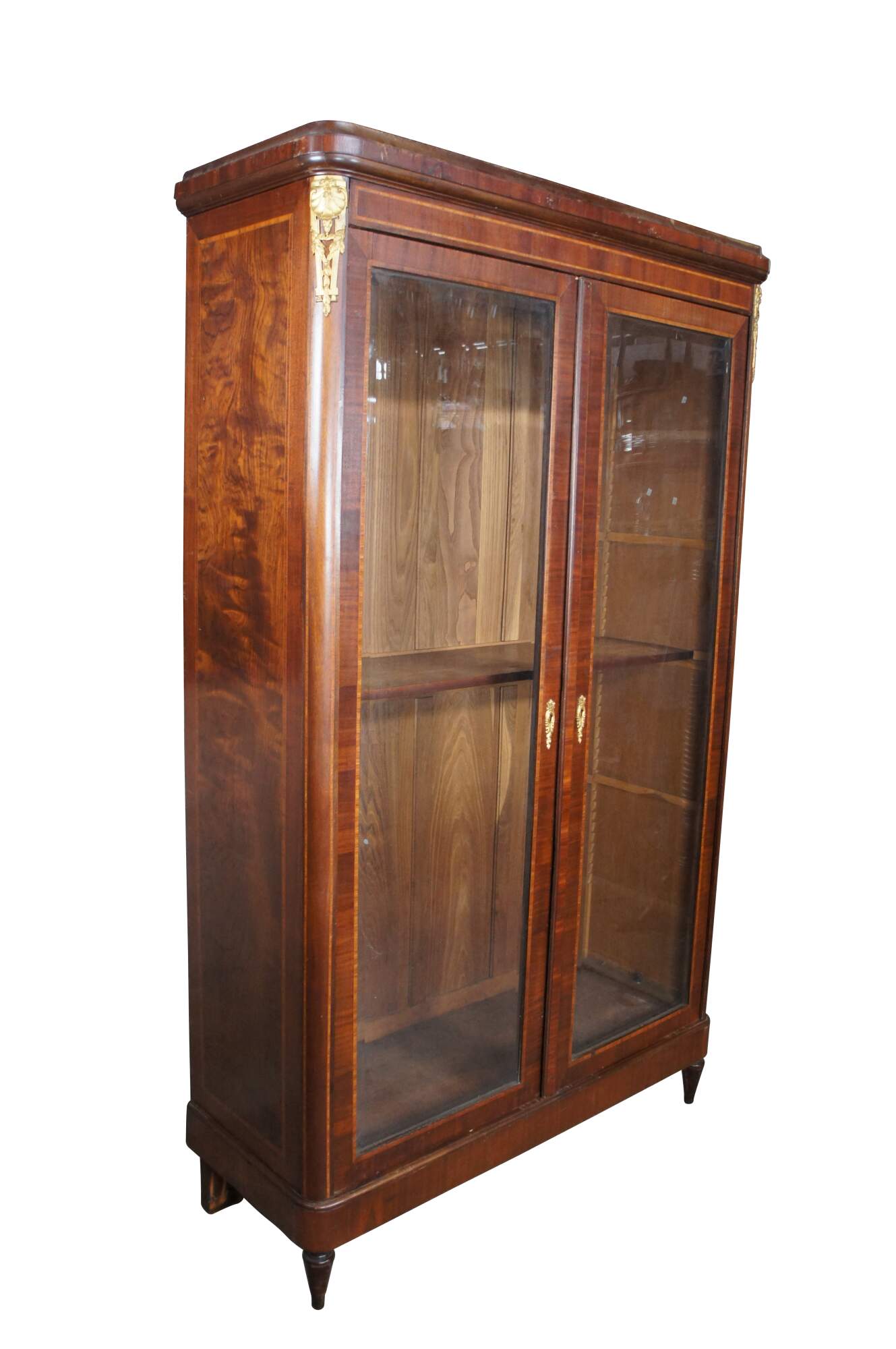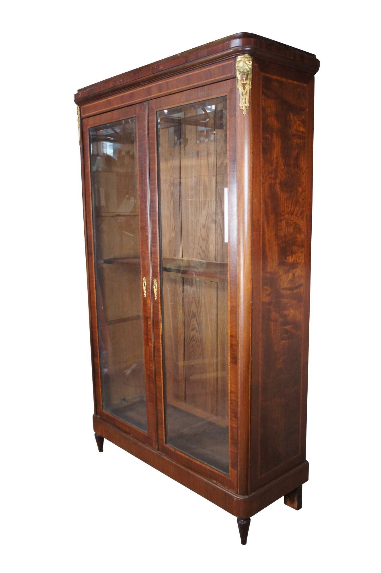 A very large and impressive antique French Renaissance Revival knockdown bookcase / showcase / curio display cabinet / or linen press. Made of flame mahogany featuring gilt ormalu mounts, inlaid cross banding, large beveled glass doors and tapered feet.
