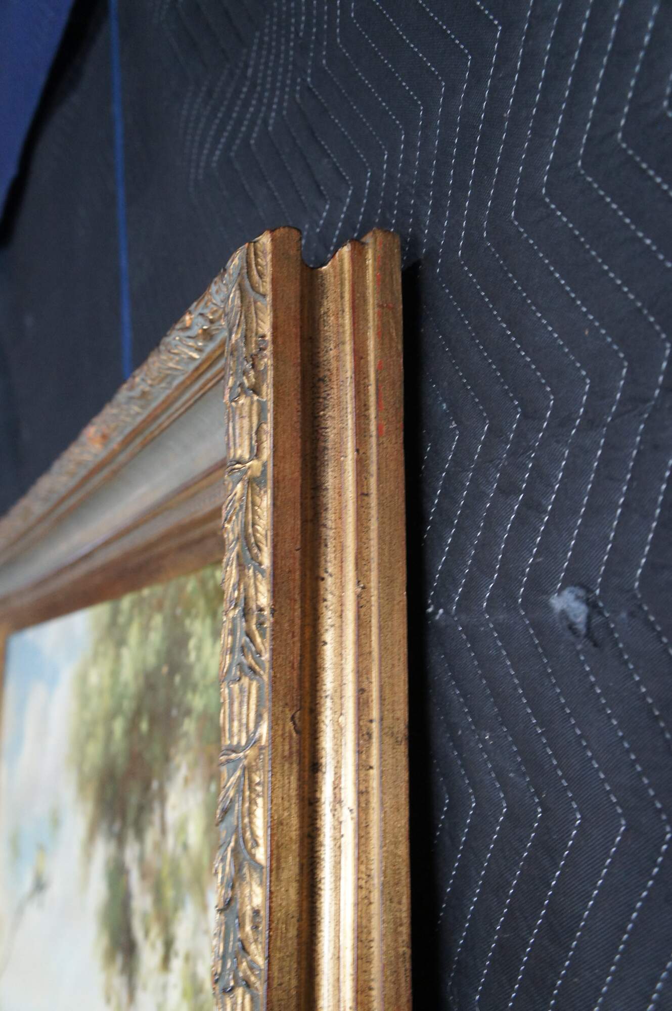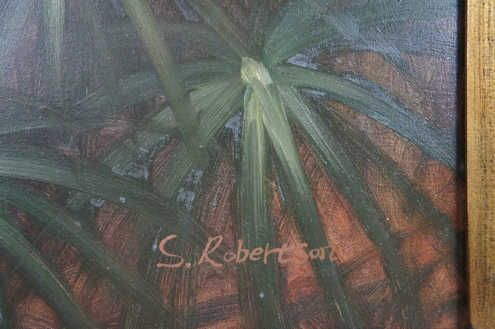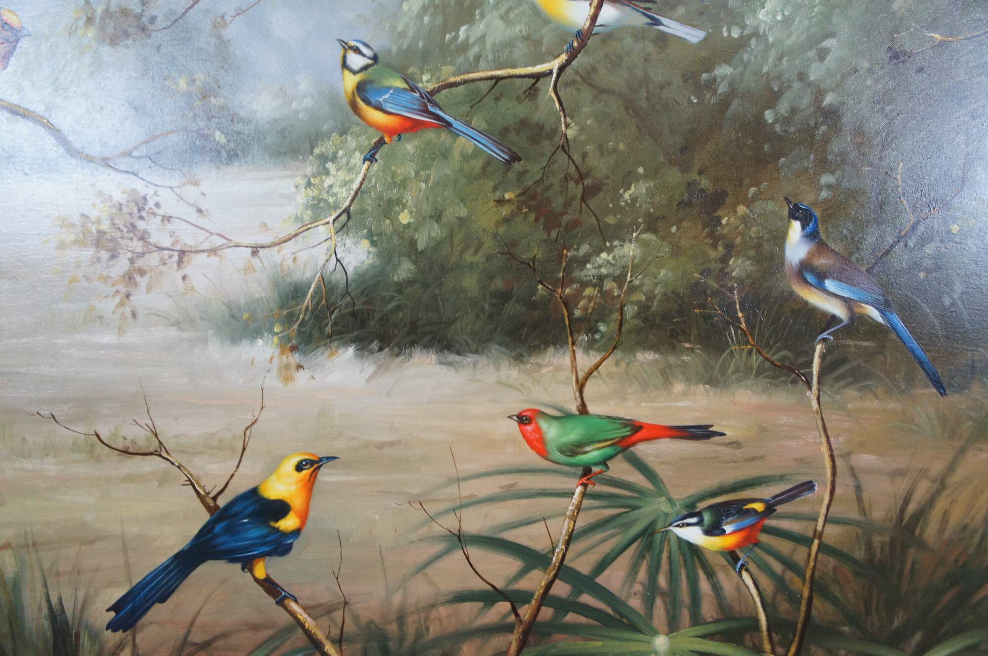 A large and impressive oil painting showcasing tropical birds perched on trees in a woodland setting lakeside. The painting is signed lower left by S. Robertson and ornately framed in gold with neoclassical designs. The beautiful painting is perfectly detailed and draws a nod to natural selection through the vibrancy of each bird.
