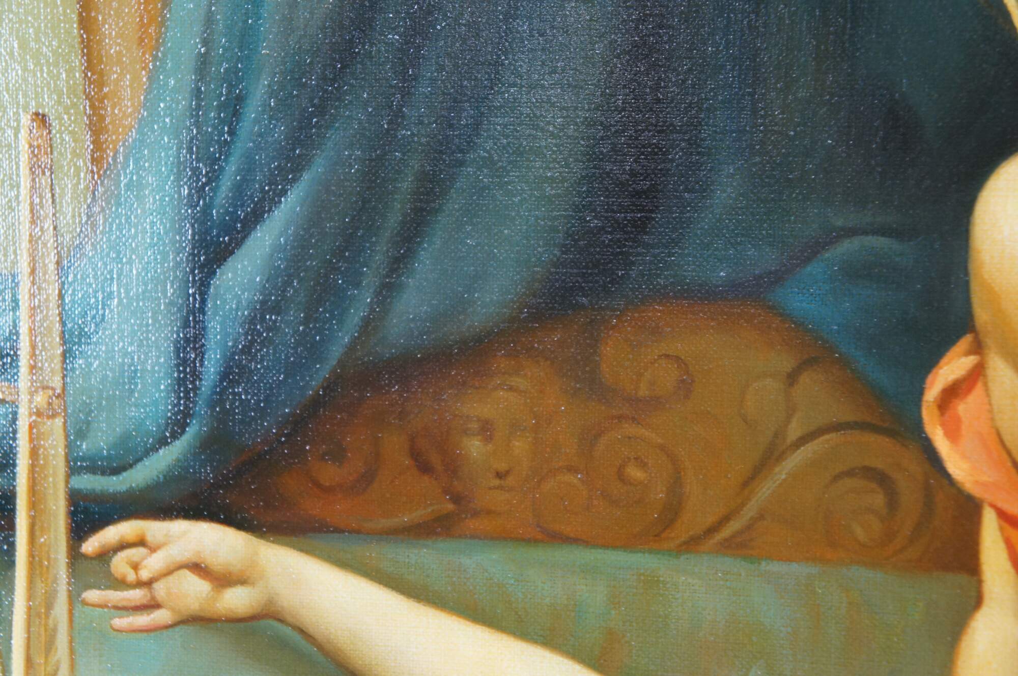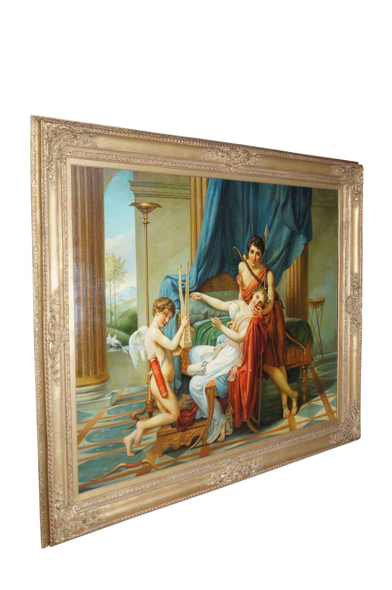 A Monumental contemporary school painting of "Sappho and Phaon" After Jacques-Louis David. The oil is on canvas and framed in gold with French relief.