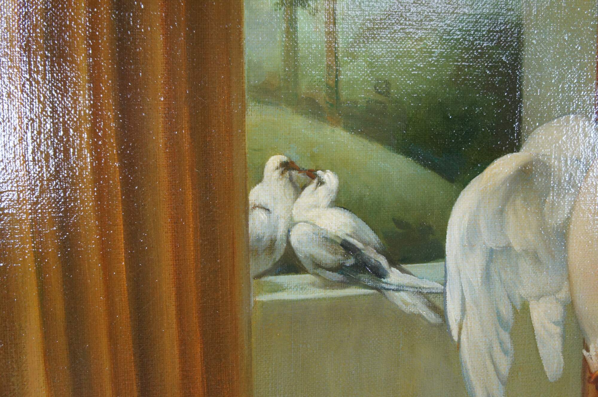 Sappho is shown sitting in a chair at the foot of a bed in a classically decorated room with columns, a marble floor and a view to a rural landscape outside (with Venus's birds, doves, sitting on the doorstep). Phaon stands behind the chair holding a spear and bow. On her knee is a scroll with some of her verses in praise of Phaon and Cupid kneels in front of her, holding up her lyre, which she tries to play with her right hand whilst leaning her head back to let Phaon cradle her head in his left arm.