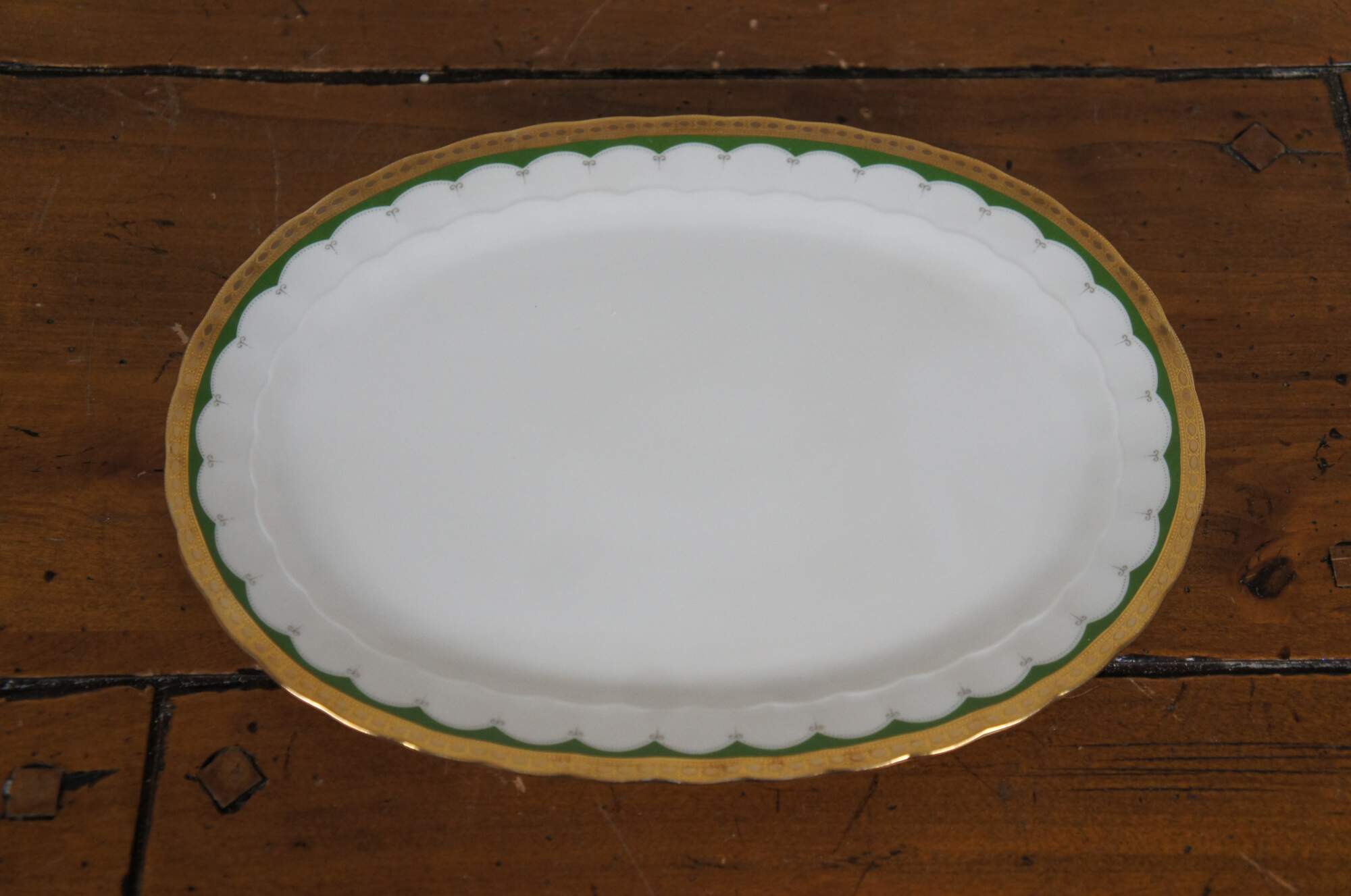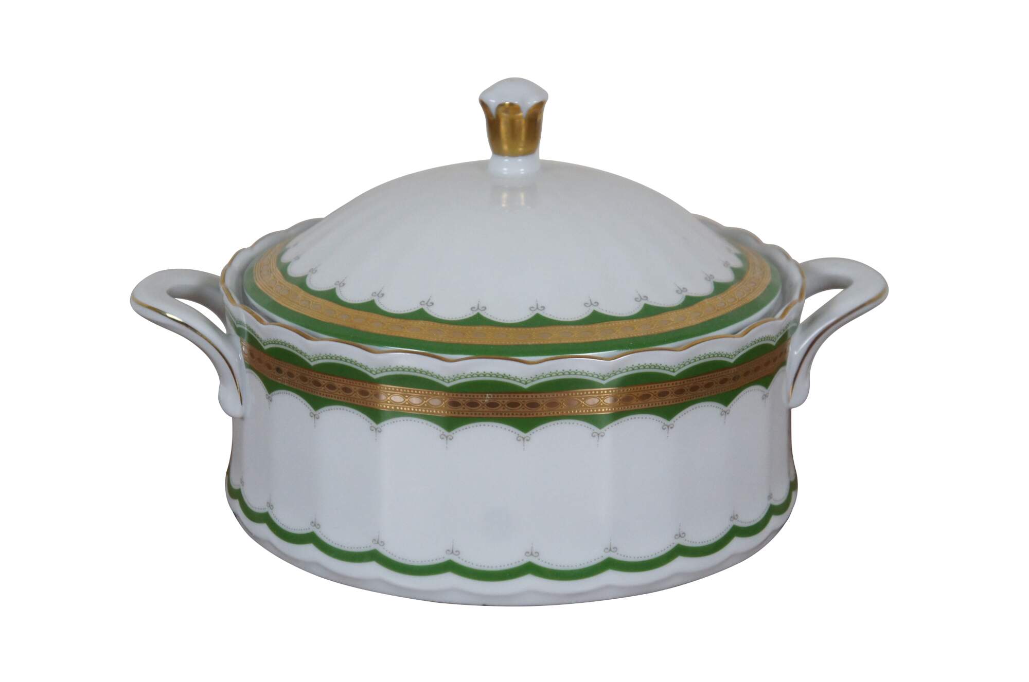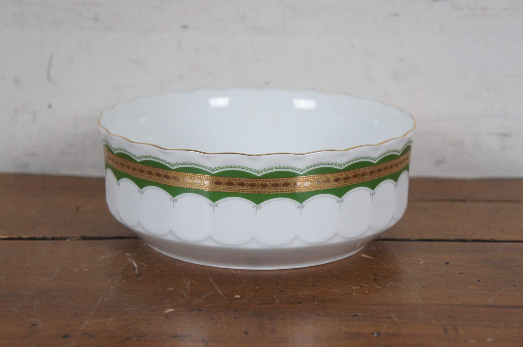 Mid to early 20th century set of Eschenbach china. Scalloped edges, decorated with a Neoclassical scalloped swag spearpoint motif in green, topped with gilt bands. Set includes: Oval Serving Platter, Round Lidded Serving Dish, Round Serving Bowl, Creamer/Gravy Boat, Under Plate, 6 Salad Plates, 6 Bowls