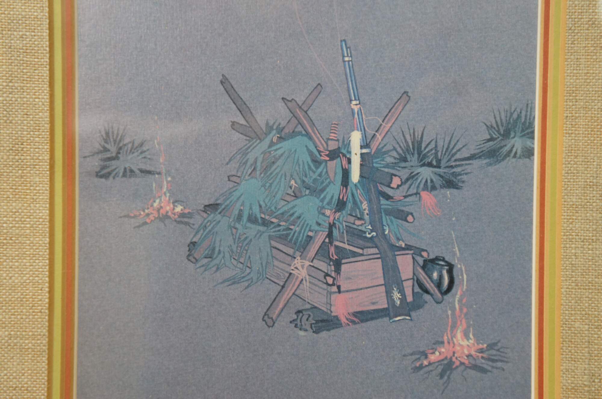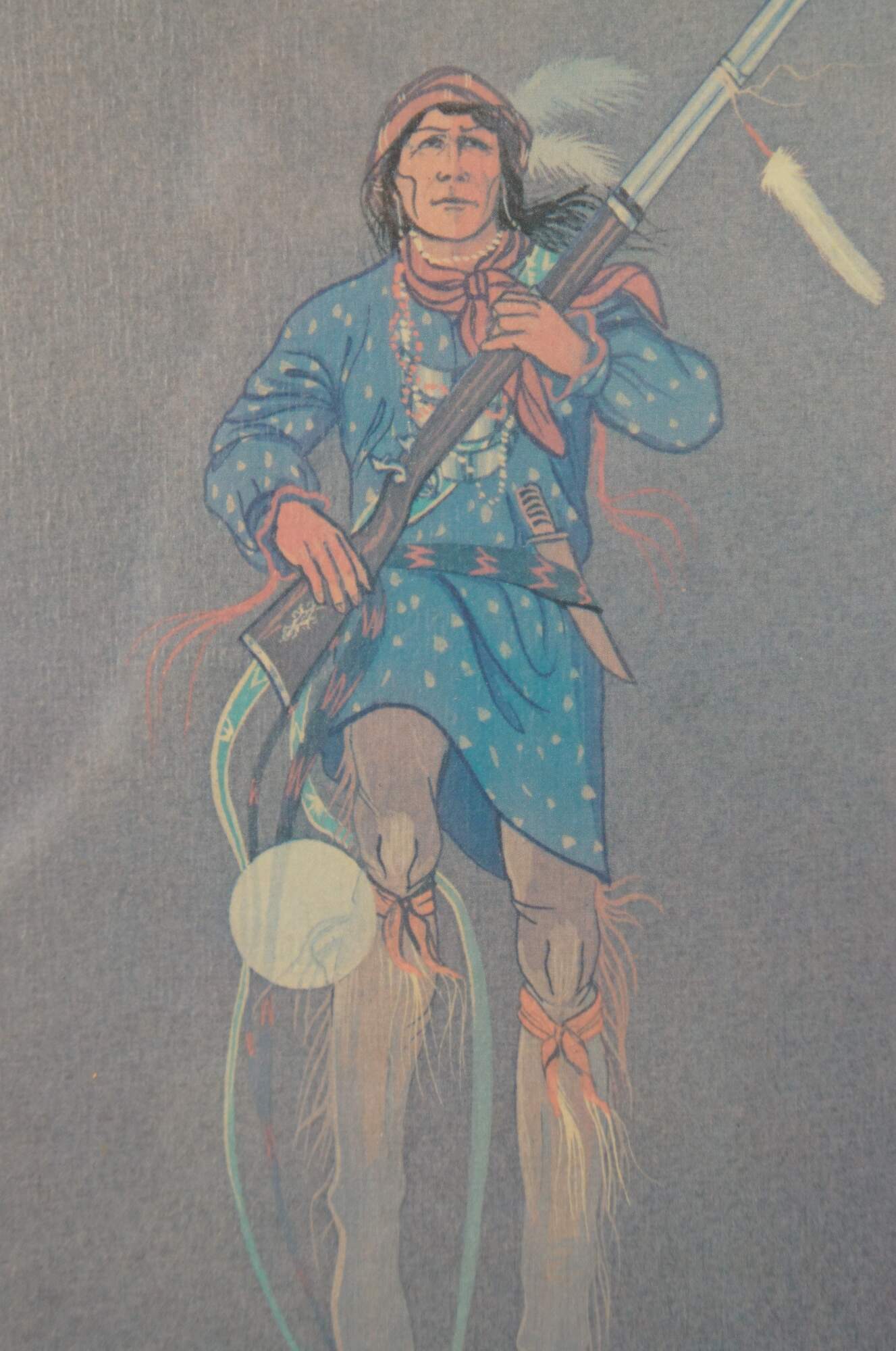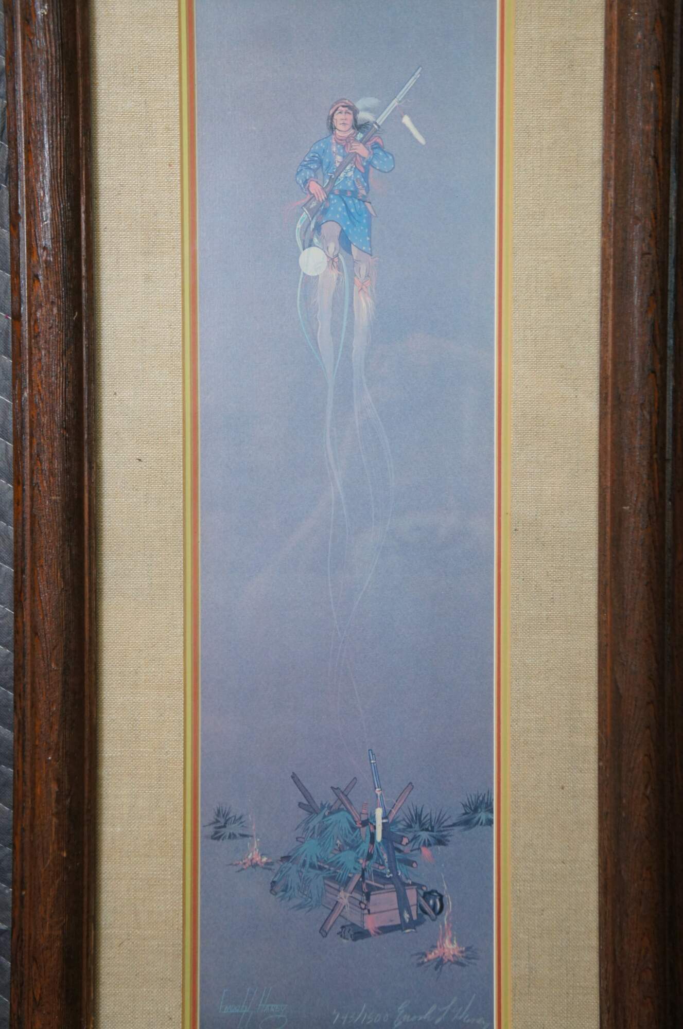 Late 20th century lithograph print of "Spirit of Oscela" by Enoch Kelly Haney. Depicts a lone Native American man holding a rifle, floating spirit-like above a pair of campfires and brush covered crates. Pencil signed and numbered 743/1500 in lower right corner.