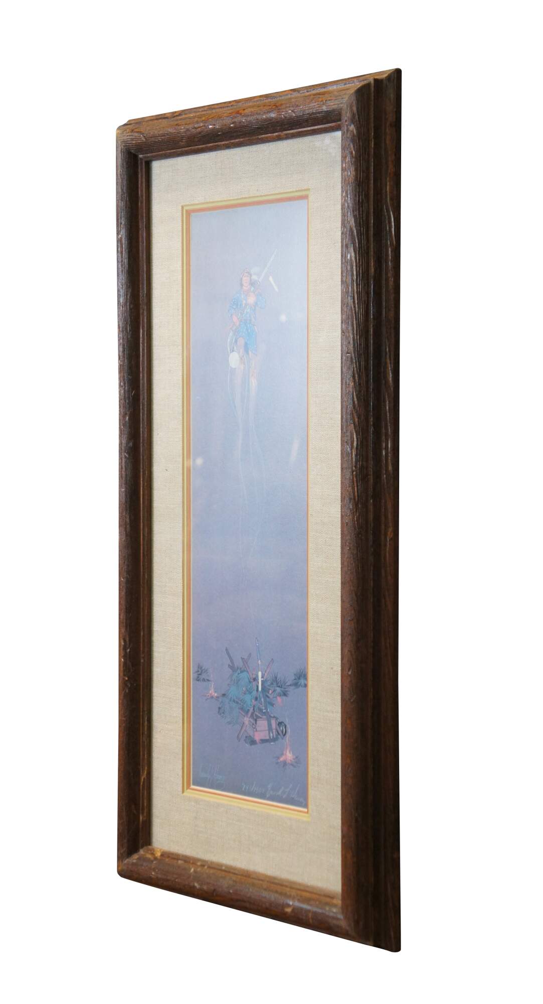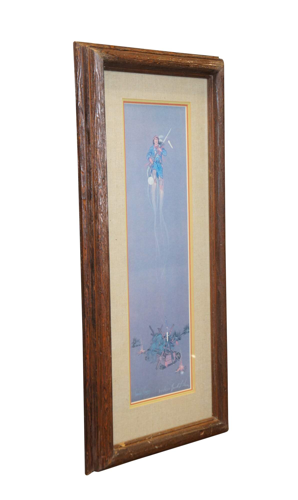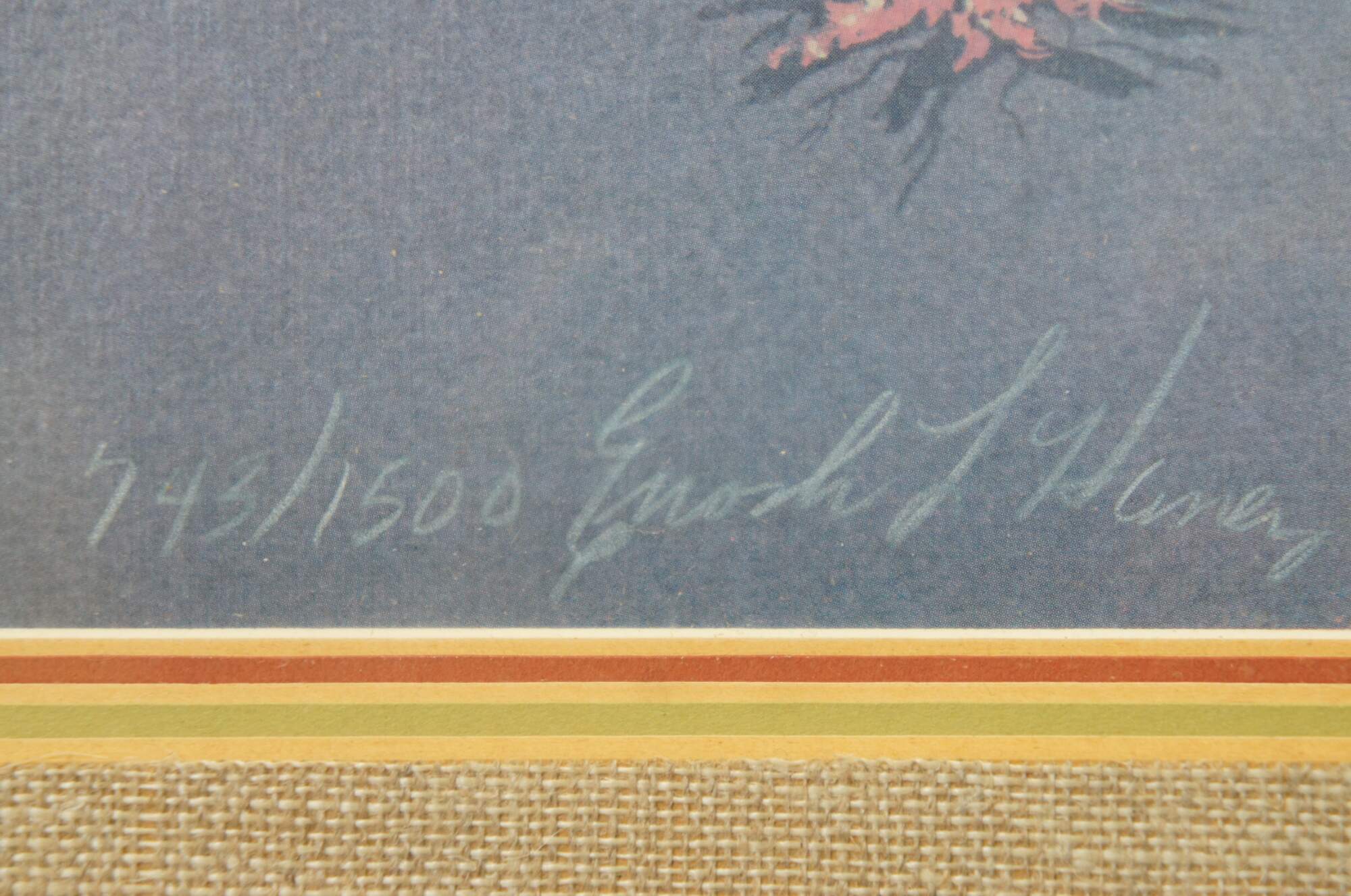 Late 20th century lithograph print of "Spirit of Oscela" by Enoch Kelly Haney. Depicts a lone Native American man holding a rifle, floating spirit-like above a pair of campfires and brush covered crates. Pencil signed and numbered 743/1500 in lower right corner.