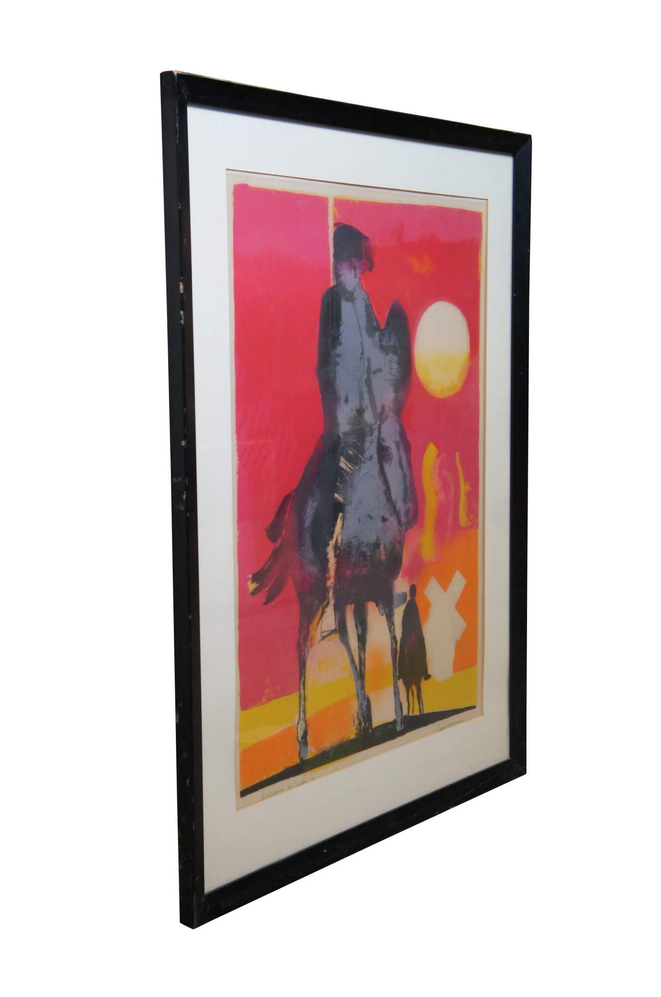 Mid to late 20th century lithograph print by Paul Guiramand, depicting Don Quixote (Quichotte) on his horse through the sunset, followed by his companion Sancho Panza and a windmill in the background. Pencil signed along bottom edge. Black beveled wood frame; white mat. Gault Galleries Arizona.