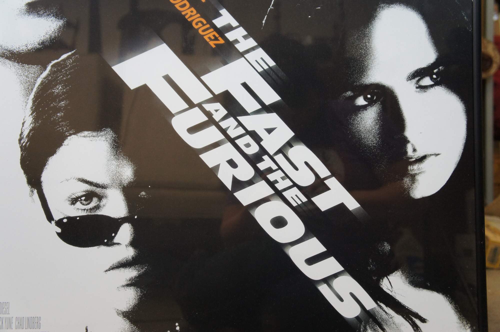 27" x 40" movie poster for the original 2001 "The Fast and the Furios" starring Paul Walker, Vin Diesel, Michelle Rodriguez, and Jordana Brewster. Rounded black metal frame.