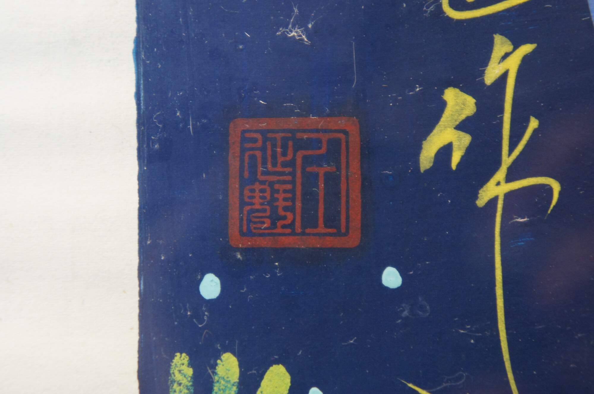 A beautiful late 20th century Chinese Chinoiserie print depicting a spiraling school of koi fish chasing a worm through a weed filled pond. Signed/seal at left side. Blue painted wood frame.