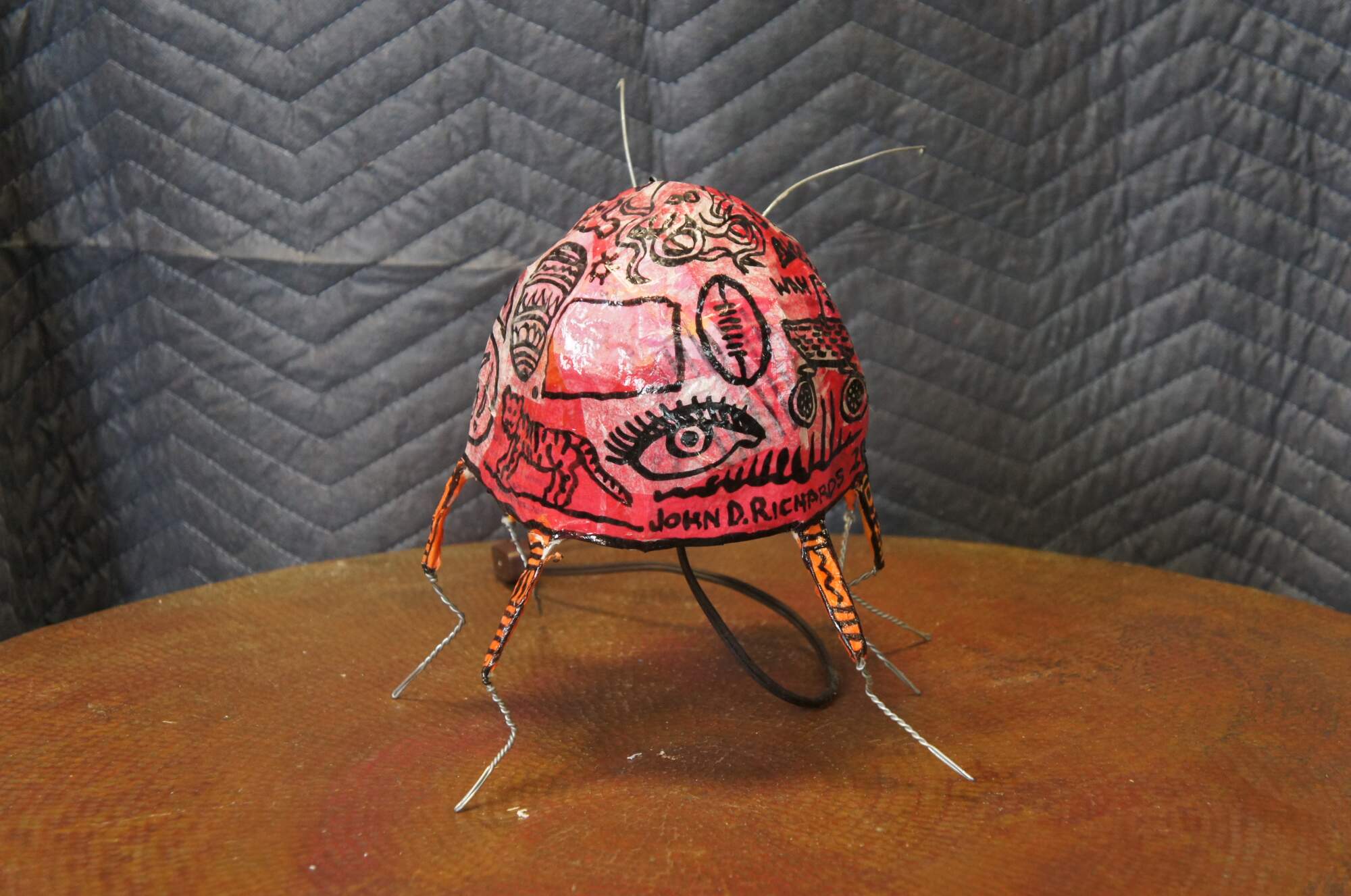 Rare vintage mixed media art nightlight in the shape of a pink and orange round backed bug covered in graffiti, crafted by John Richards of the Yummy Mud Puddle Gallery, Burnsville, North Carolina. Vinylized paper on wire frame. Signed and dated John Richards 2017 along one side of shell.