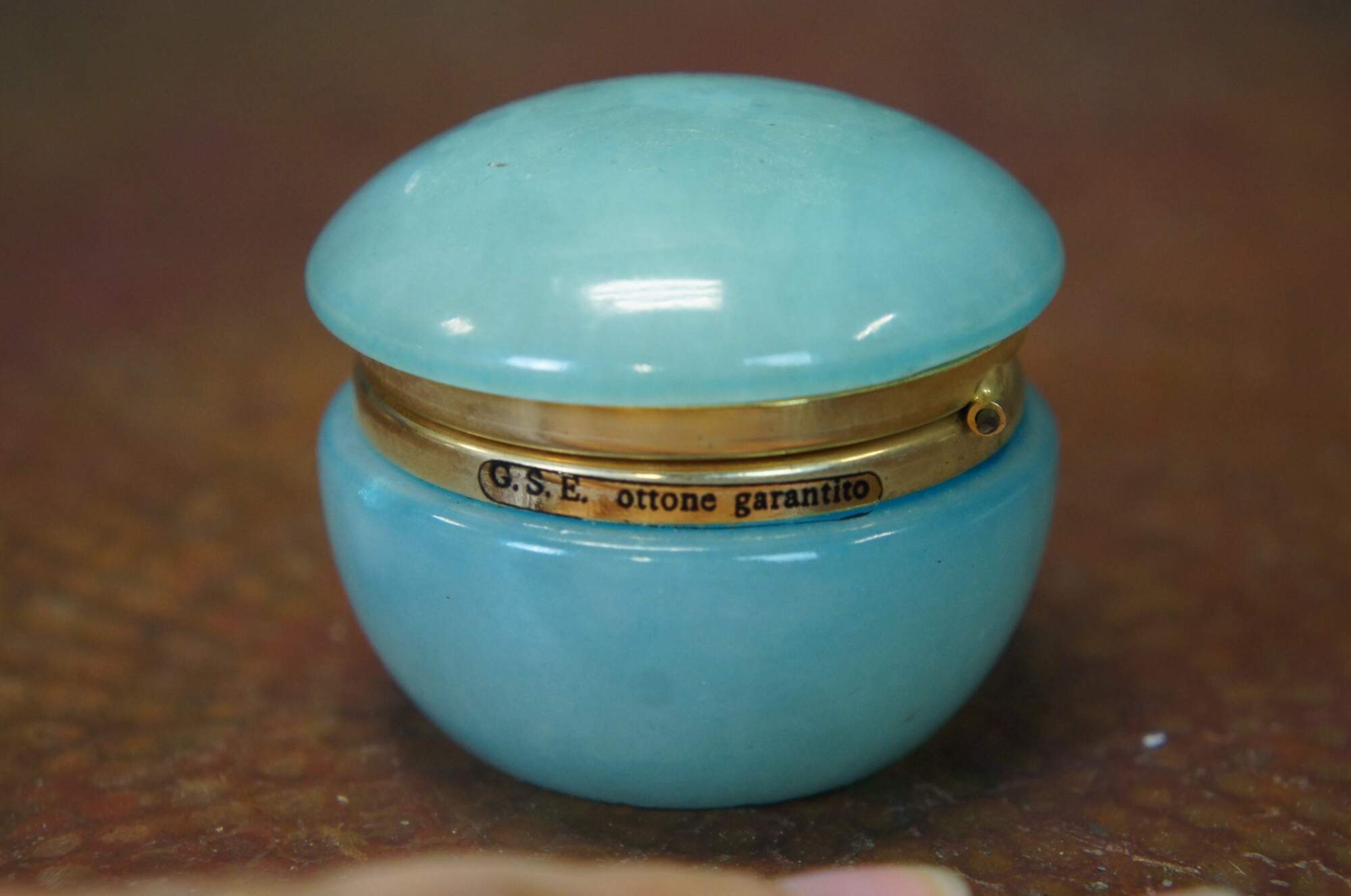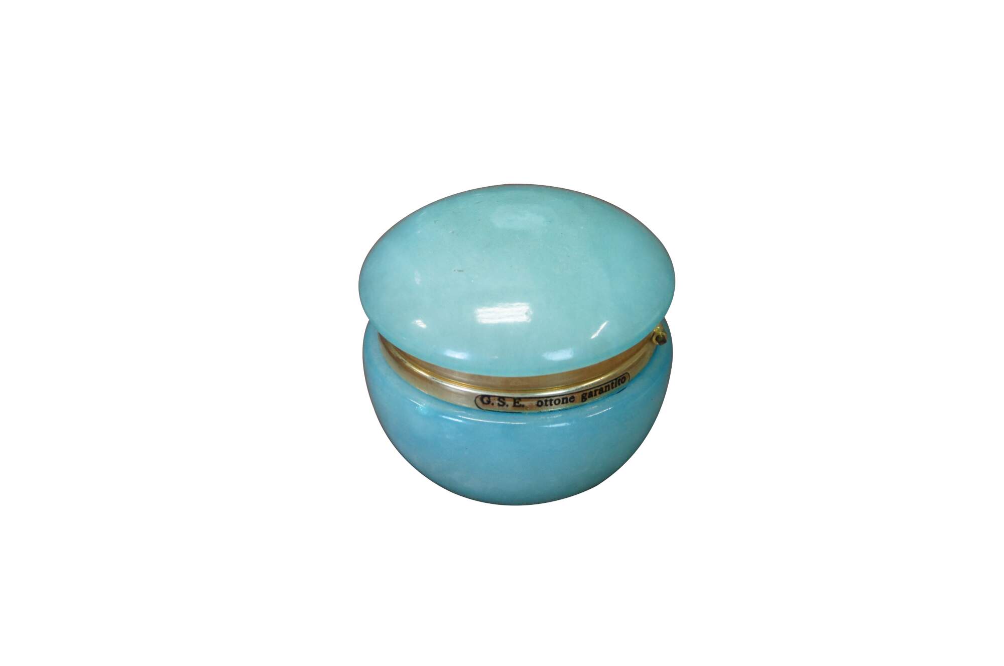 Mid to late 20th century small round trinket / keepsake / pill box carved of pale green / blue alabaster with brass rim. Marked ABF - Genuine Alabaster - Made in Italy and G.S.E. ottone garantito (Guaranteed Brass).
