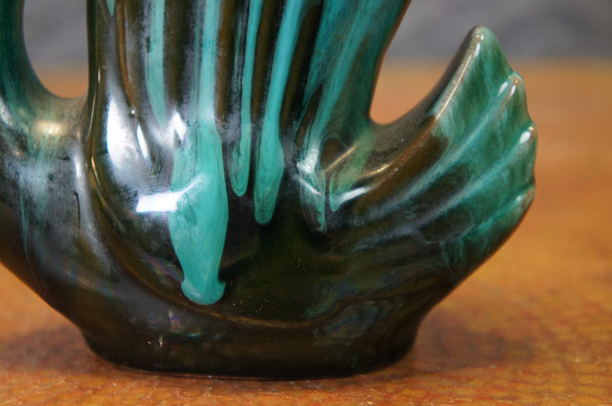 Mid to late 20th century Blue Mountain Pottery vase in the shape of a swan with raised wings, finished in a black and teal green / turquoise drip glaze. Marked on base.