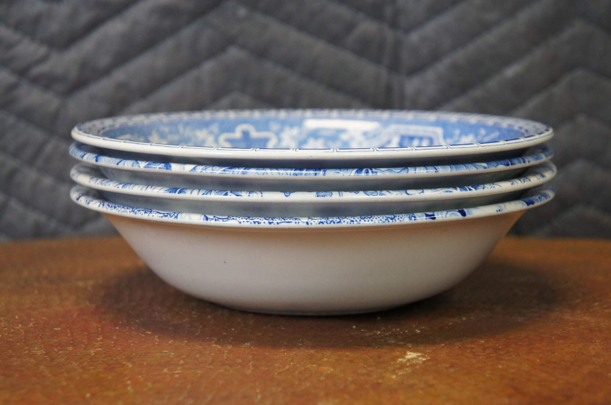 Set of four late 20th century assorted Spode Blue Room Collection pasta / cereal bowls. Designs included: Primula, Grapes, Sunflower, and Greek.