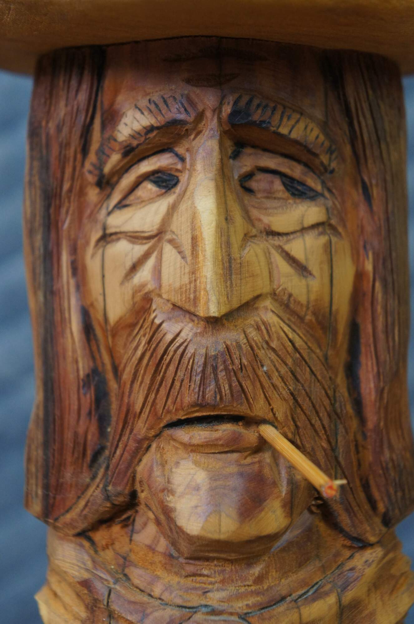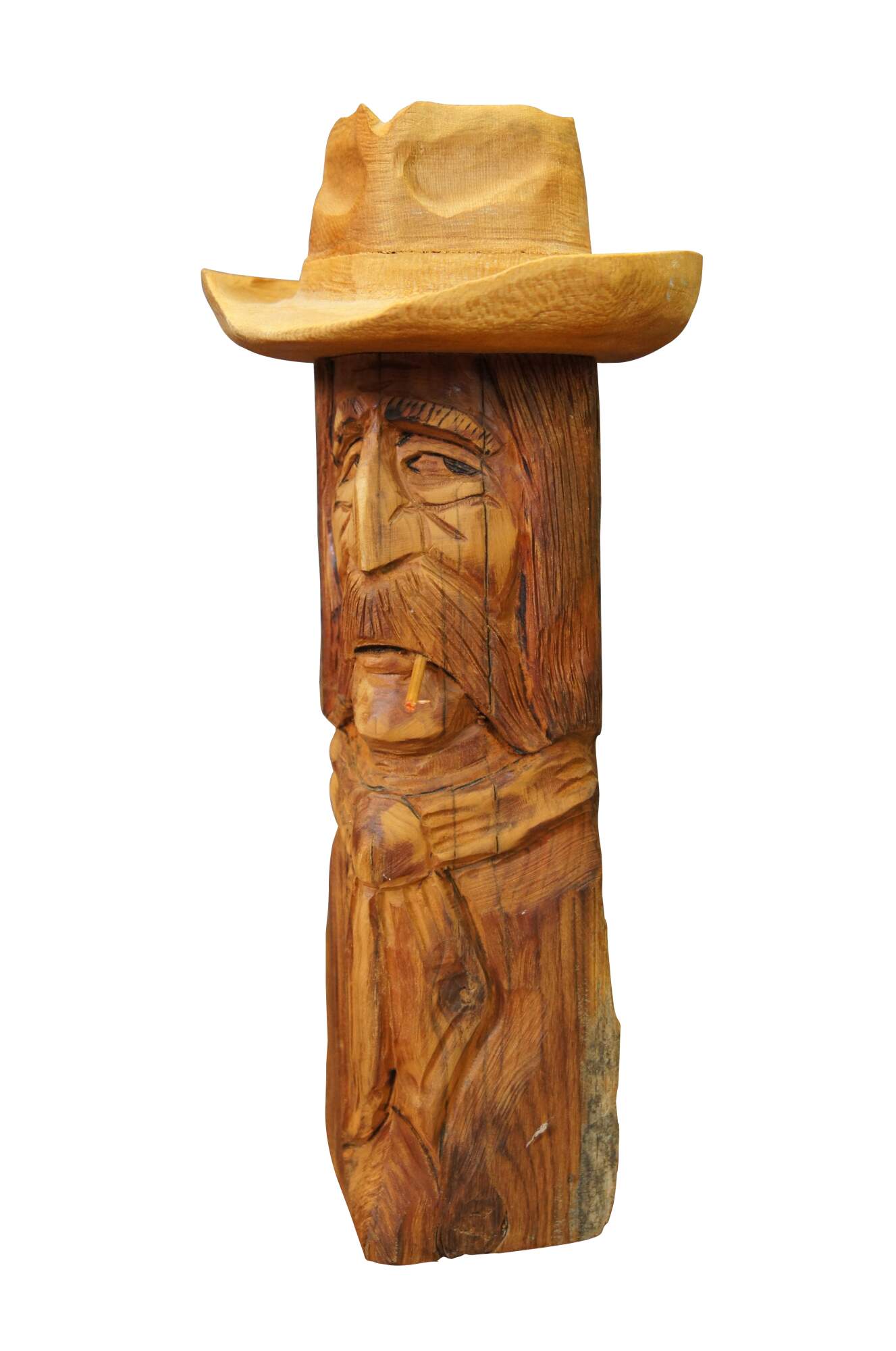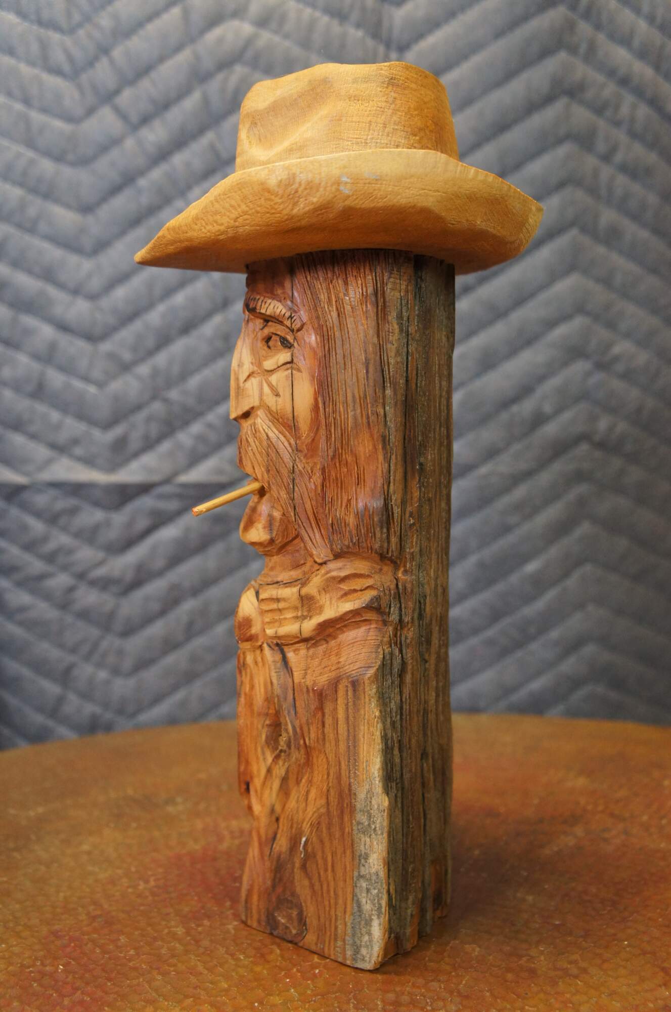 20th century hand carved folk art style wooden scupture / figurine in the shape of the bust of a cowboy. Features a craggy face with long hair and mustache, holding the stem of what was once a pipe in his mouth. He wears a neckerchief and traditional Stetson hat.