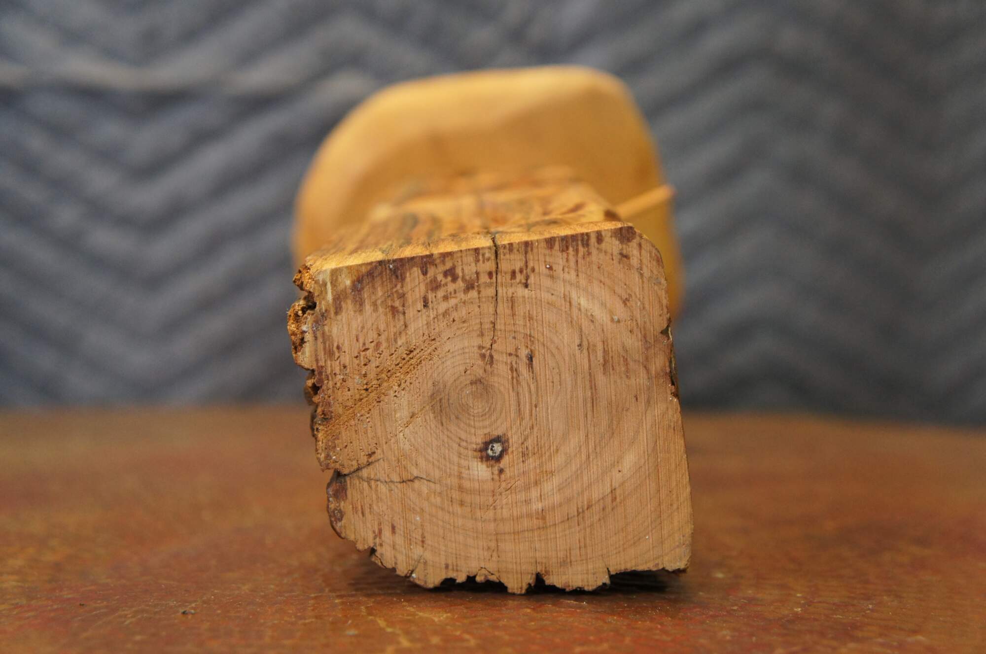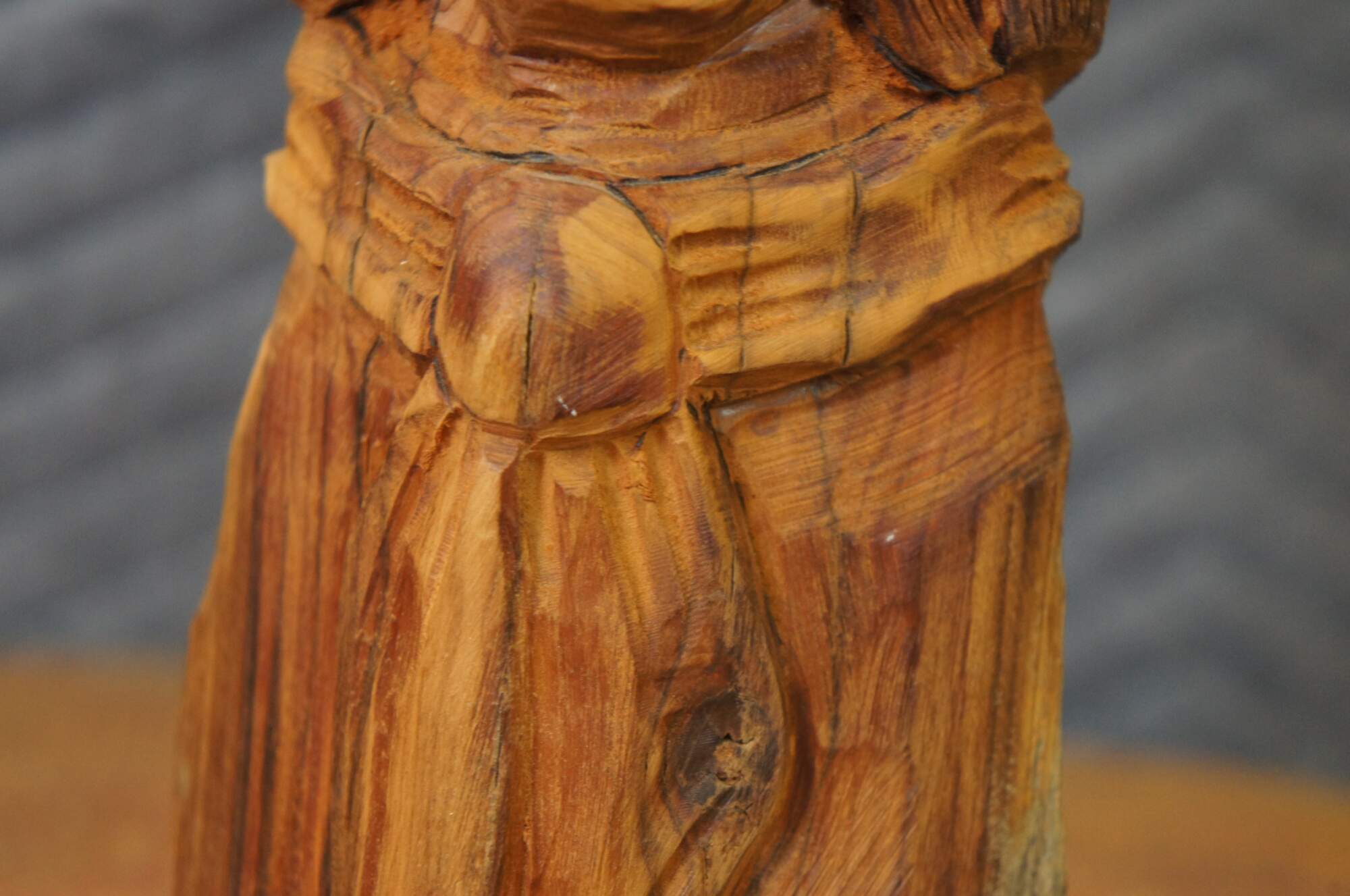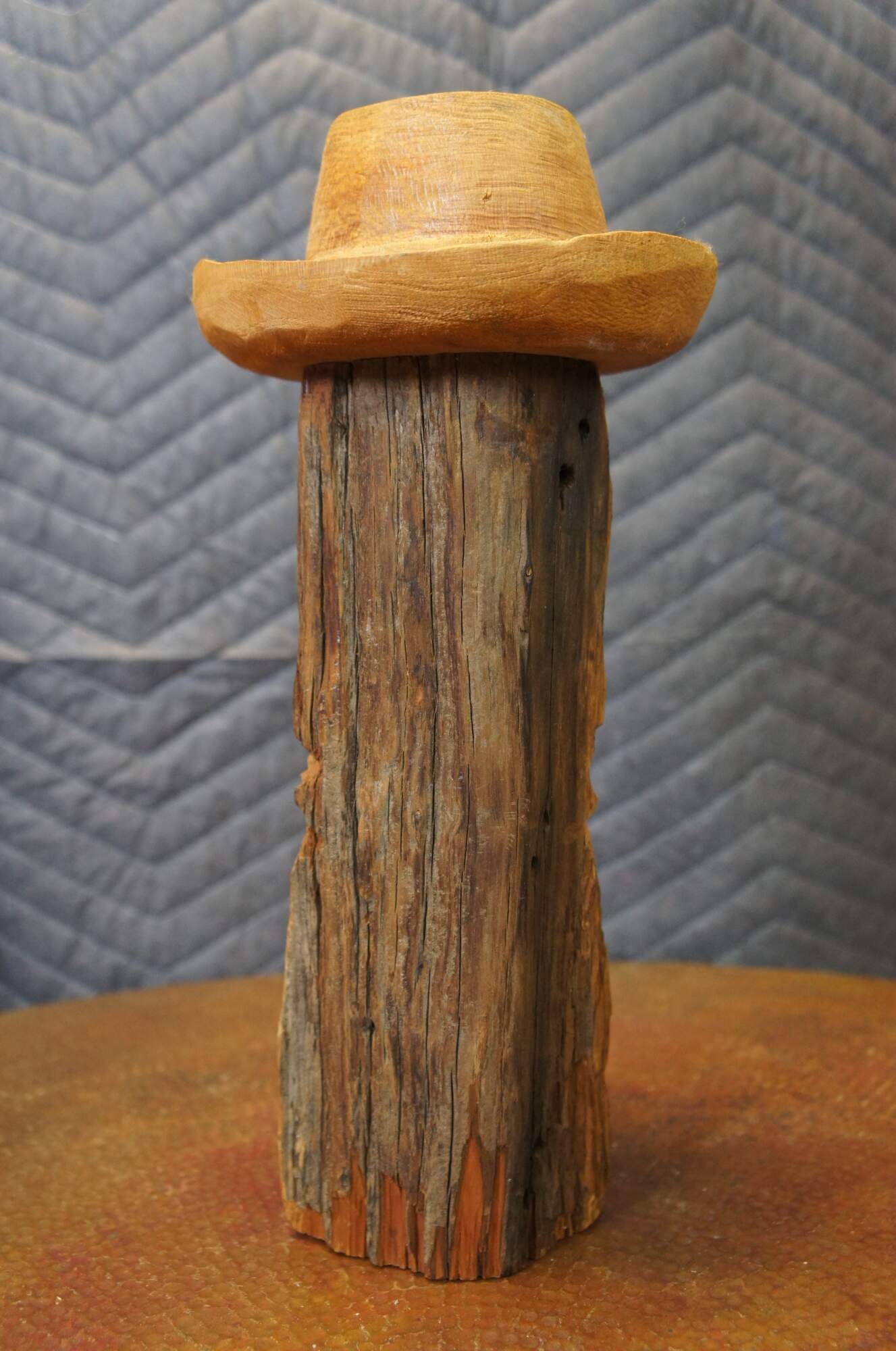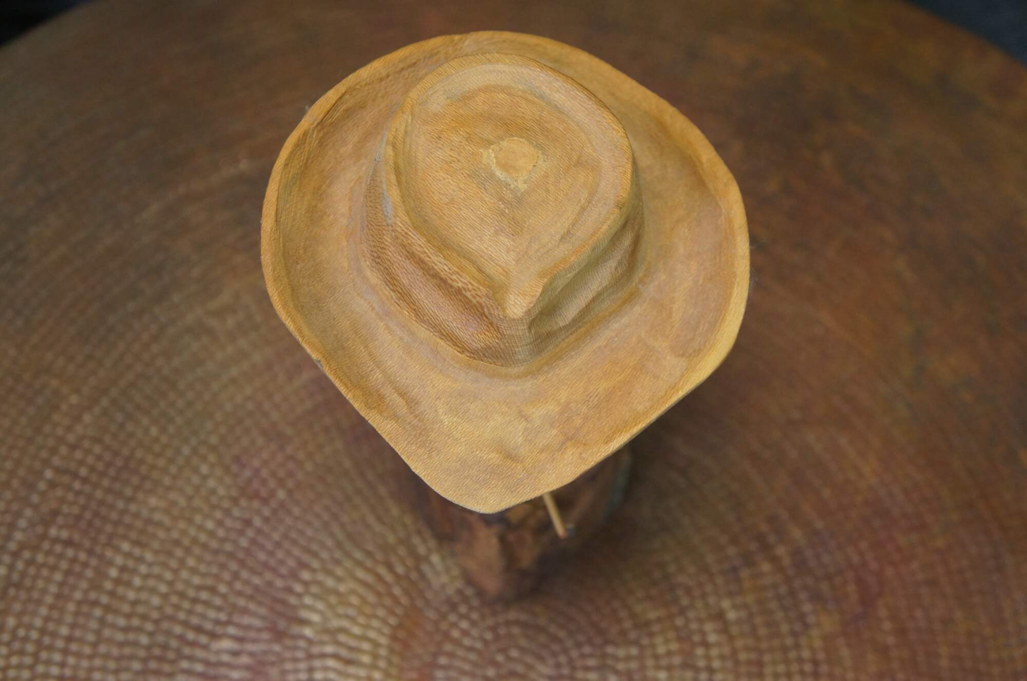 20th century hand carved folk art style wooden scupture / figurine in the shape of the bust of a cowboy. Features a craggy face with long hair and mustache, holding the stem of what was once a pipe in his mouth. He wears a neckerchief and traditional Stetson hat.